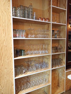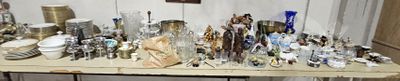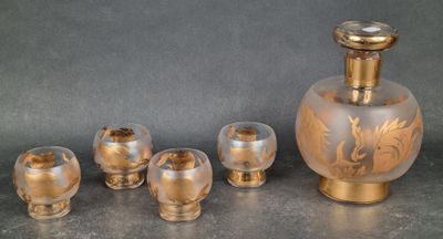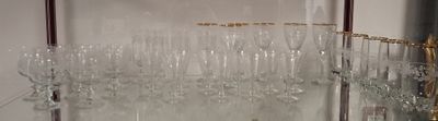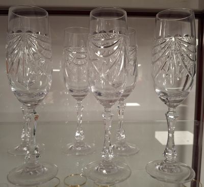 Verres, carafes et objets décoratifs en verre ou cristal taillé.