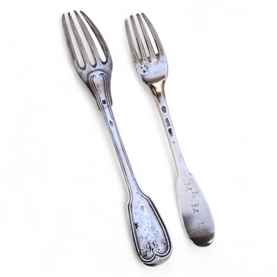 Deux FOURCHETTES en argent, différents modèles, chiffrées