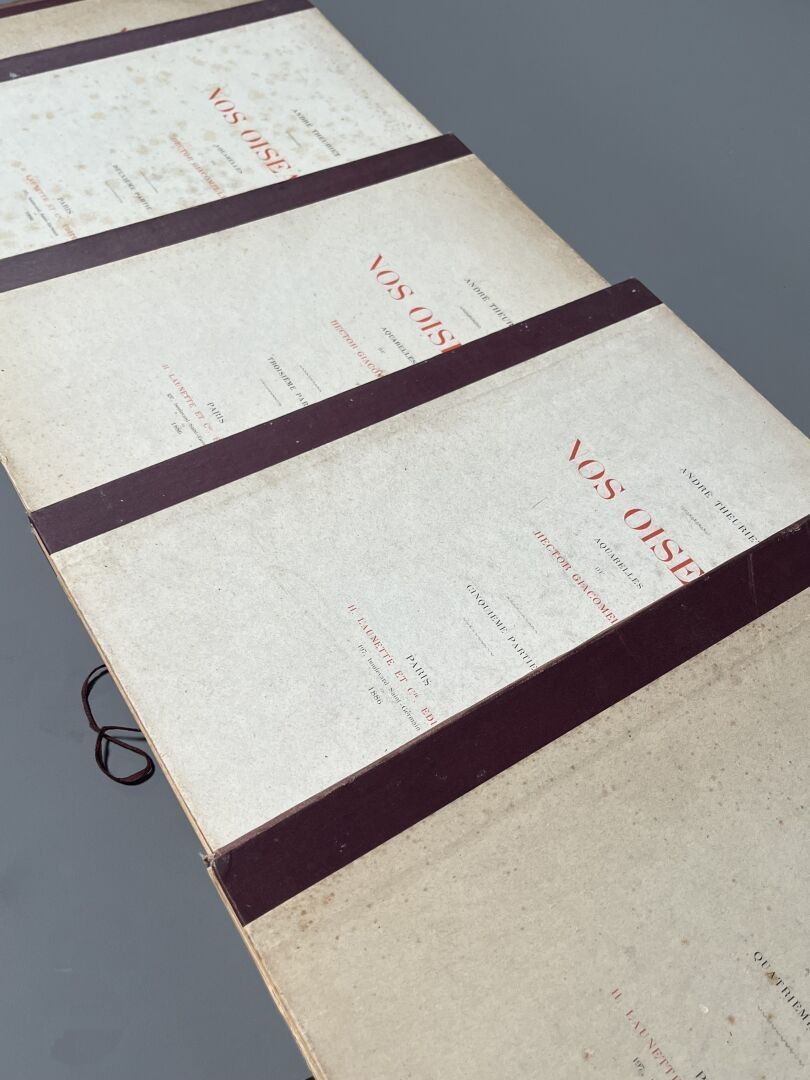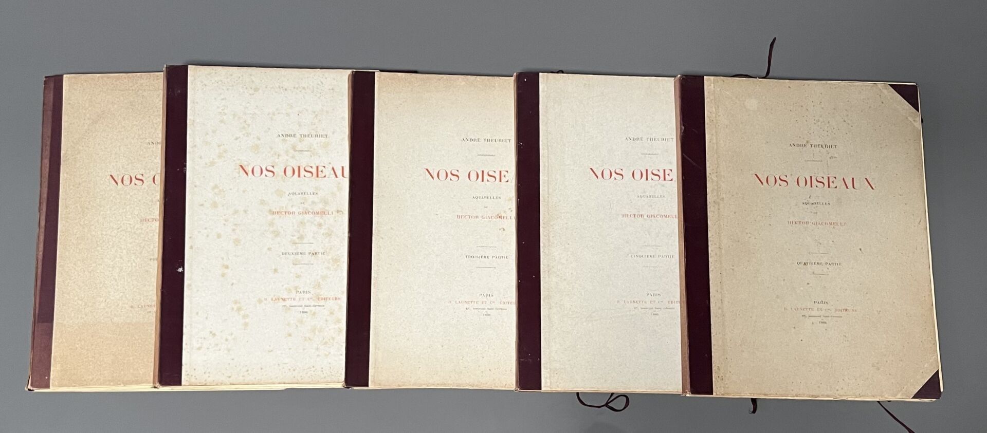 GIACOMELLI. THEURIET (André). Nos oiseaux. Paris, Launette, 1886. 5 volumes in-folio en feuilles sous portefeuilles demi-toile éditeur, XI-86 p., 20 pl., ill. (dos insolés, rouss. aux plats, lacets distendus, 1ers fx-titres brunis).
