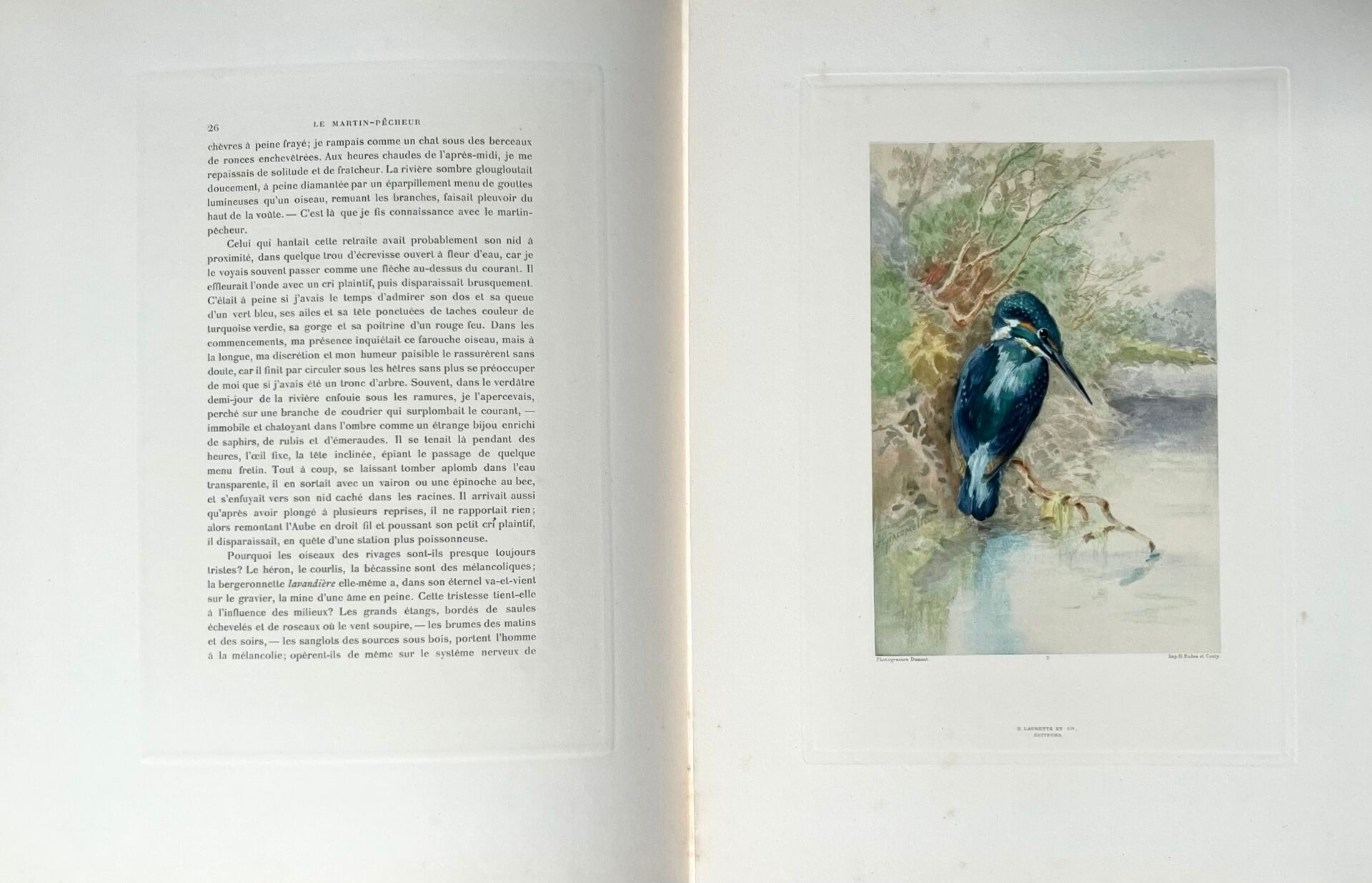Ouvrage composé de notices sur 20 oiseaux communs de France, chacune illustrée d'un encadrement de page, d'un en-tête, d'un cul-de-lampe et d'une planche, le tout en couleurs d'après les compositions de Giacomelli.
