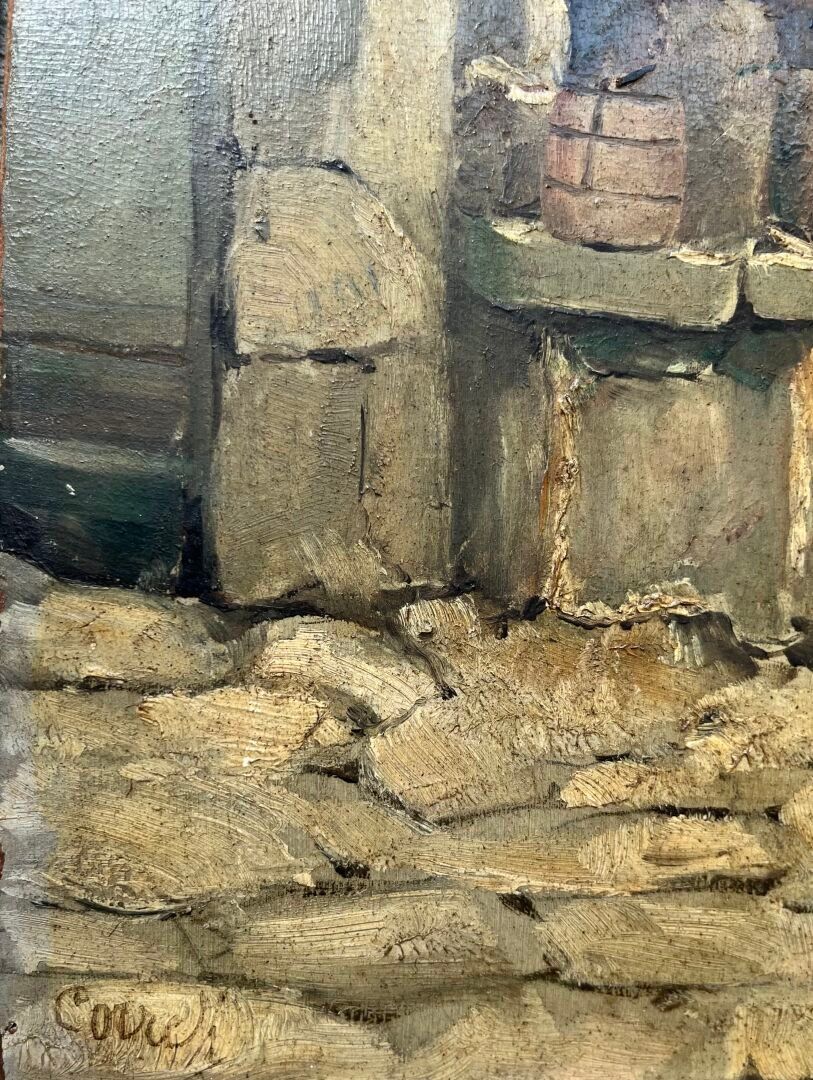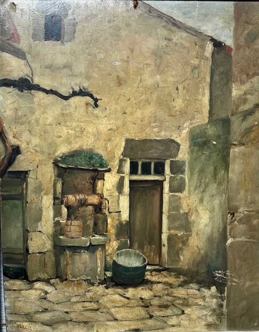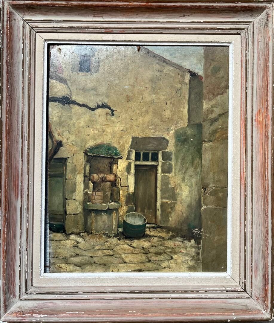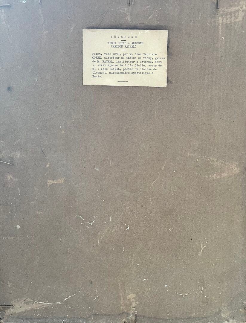 Étiquette au dos portant la mention : "Auvergne - Vieux puits à Artonne (maison Raynal) - Peint, vers 1890, par M. Jean-baptiste CORRE, directeur du Casino de Vichy, gendre de M. Raynal, instituteur à Artonne, dont il avait épousé la fille Cécile, sœur de M. l'abbé Raynal, prêtre du diocèse à Clermont, missionnaire apostolique à Paris".