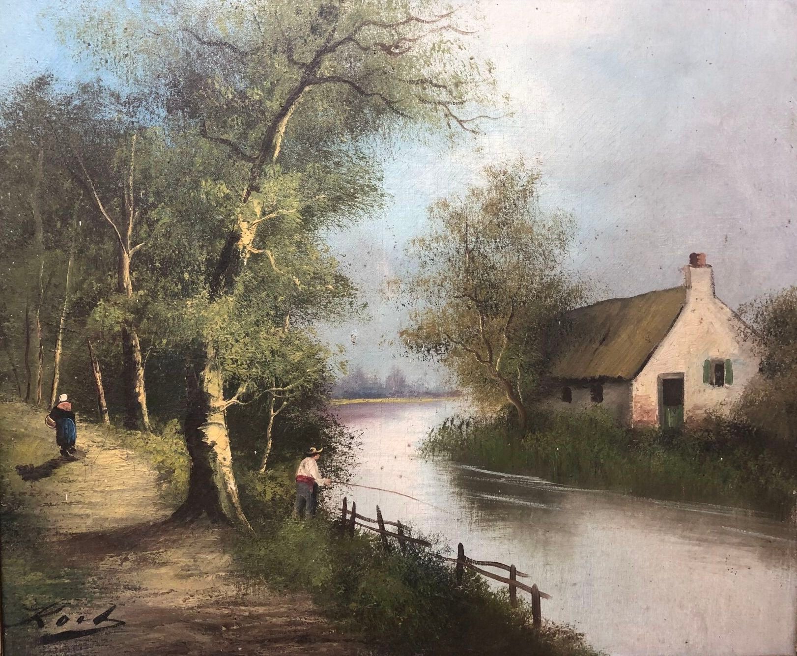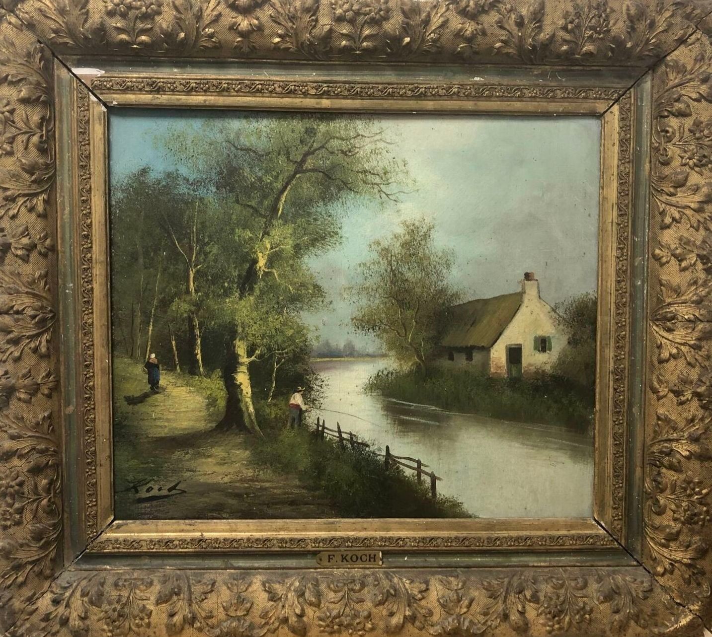 F. KOCH (?) Pêcheur et femme en bord de rivière. Huile sur toile signée en bas à gauche. 46 x 55 cm. Accidents.