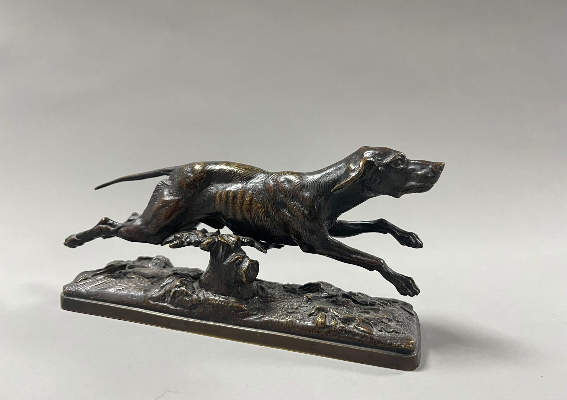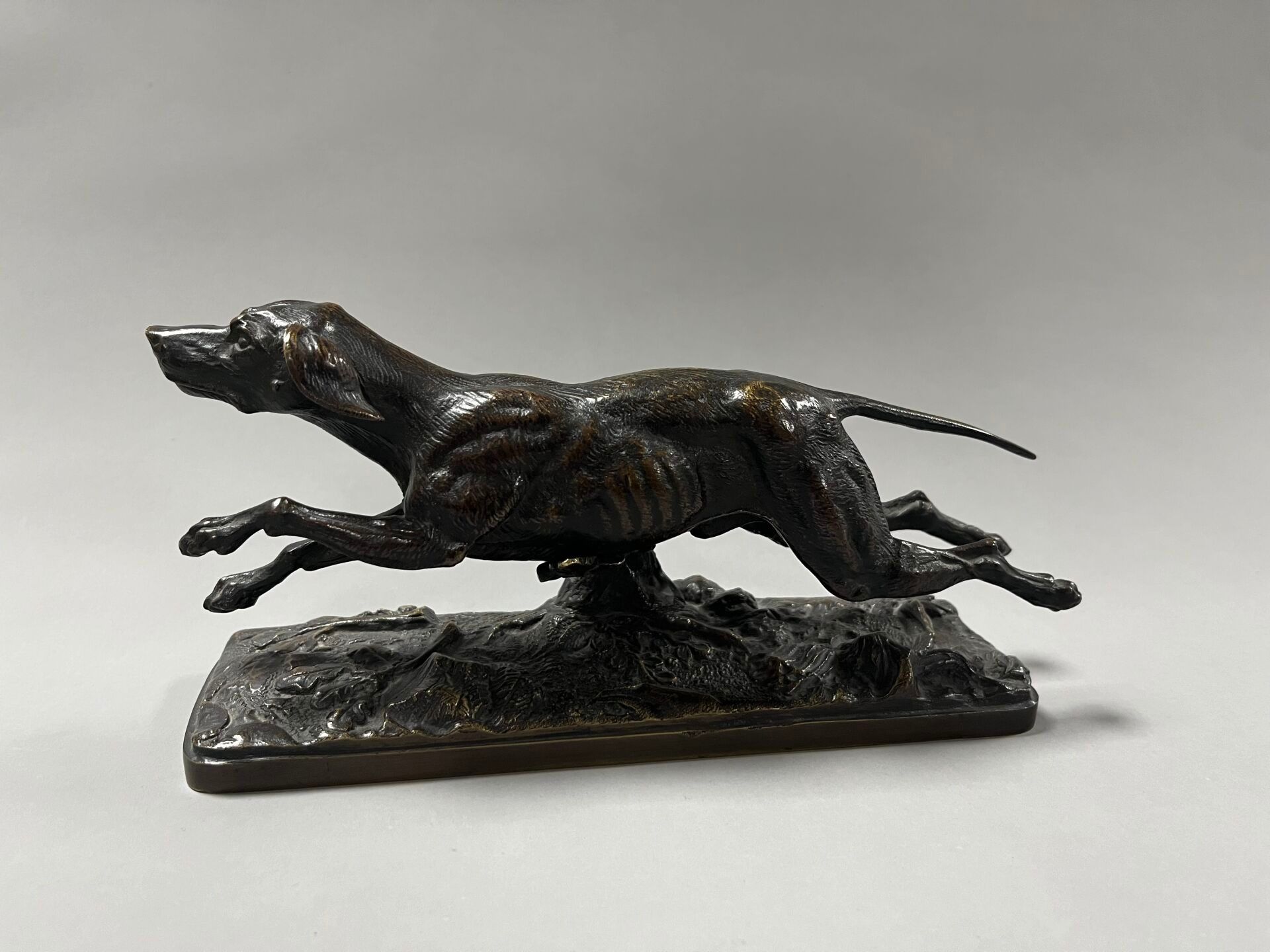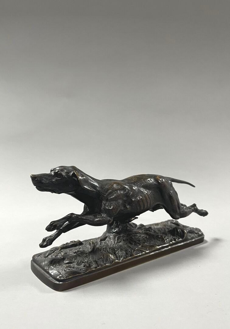 D'après Pierre-Jules MÈNE (1810-1879) Chien courant. Épreuve en bronze à patine médaille. H : 10 cm ; L : 20 cm ; P : 6 cm.