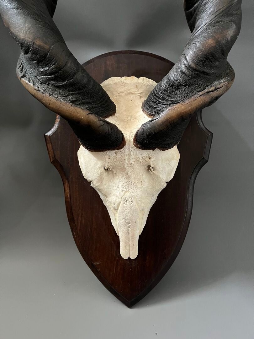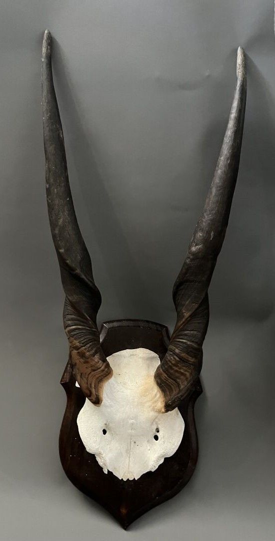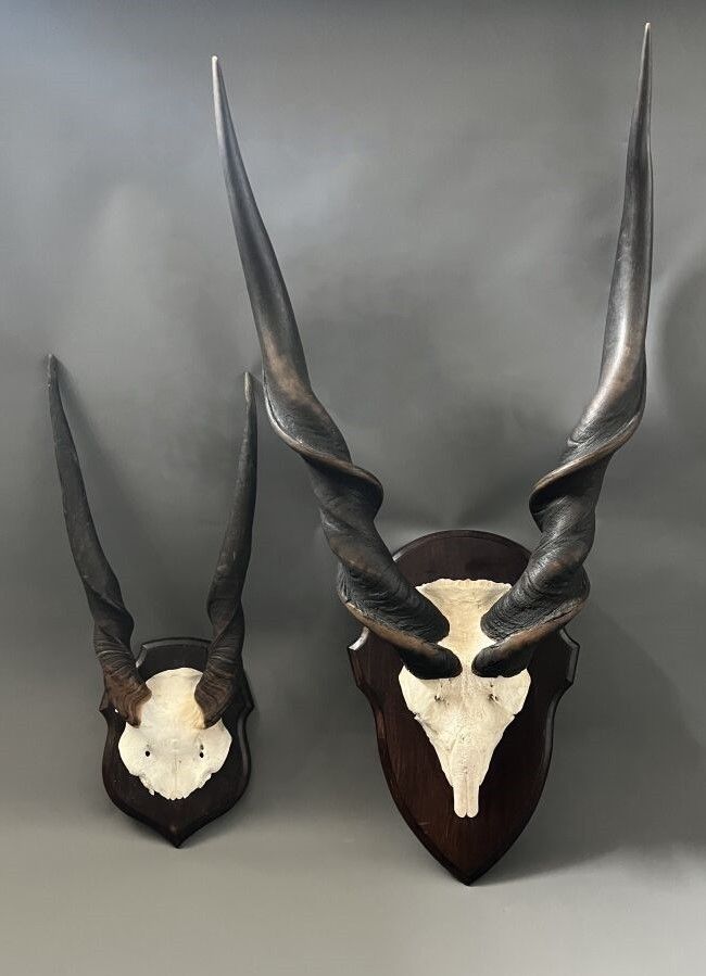 LOT de deux massacres d'élan sur écusson en bois. 81 x 31 cm et 110 x 55 cm Usure.