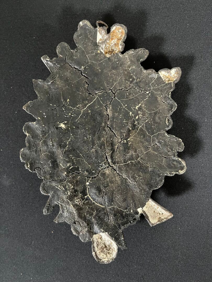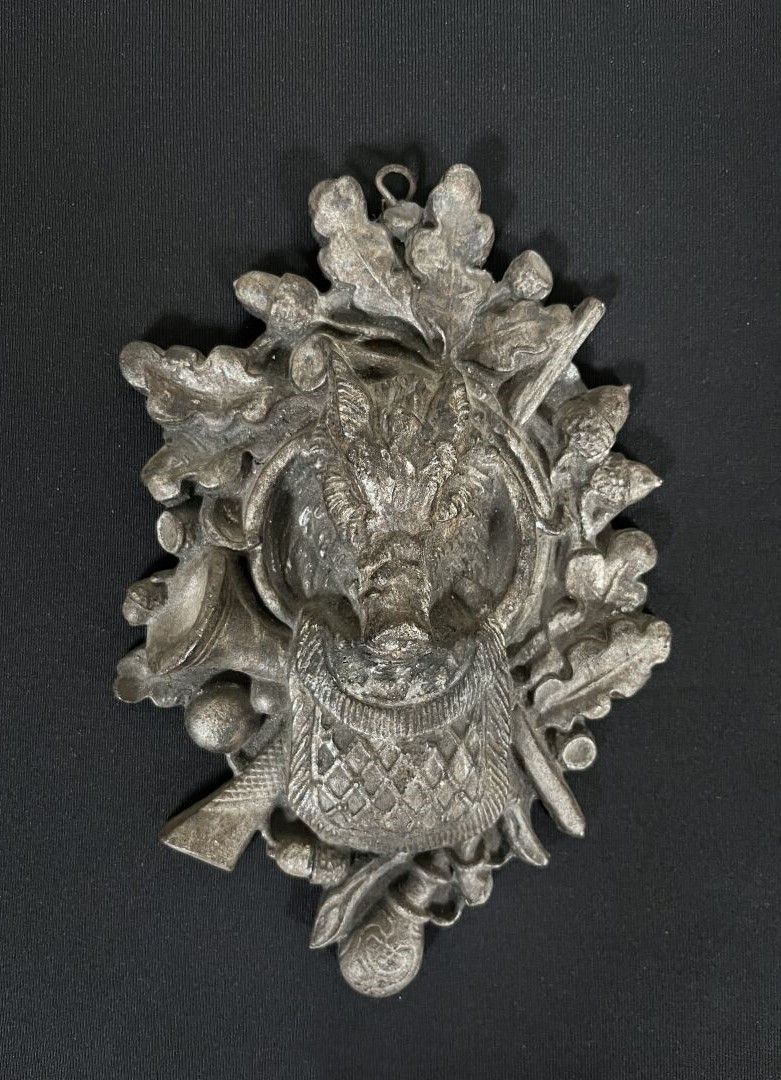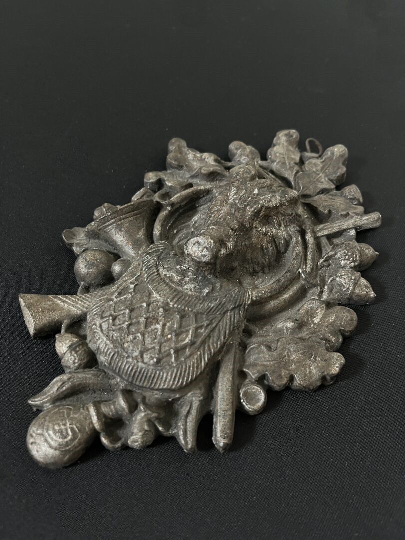 PETITE PLAQUE murale en bronze aux attributs de la chasse, le centre figurant une hure de sanglier dans une trompe de chasse et une sacoche dans un entourage de glands et de feuilles de chênes.