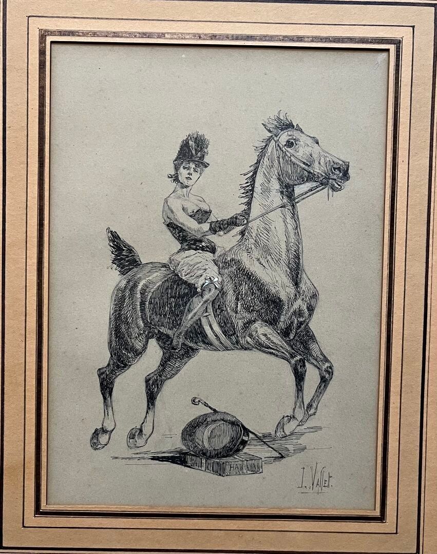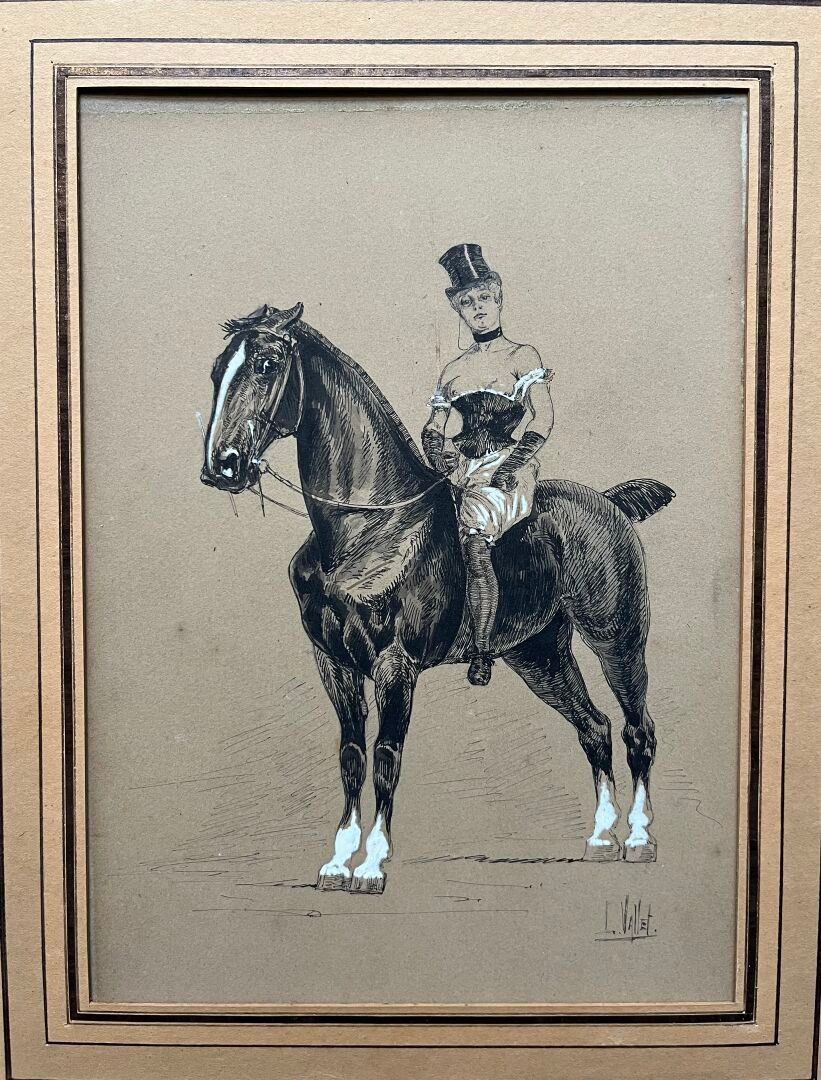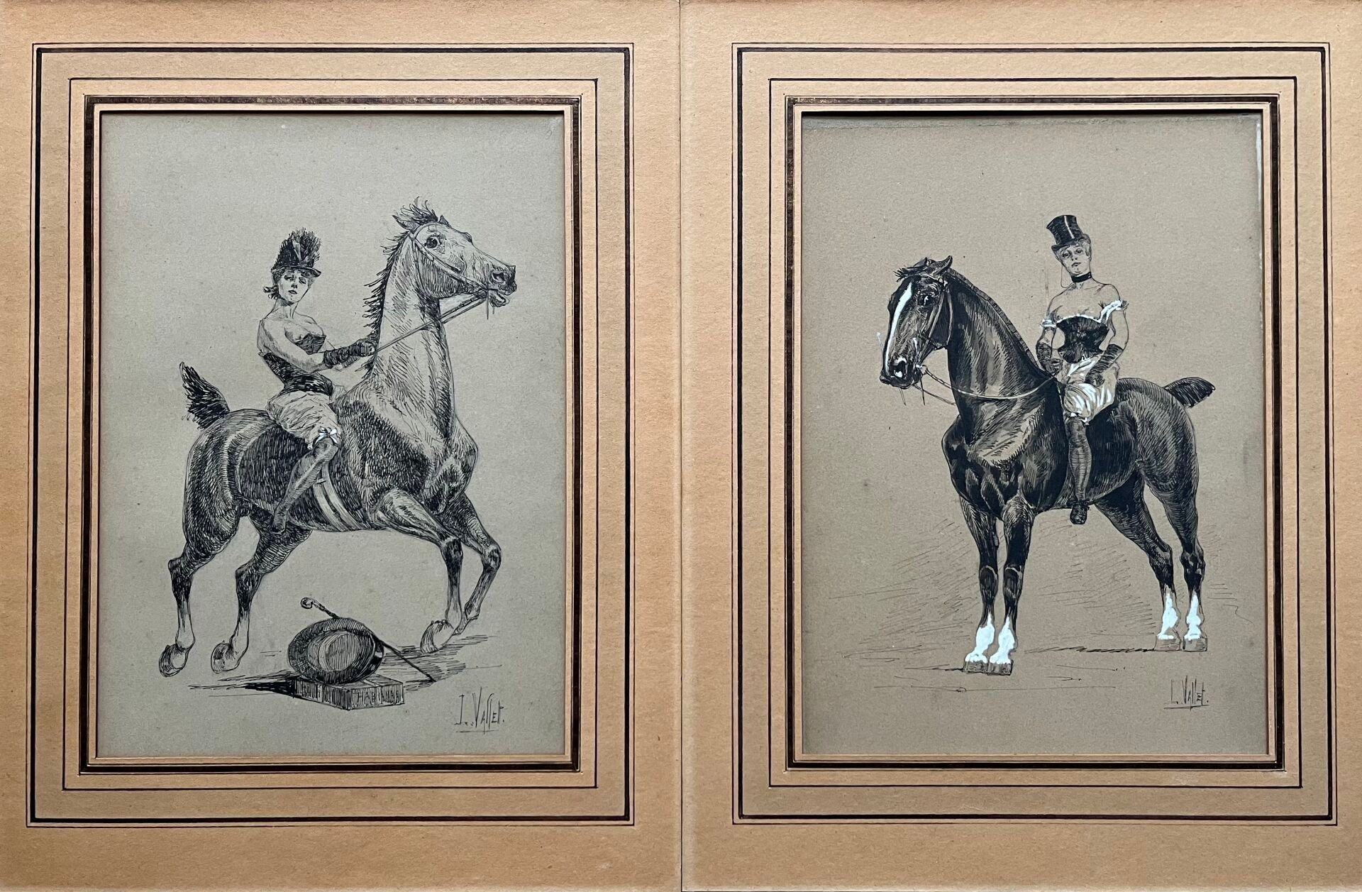 Louis VALLET (1856-1940) Élégantes à cheval. Deux dessins à l'encre et rehaut de gouache sur papier brun signé en bas à droite. 26,5 x 18,5cm.