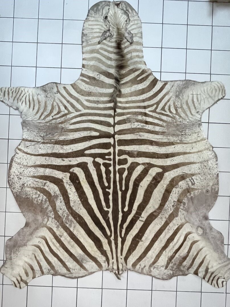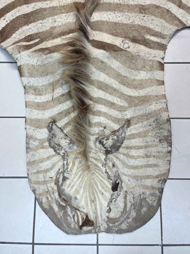 PEAU de zèbre (Equus quagga) avec partie céphalique. 230 x 185 cm. Accidents et manques, en l'état.