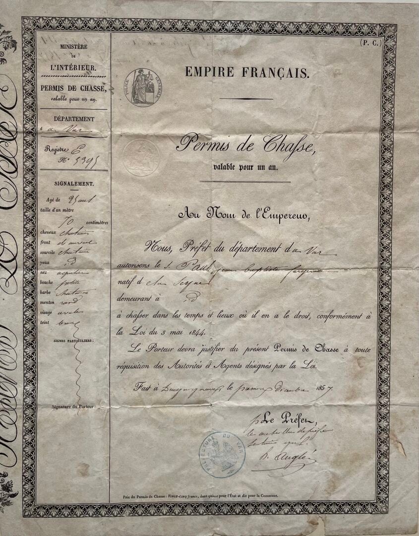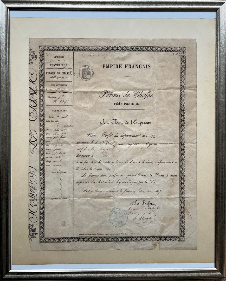 [Second Empire]. PERMIS de chasse valable pour un an, 1er décembre 1857, département du Var.