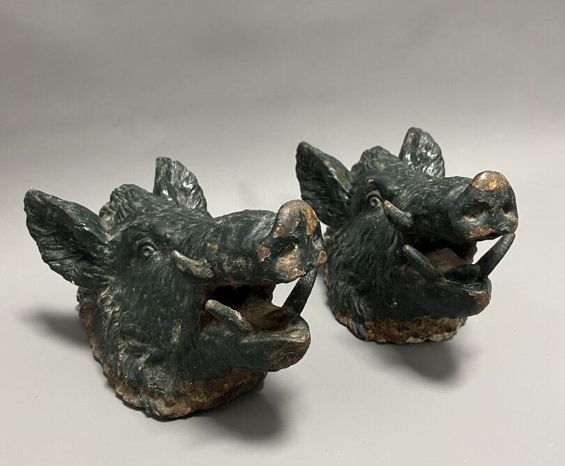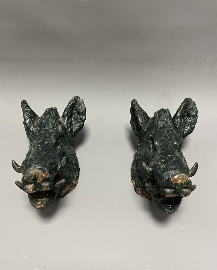 PAIRE DE TROPHEES de chasse en fonte de fer laqué vert figurant une hure de sanglier. H : 18cm ; 30 x 16cm En l'état.
