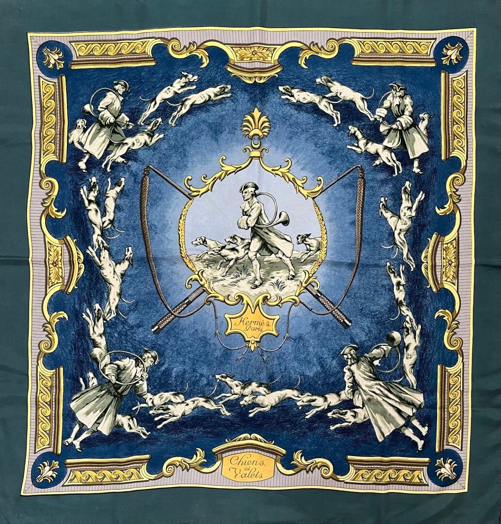 Carré en twill de soie à décor imprimé sur fond bleu, d'après un dessin de Charles HALLO.