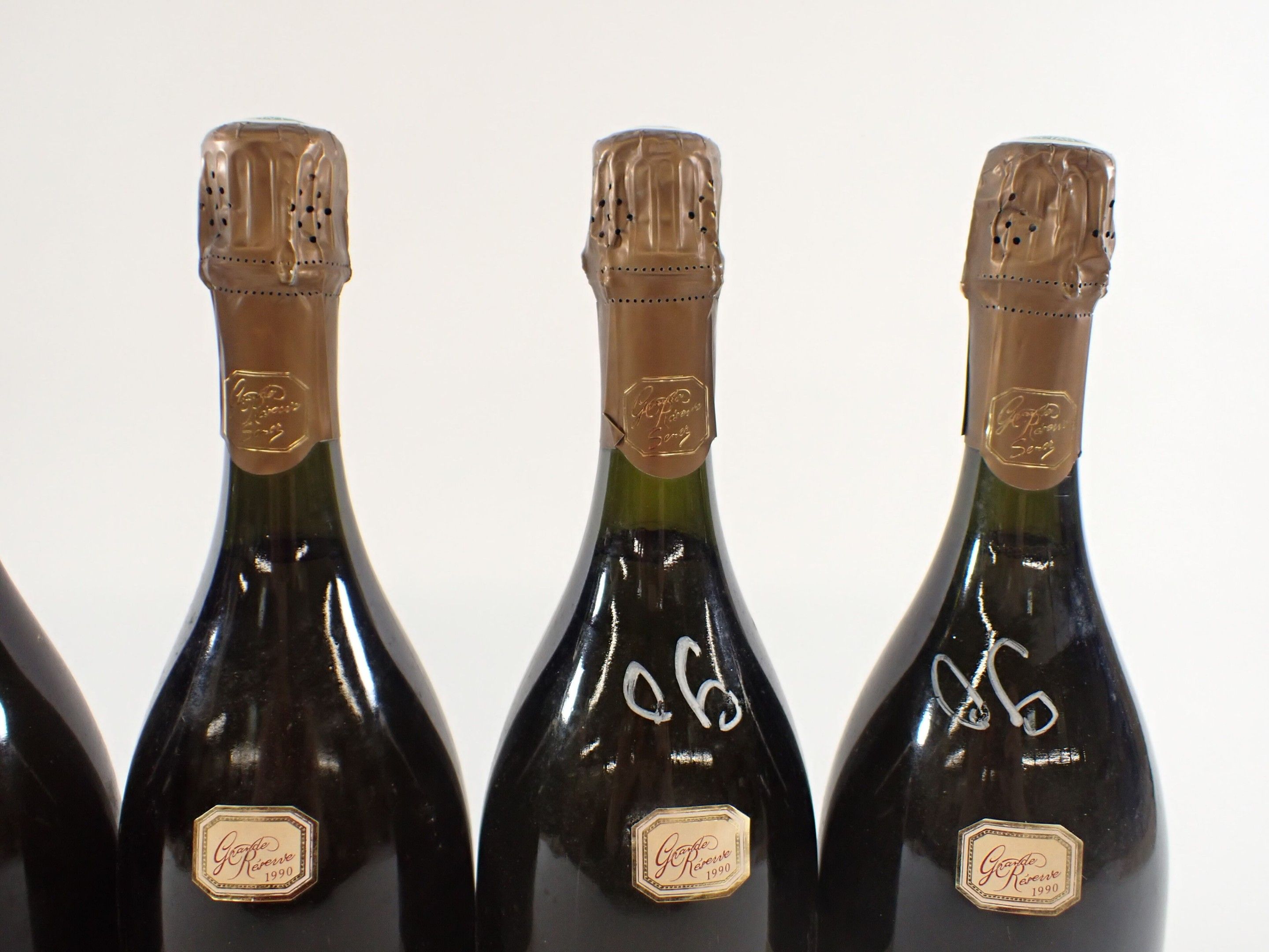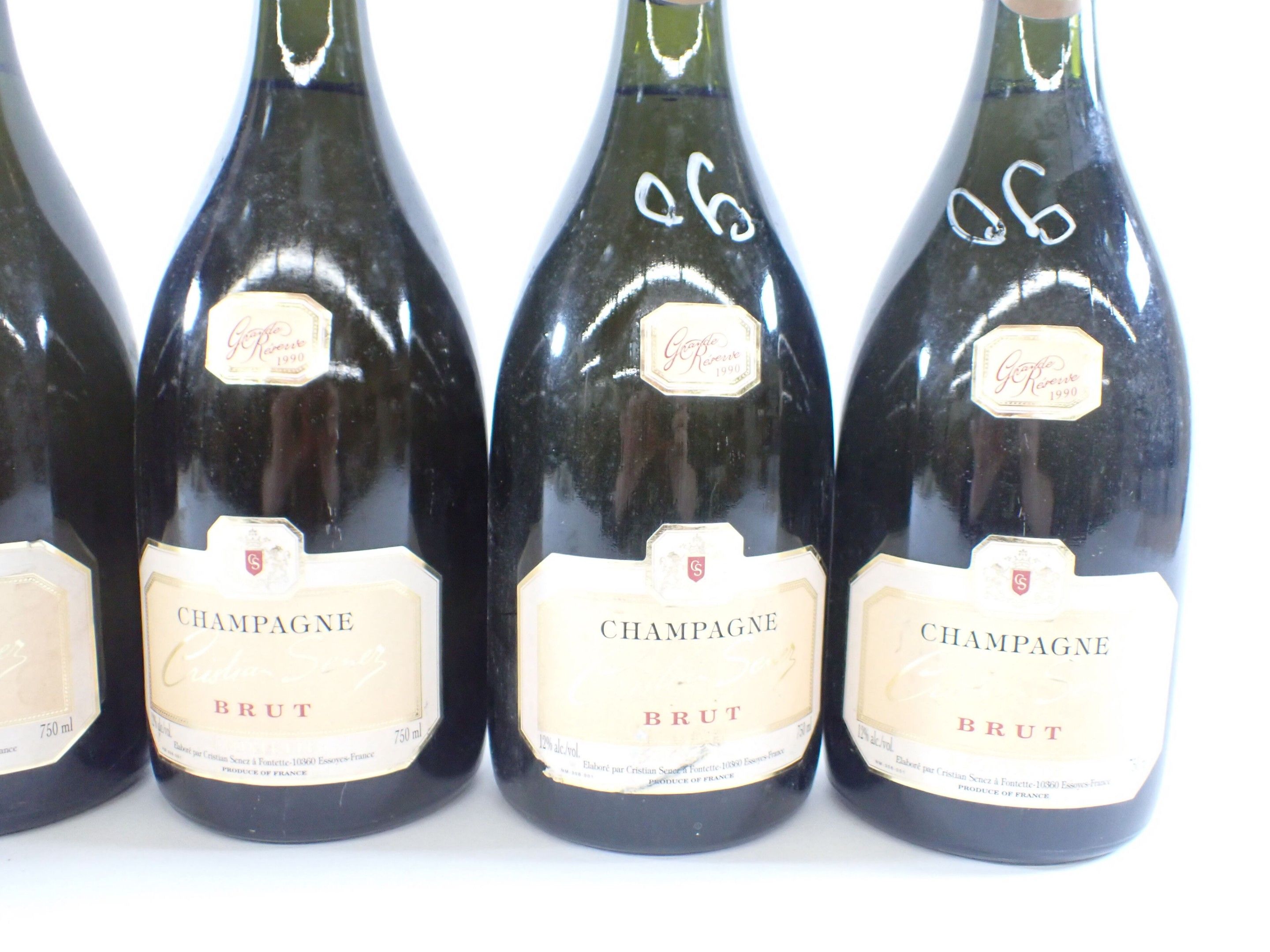 4 bouteilles, Champagne, Christian Senez, Grande Réserve, Brut, 1990. Niveaux légèrement bas. Etiquettes légèrement sales dont une est abimée.