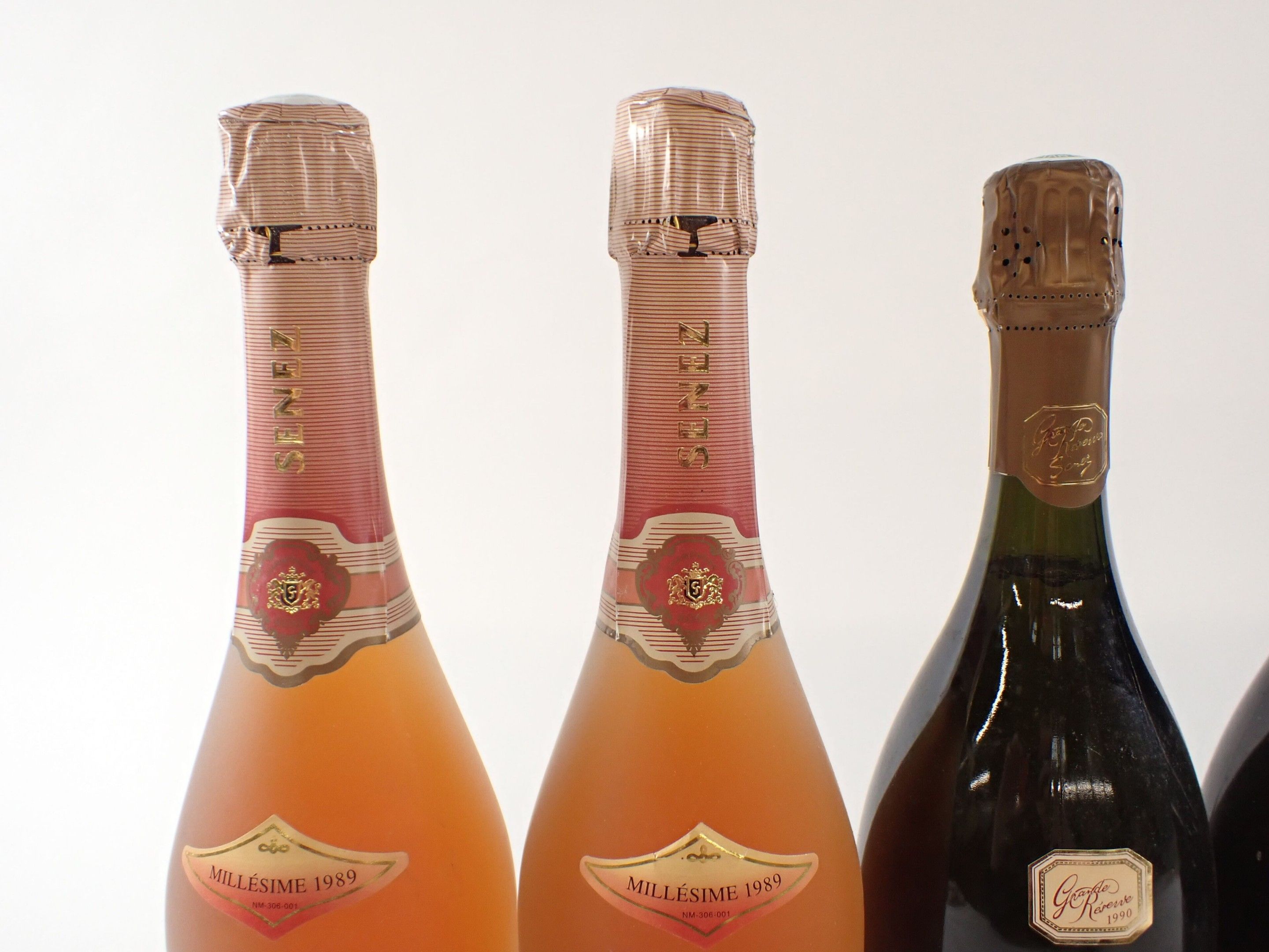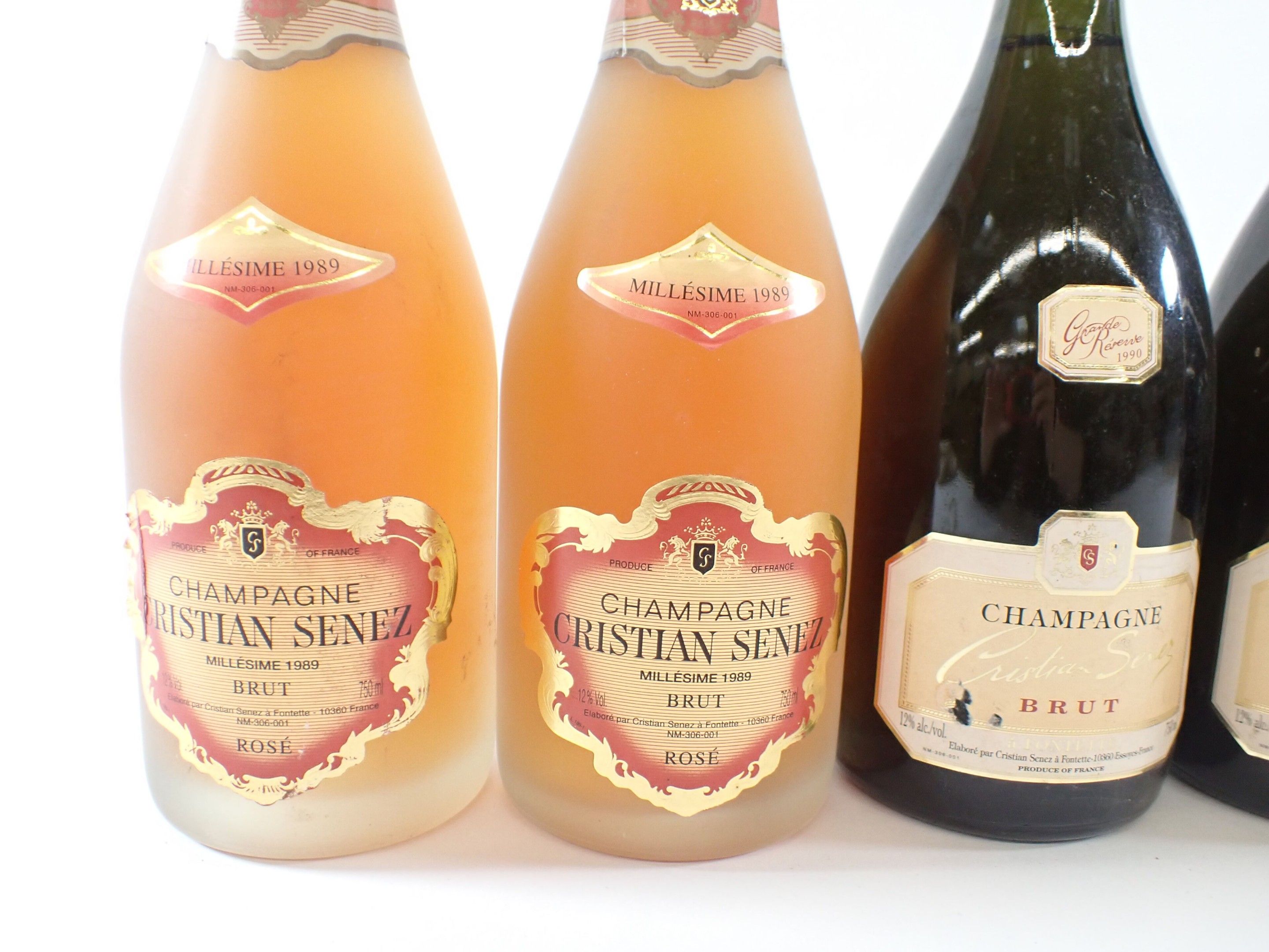 2 bouteilles, Champagne, Christian Senez, Rosé, Brut, 1989. Une étiquette avec des traces et un pli.
