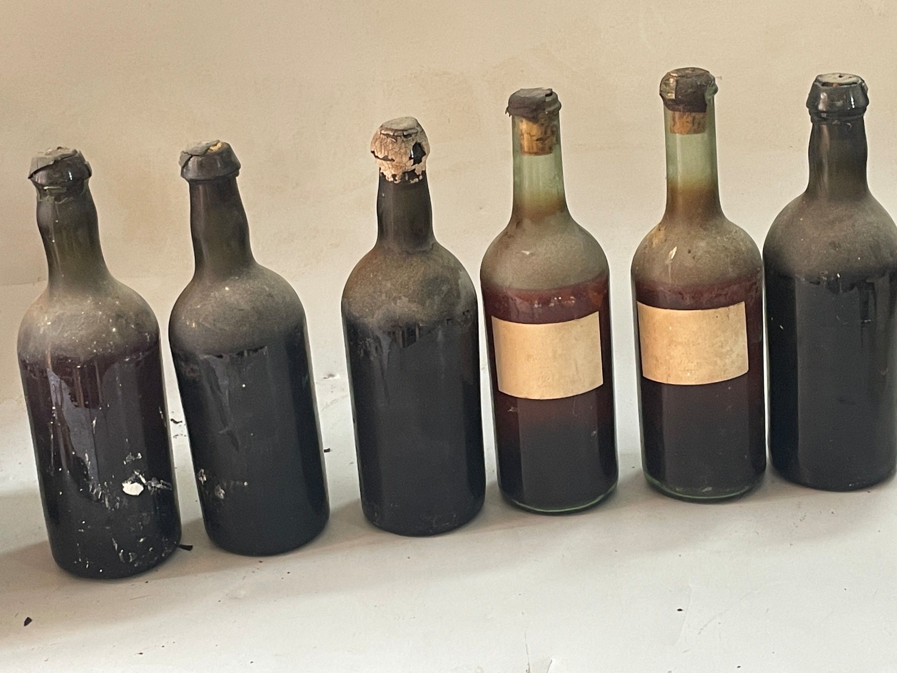 6 bouteilles MARSALA 1872 étiq. Manuscrite d'époque (MI EP / BAS EP) 4 sans étiquettes