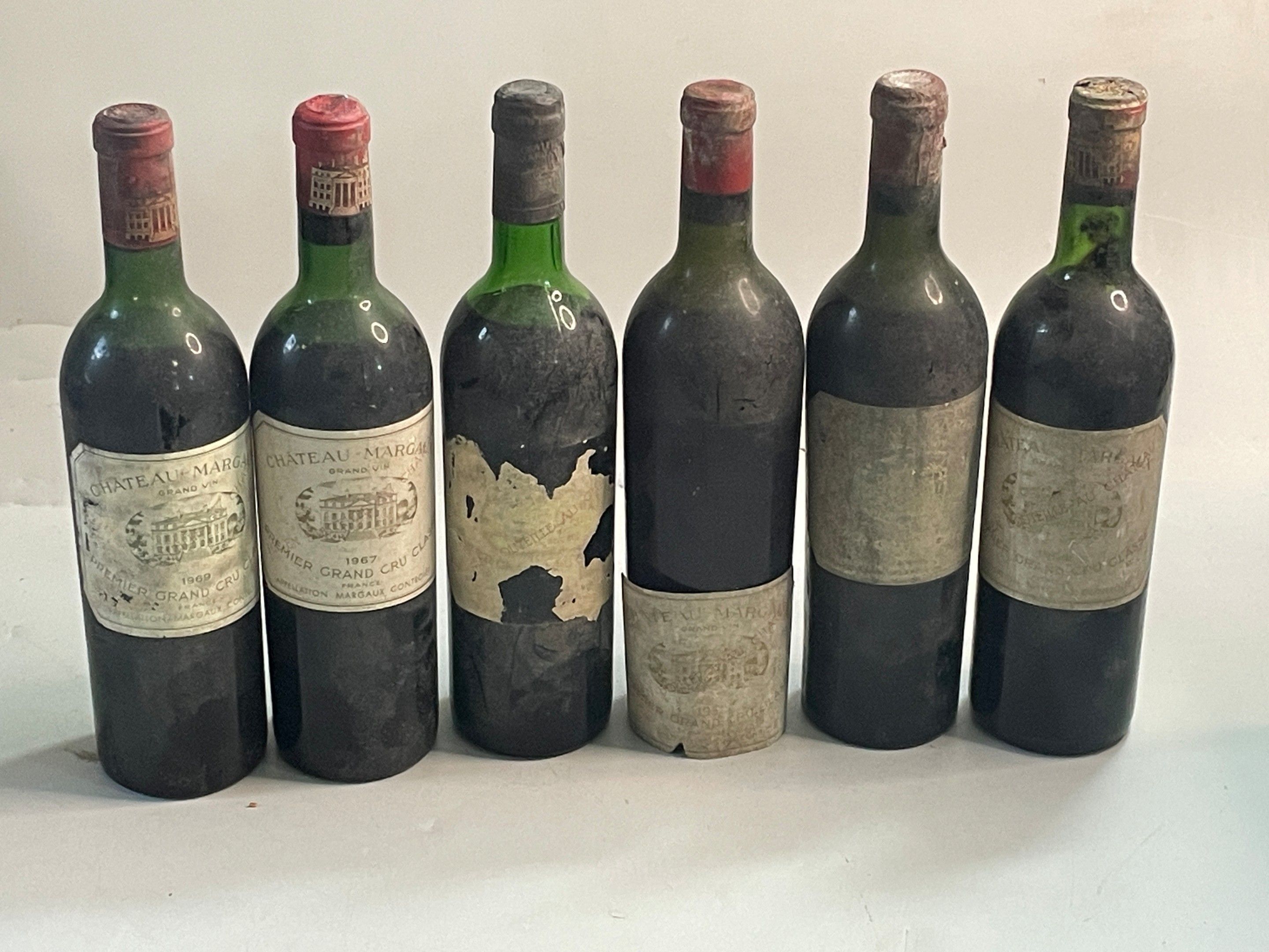 6 bouteilles Château Margaux 1966, 1967, 1969 et 3 millésime illisible ( NLB/ déb ép étiq abîmées)