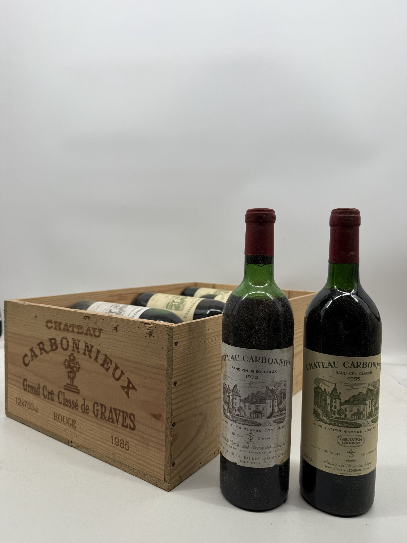 10 bouteilles 10 bts : Château CARBONNIEUX 1985 et 2 bts de 1972 (NLB/déb ép)