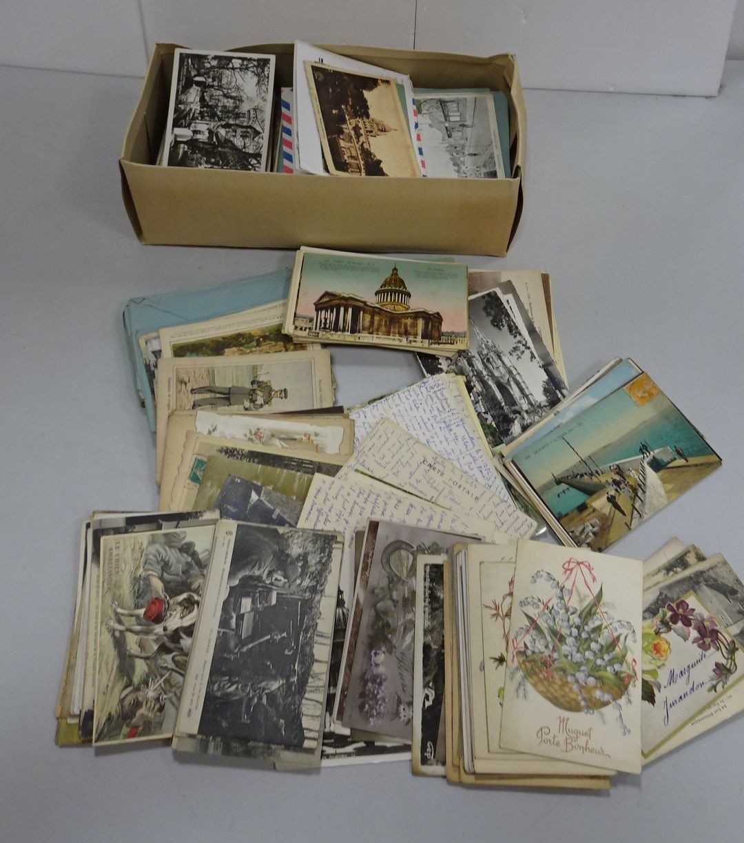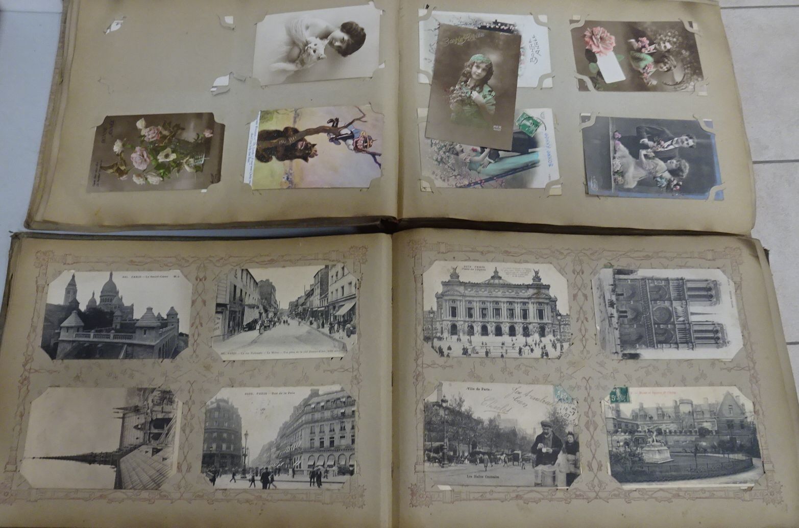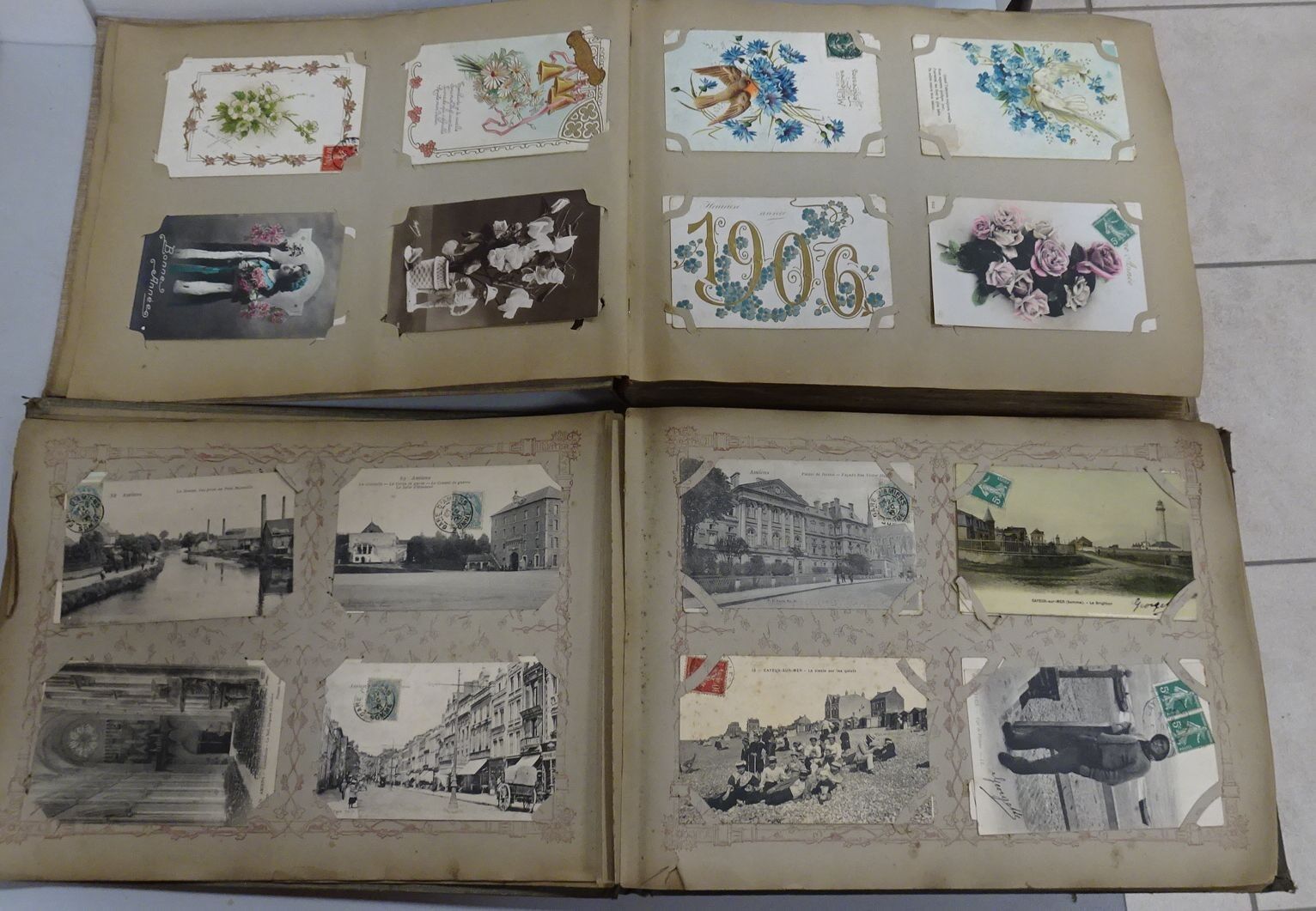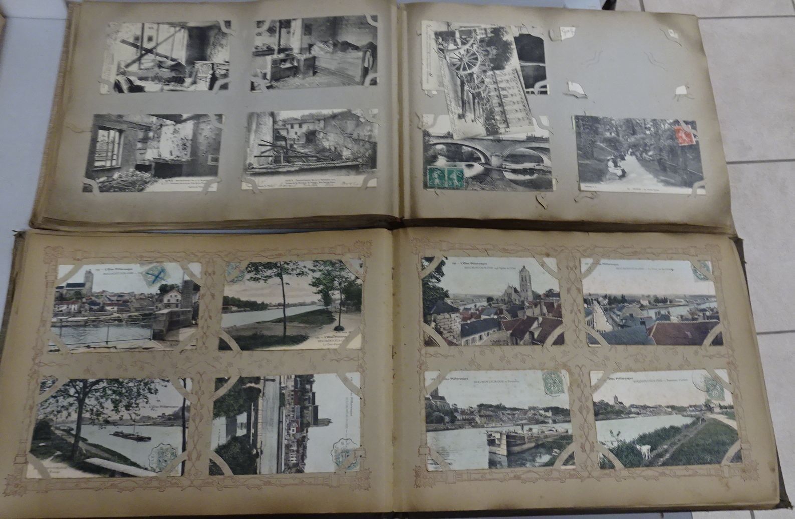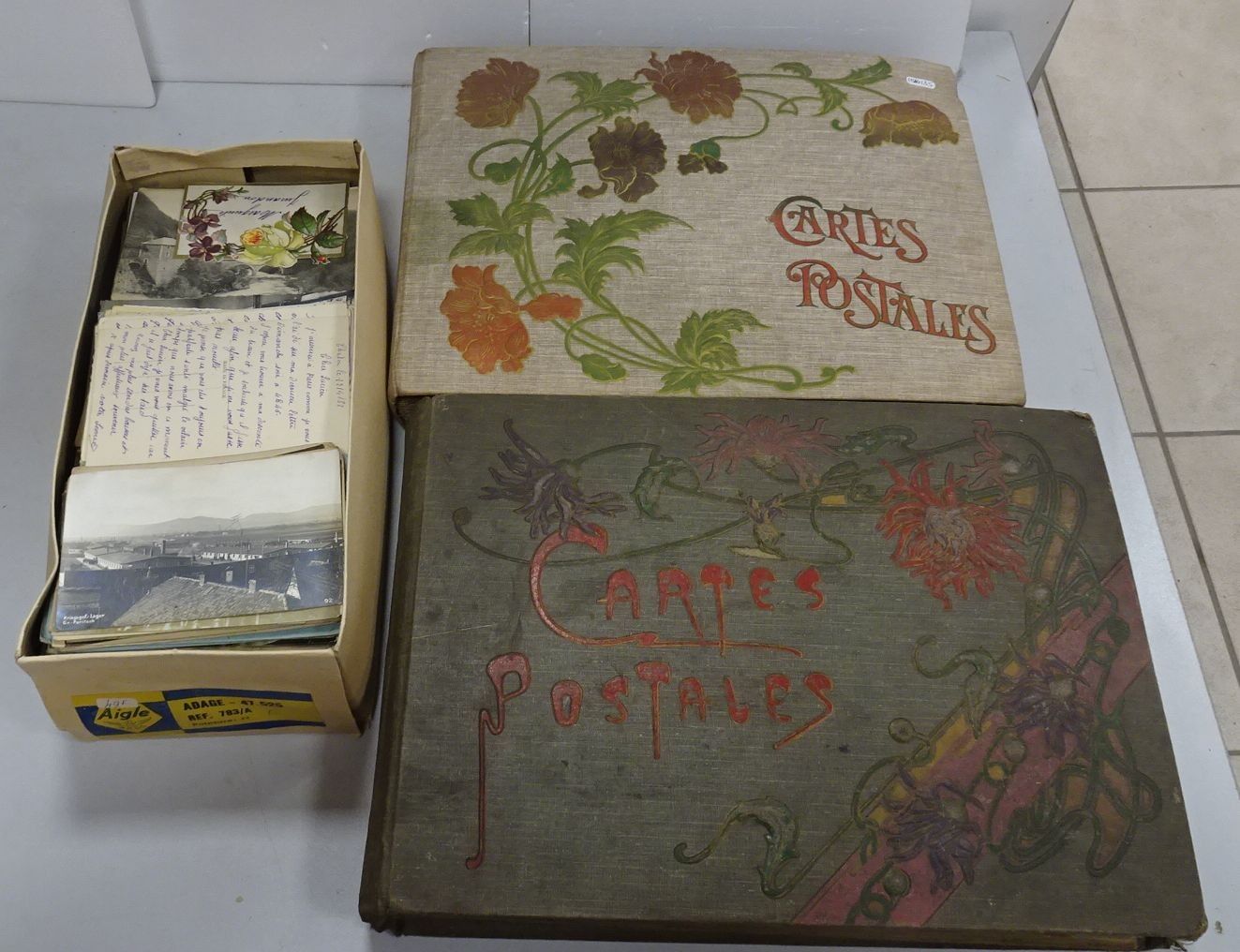2 Albums + 1 Boîte de cartes postales anciennes : Fantaisie, militaires, paysages, vues animées