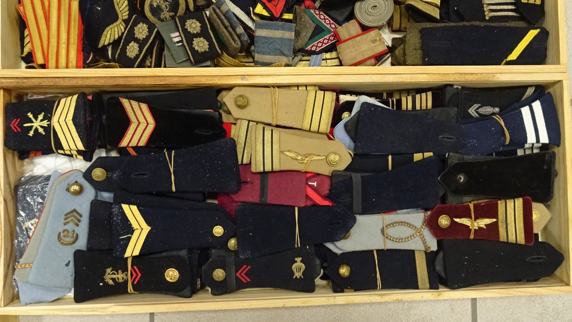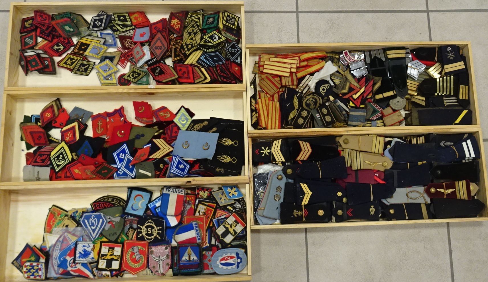 5 Boîtes d'insignes tissu : Pattes de col, galons, grades, épaulettes, losanges de bras. 2ème Guerre Mondiale. 1944 à 1980
