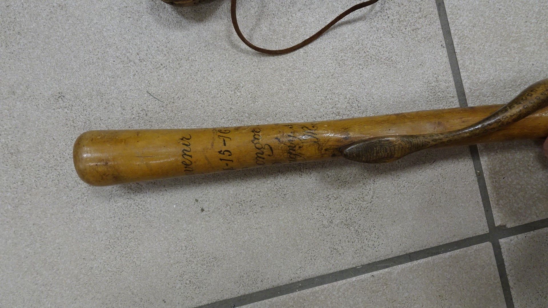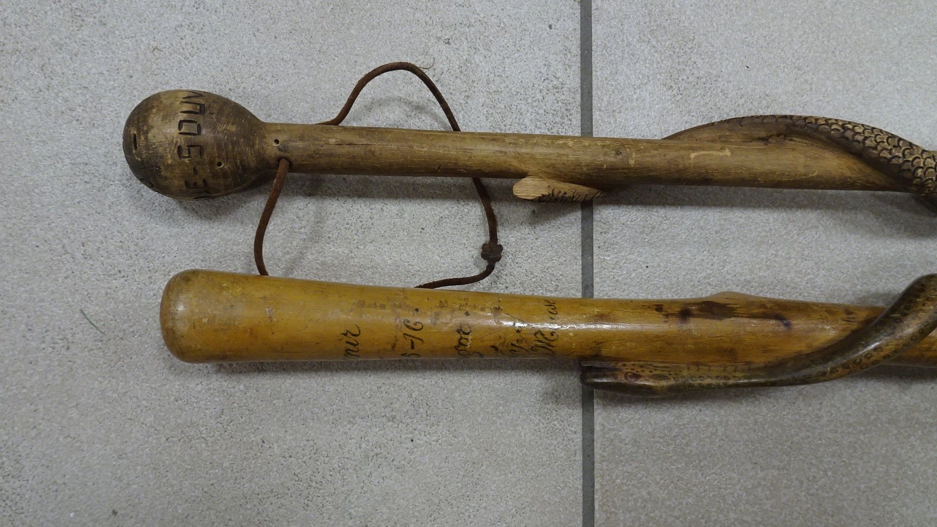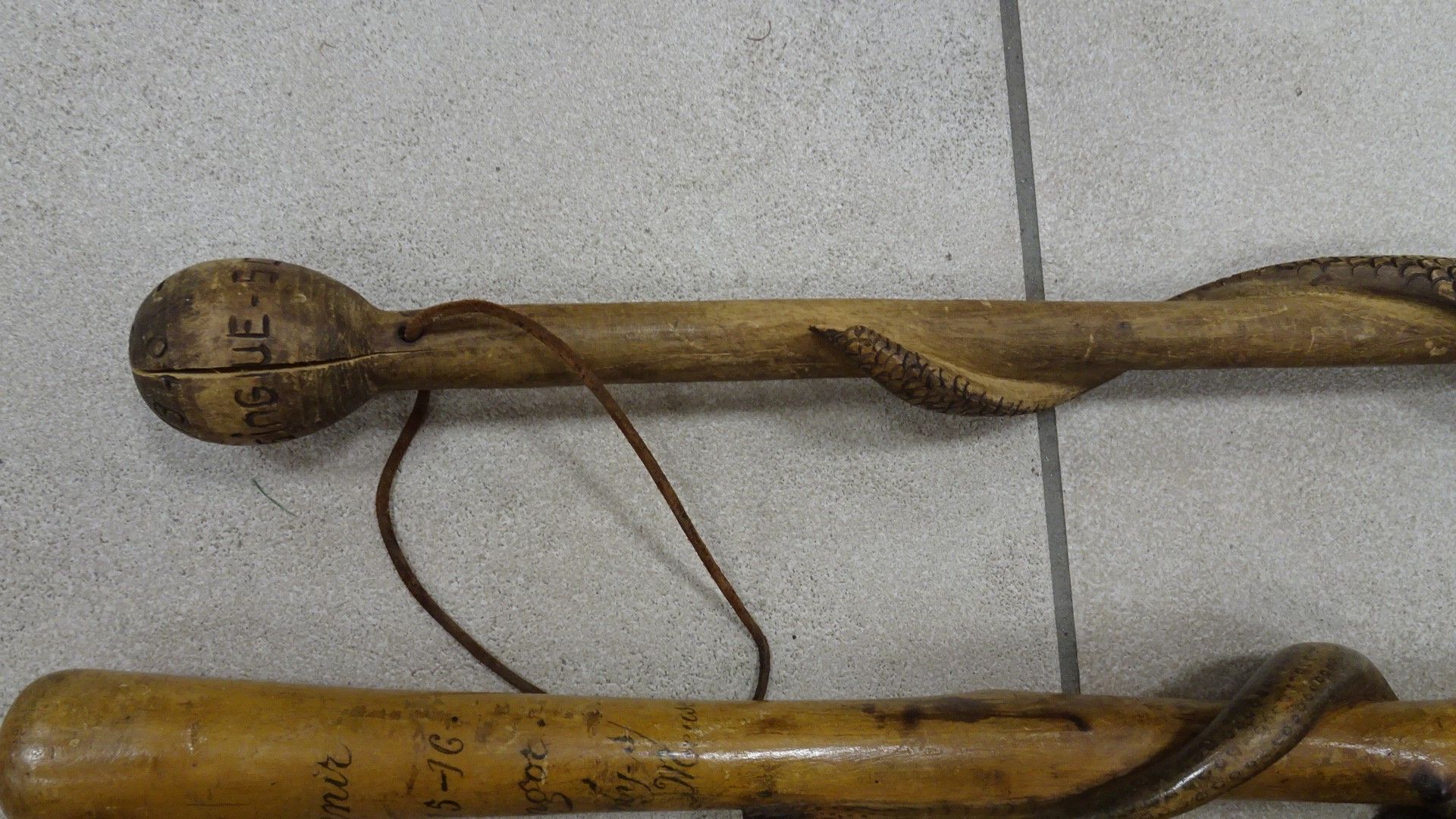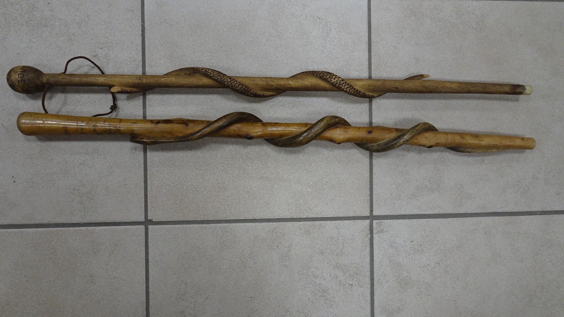 Canne de poilu en bois sculpté d'un serpent. 1914/1916 + Canne en bois sculpté d'un serpent. "Souvenir d'Hésingues". 1940
