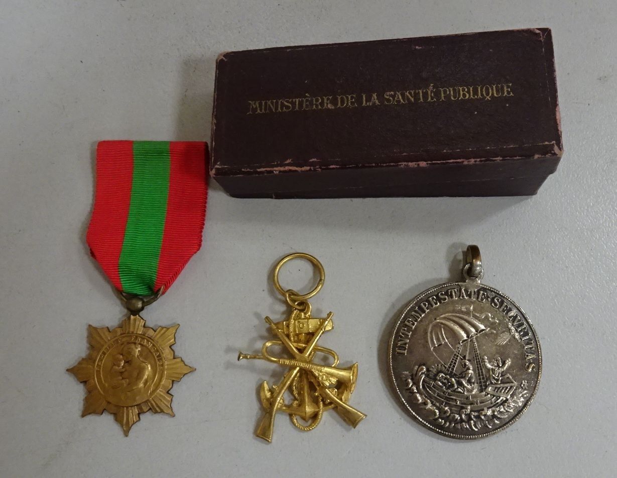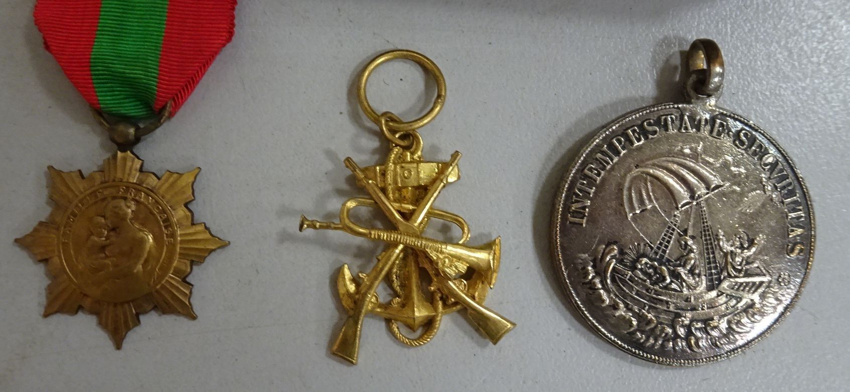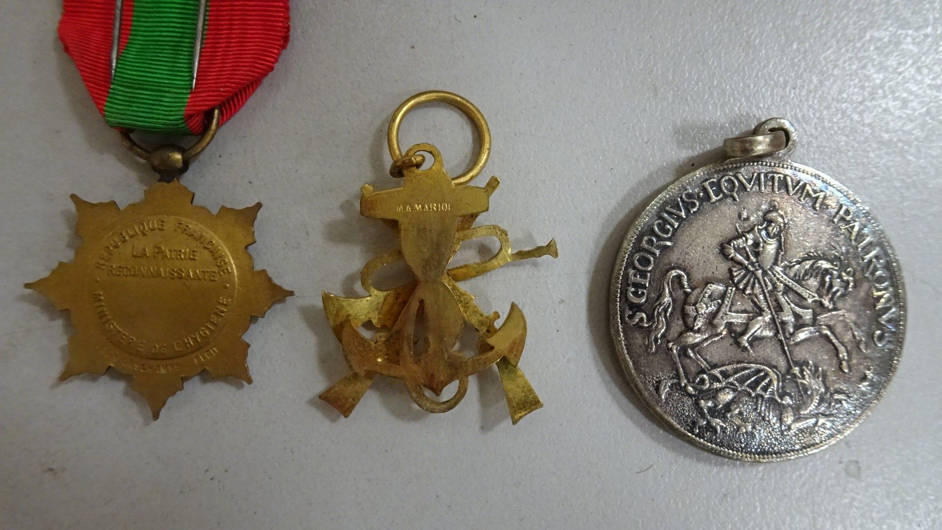 Insigne militaire en métal doré "ancre, fusils et clairon" Gravé au dos MA. MARION + Insigne Famille française + Médaillon Intempestate securitas/Saint Georges