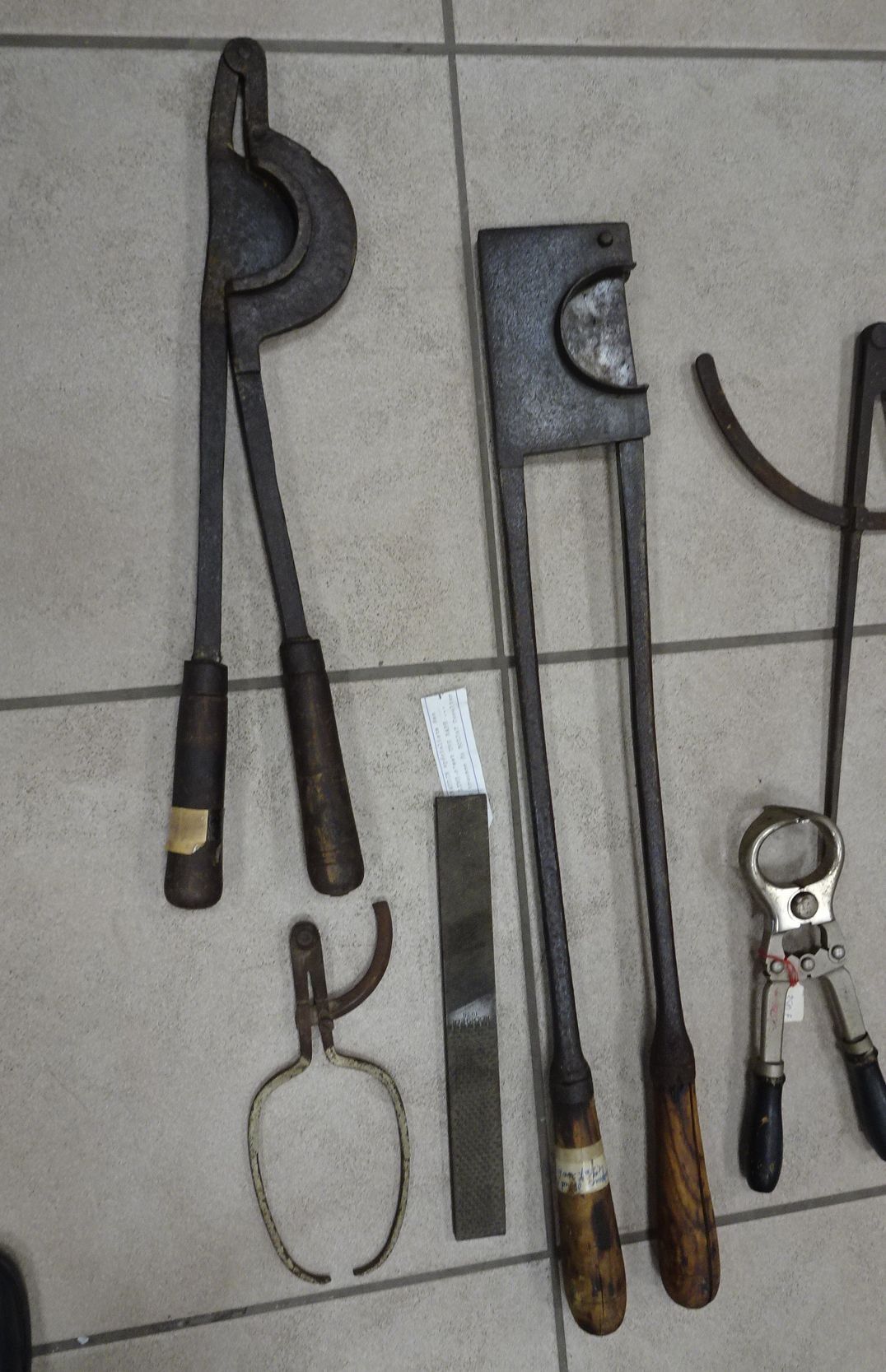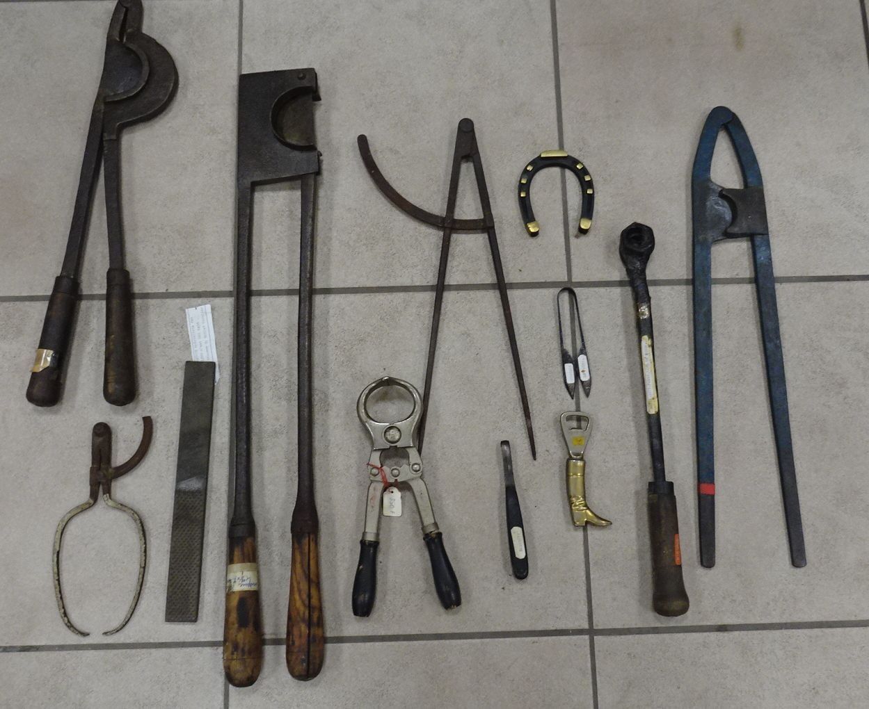 Lot d'outils de Maréchal-Ferrant et Vétérinaire : Coupe-queues - compas - pince à castrer - compas - rainette - ciseau de foire - brule-queue - fer à cheval