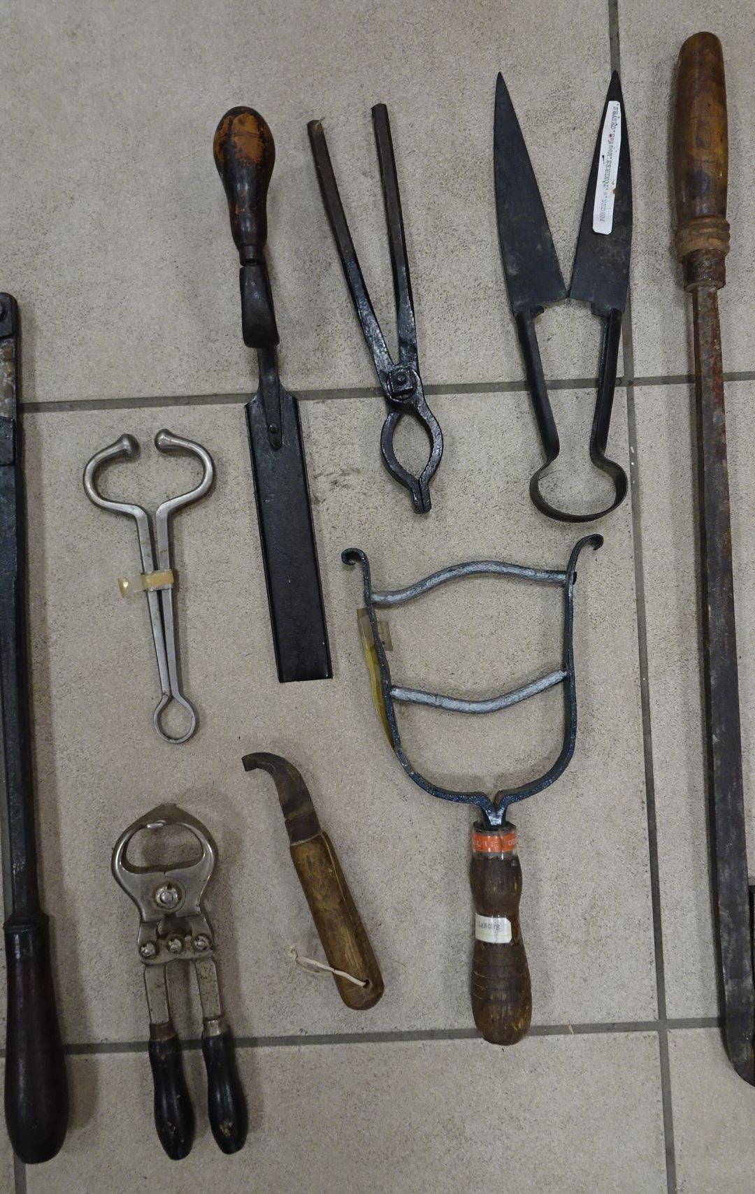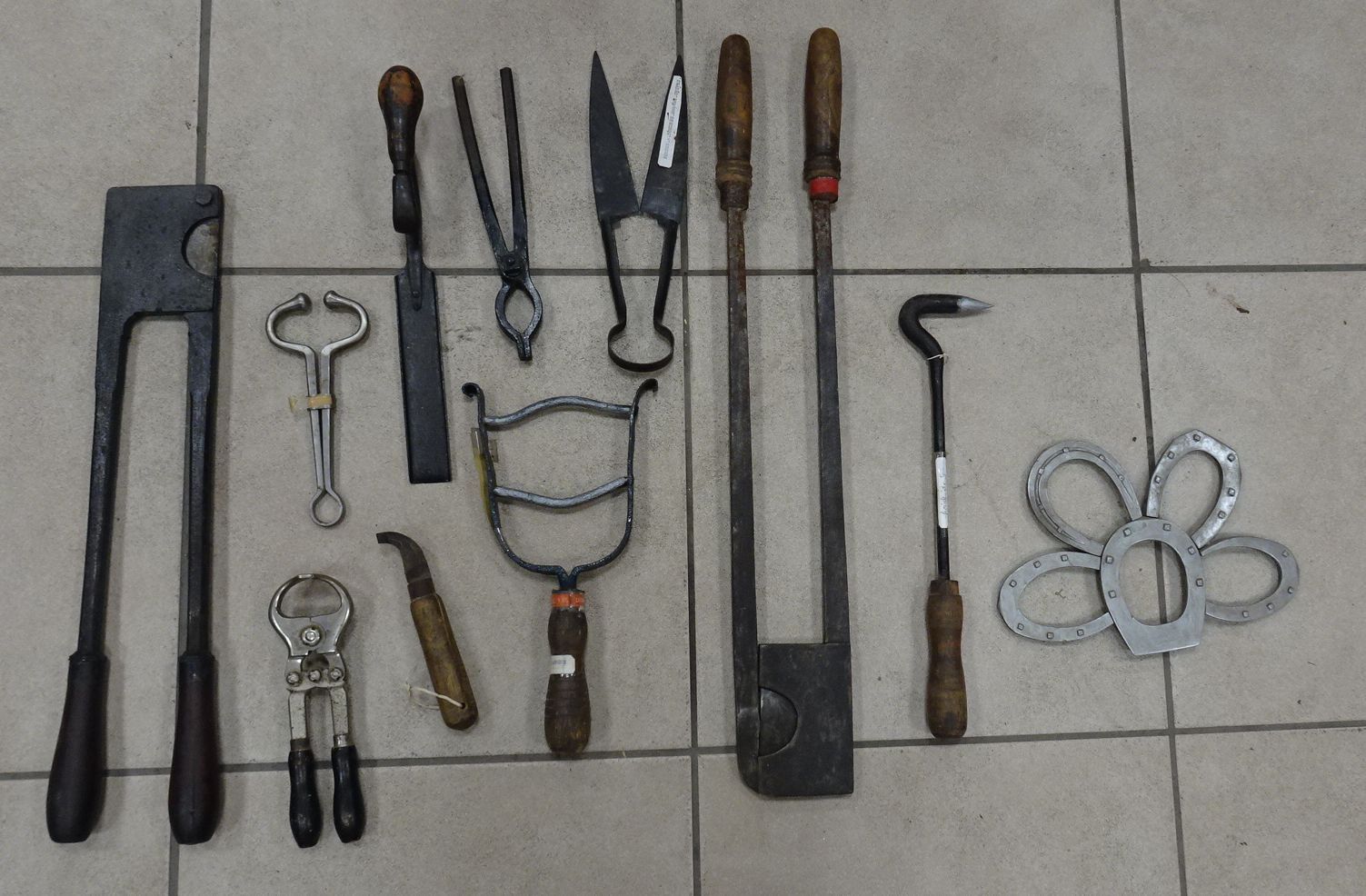 Lot d'outils de Maréchal-Ferrant et Vétérinaire : Coupe-queue - pince à castrer - force - abaisse-langue - pointe de feu - petites pinces