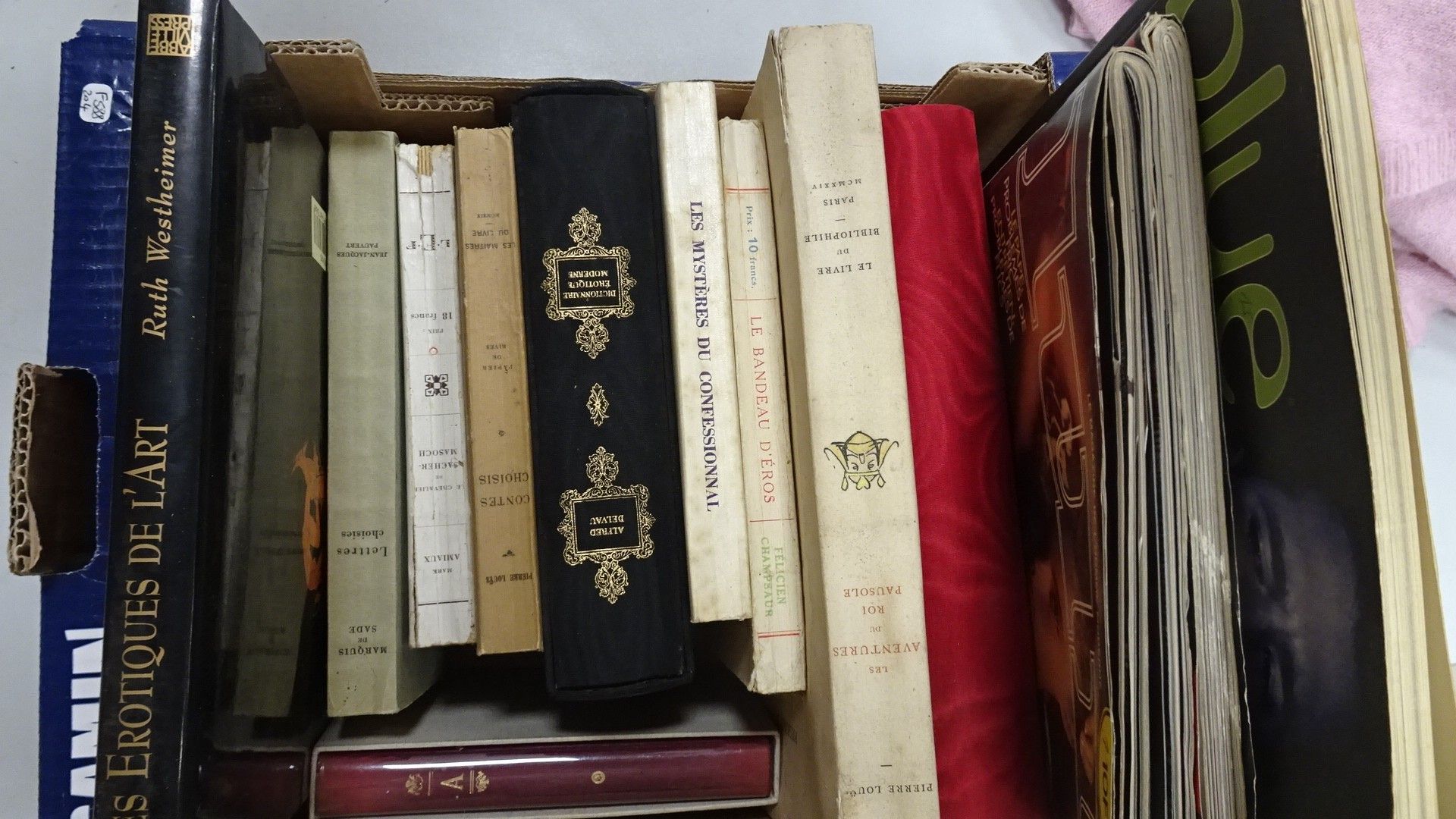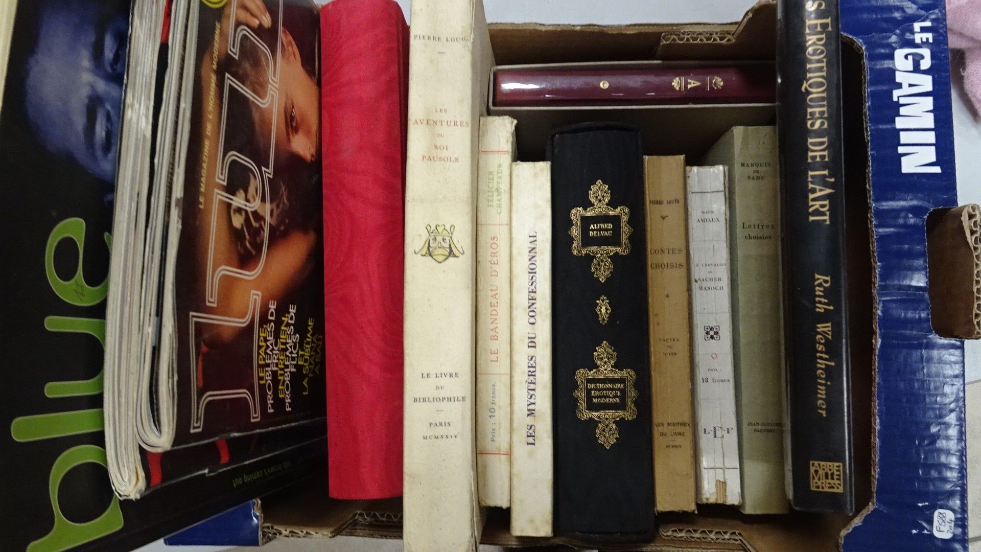 Carton de Livres érotiques : Pierre Louÿs. Contes choisis et les Aventures du roi Pausole - Mark Amiaux Le chevalier de Sacher-Masoch - Marquis de Sade. Lettres choisies - Les bijoux indiscrets - Alfred Delveau. Dictionnaire érotique moderne - Les mystères du confessionnal - Champsaur. Le bandeau d'Eros - - Les érotiques de l'art - De la Pérennité du Couple + 3 revues Lui et Blue