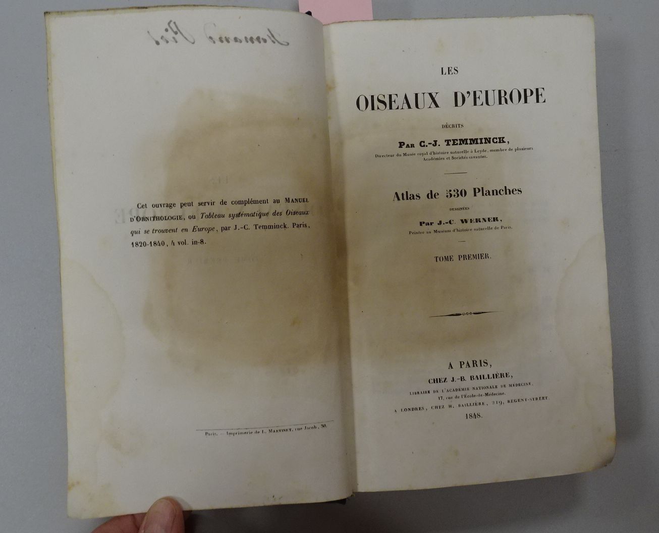 C.-J. TEMMINCK. Les oiseaux d'Europe. Atlas de 530 planches dessinées par J.-C. Werner. Tome premier. Chez Baillière, Paris 1848