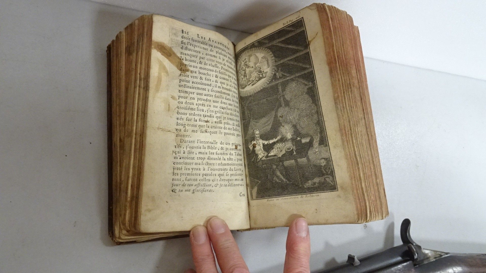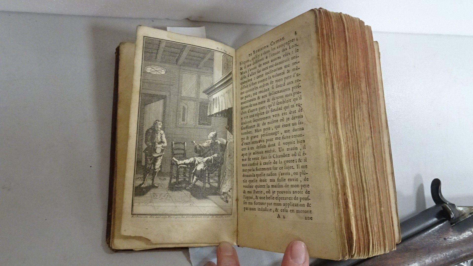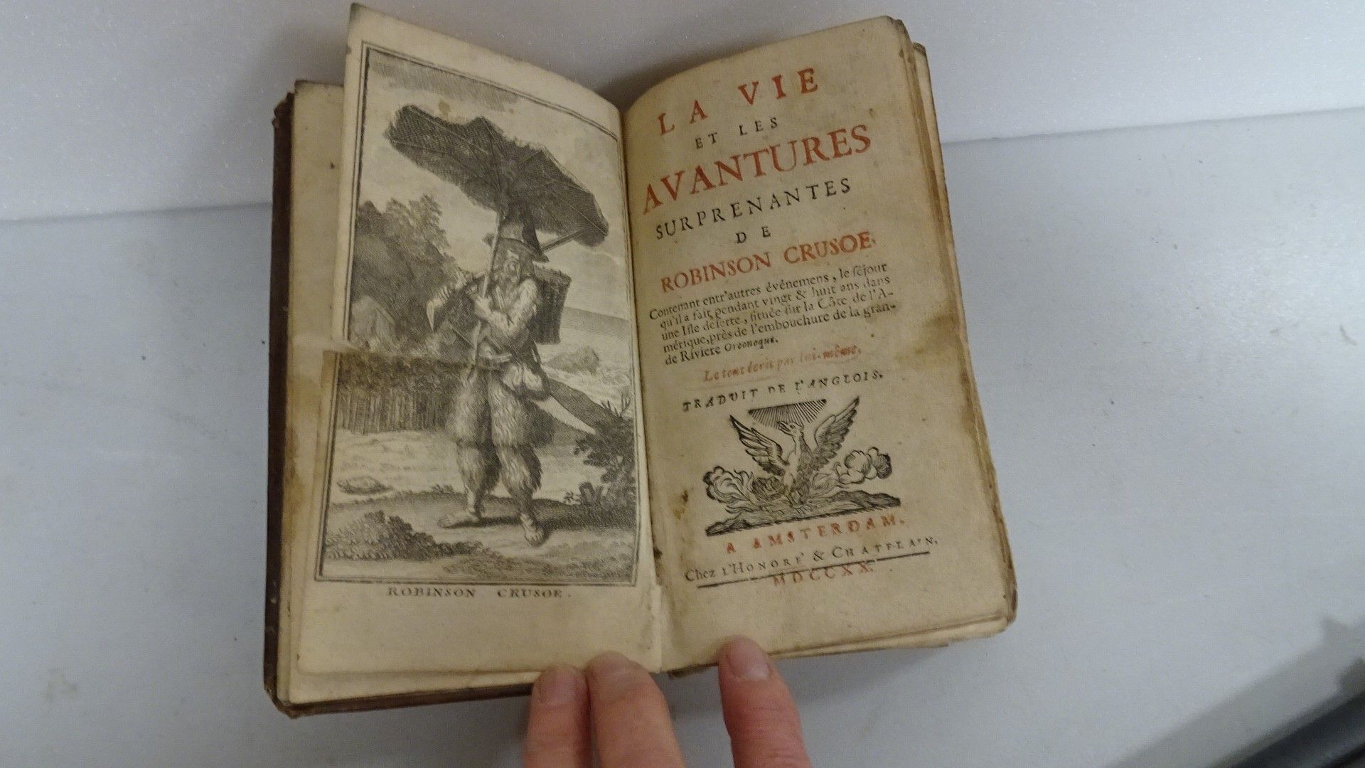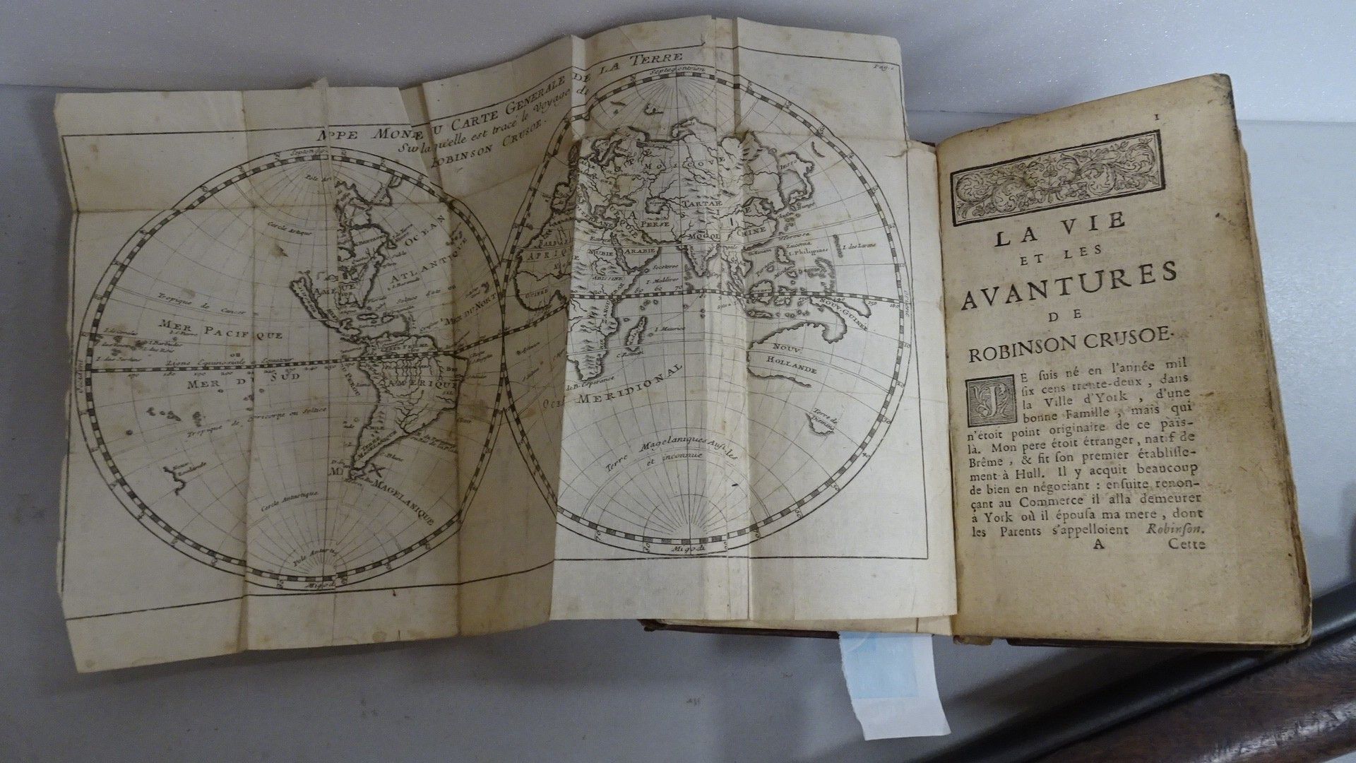 La Vie et les Aventures surprenantes de Robinson Crusoé. 1 vol. Chez L'Honoré et Chatelain, à Amsterdam. 1720. Gravure dépliante mappemonde. (déchirure)