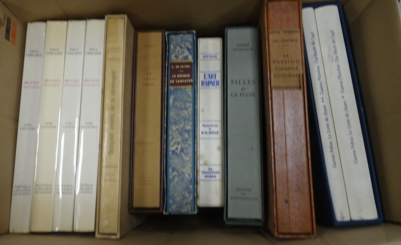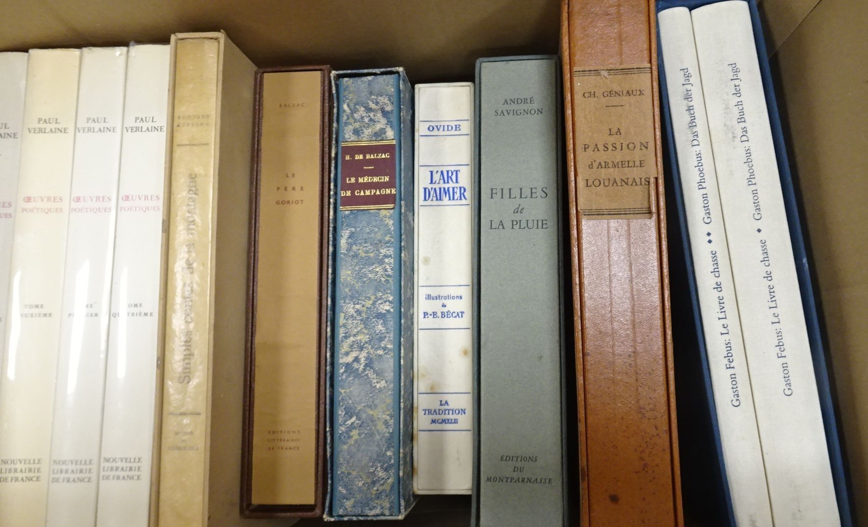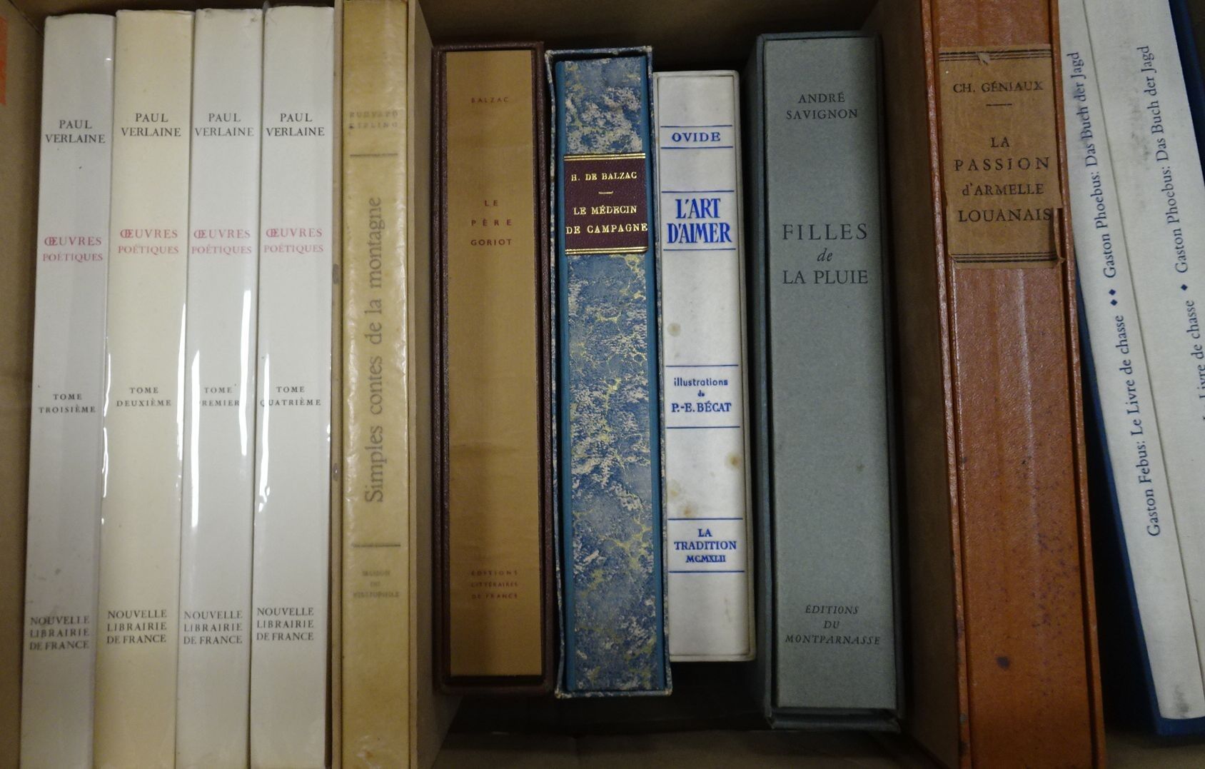 Lot de livres et emboîtages XX°. Oeuvres poétiques de Paul Verlaine. Compositions en couleurs de Léonor Fini. 4 vols. Nouvelle Librairie de France. Exemplaire n°1311. Editions Messein, Paris, 1968 - Rudyard KIPLING. Simples Contes de la Montagne. Pointes sèches de Pierre Dubreuil. La Maison du Bibliophile - BALZAC. Le Père Goriot. Eaux fortes de Charles Genty. Editions Littéraires de France. Exemplaiire 137. 1946 - BALZAC. Le Médecin de campagne. Eaux fortes de paul Genty. Editions Littéraires de France. Exemplaire H.C. 87 - OVIDE. L'Art d'aimer. Pointes sèches de P.E. Bécat. Paris, La tradition. 1942. Exemplaire n° 117 - André SAVIGNON. Filles de la pluie. Illustrations de Perraudin. Editions du Montparnasse. 1947 - Charles GENIAUX. La passion d'Armelle Louanais. Bois originaux de Henry Cheffer. Paris, 1933 - Gaston FEBUS. Le livre de la chasse. 2 vols. Editions Facsimilé Lucerne.