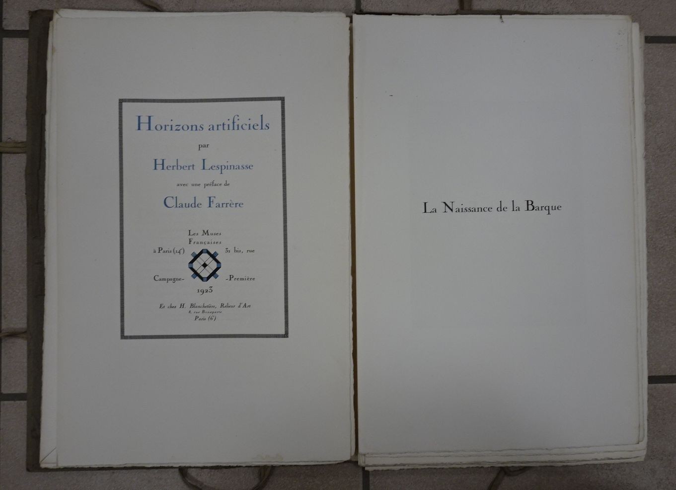 Herbert LESPINASSE. Horizons artificiels. Avec une préface de Claude Farrère. Editions les Muses Françaises. 1923. Exemplaire n°24/125 sur papier velin. Avec gravures. 53 x 35 cm