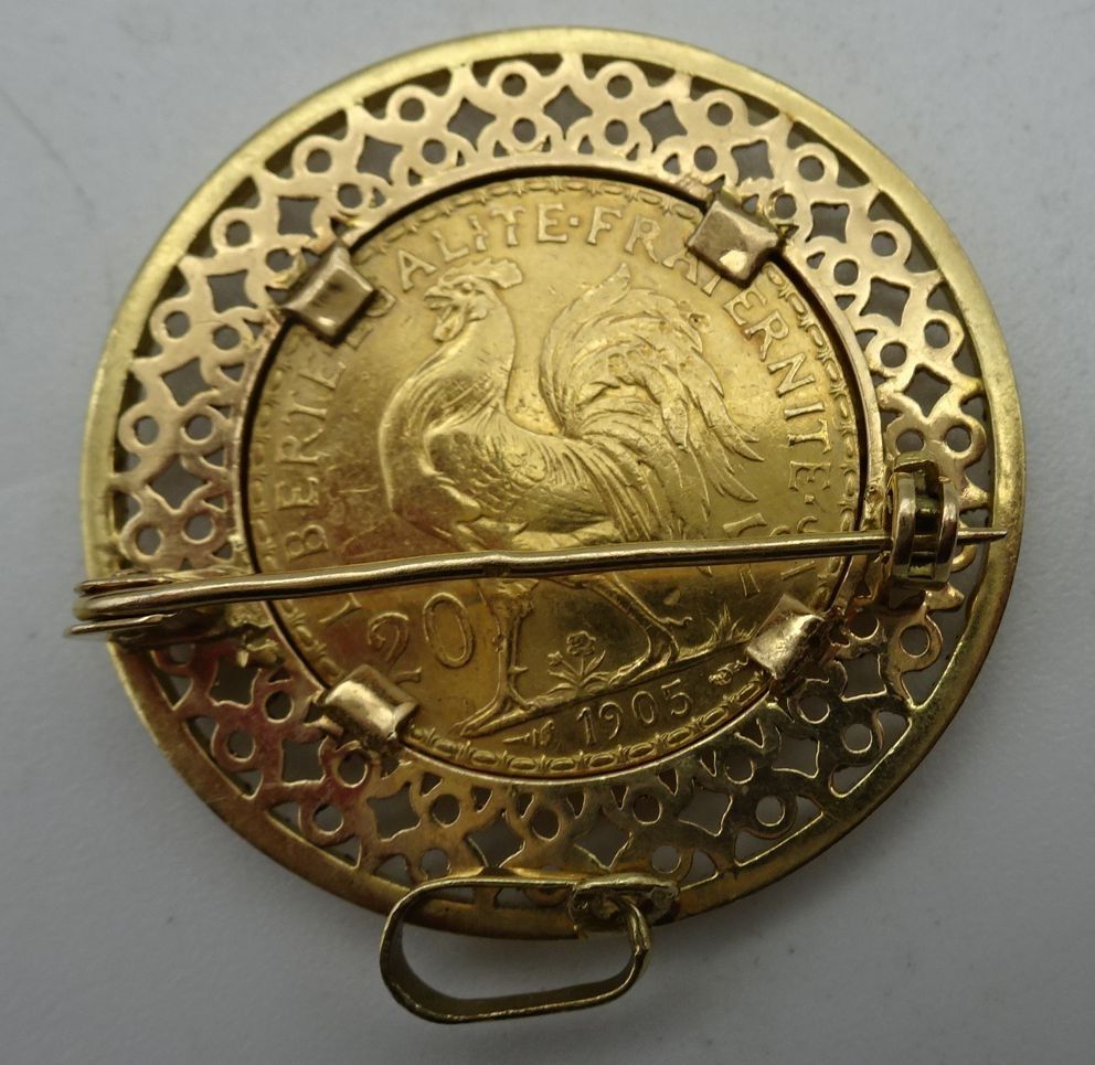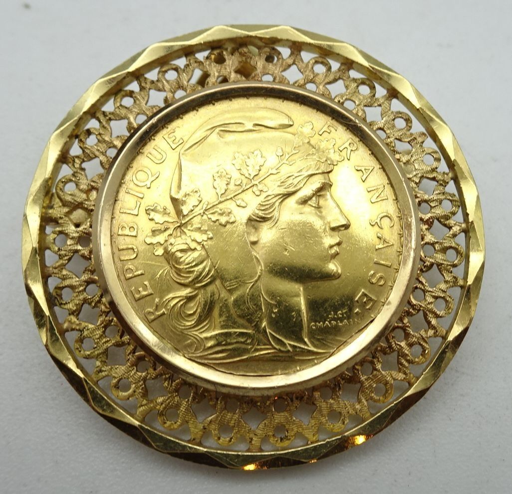 Broche-pendentif en or ornée d'une pièce de 20 Francs or. 12,2 g