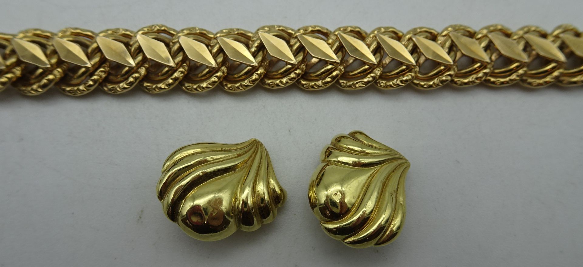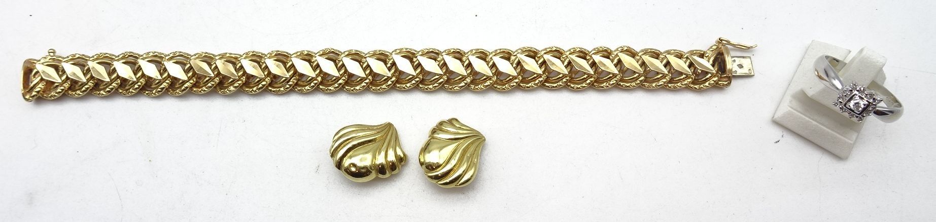Lot de Bijoux en or : Gourmette, Bague ornée de diamants et roses, Paire de clips d'oreilles. 27,4 g brut