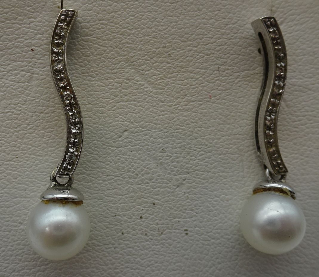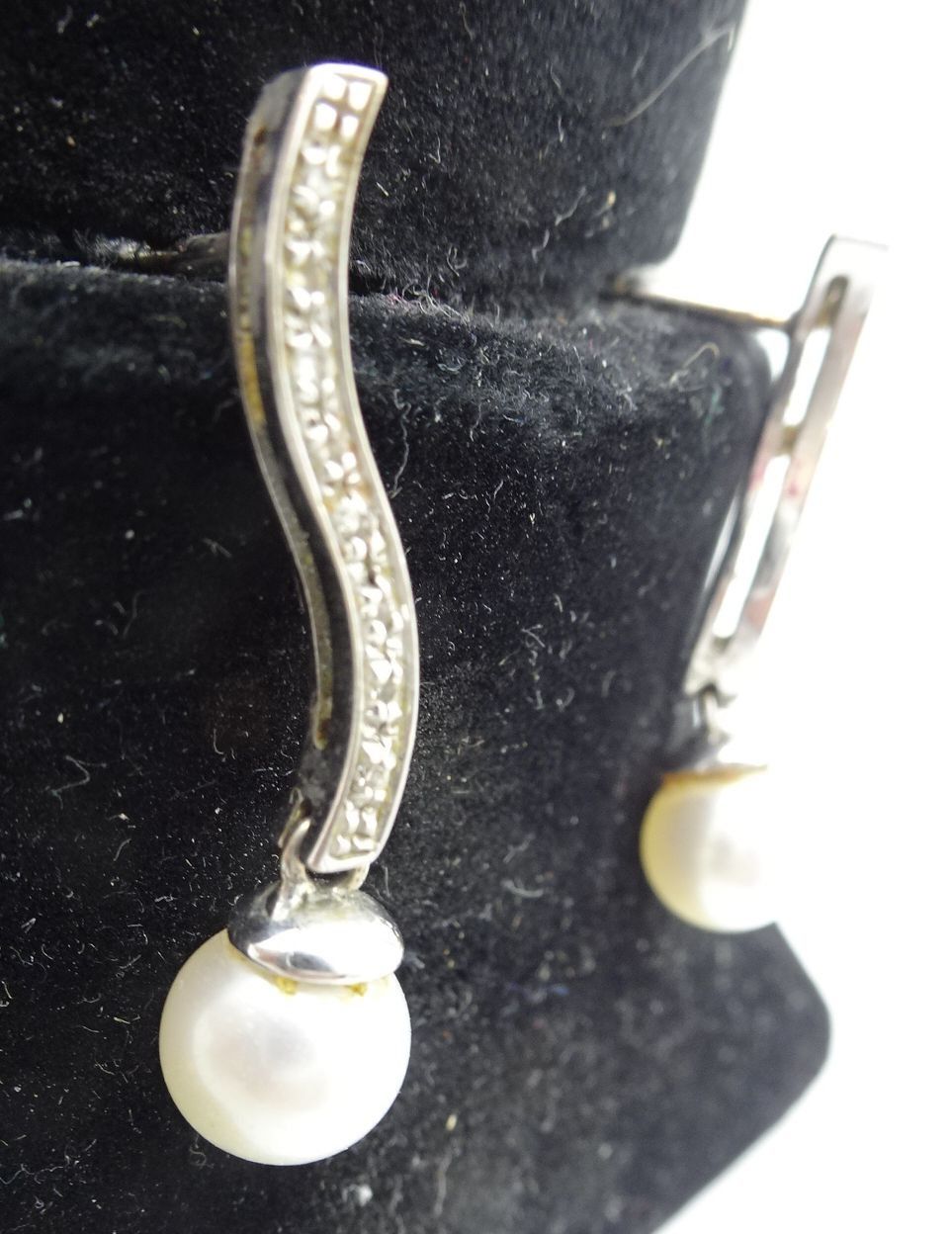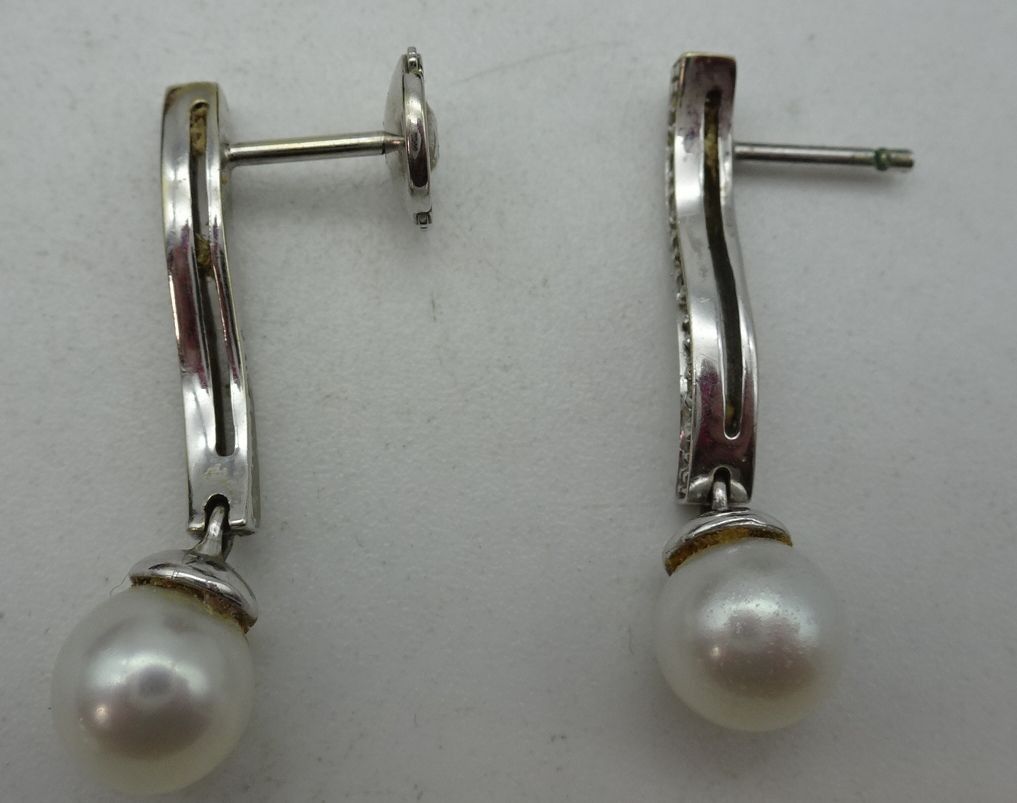 Paire de pendants d'oreilles en or blanc, ornés de roses et perles. 4,4 g brut (manque 1 papillon)