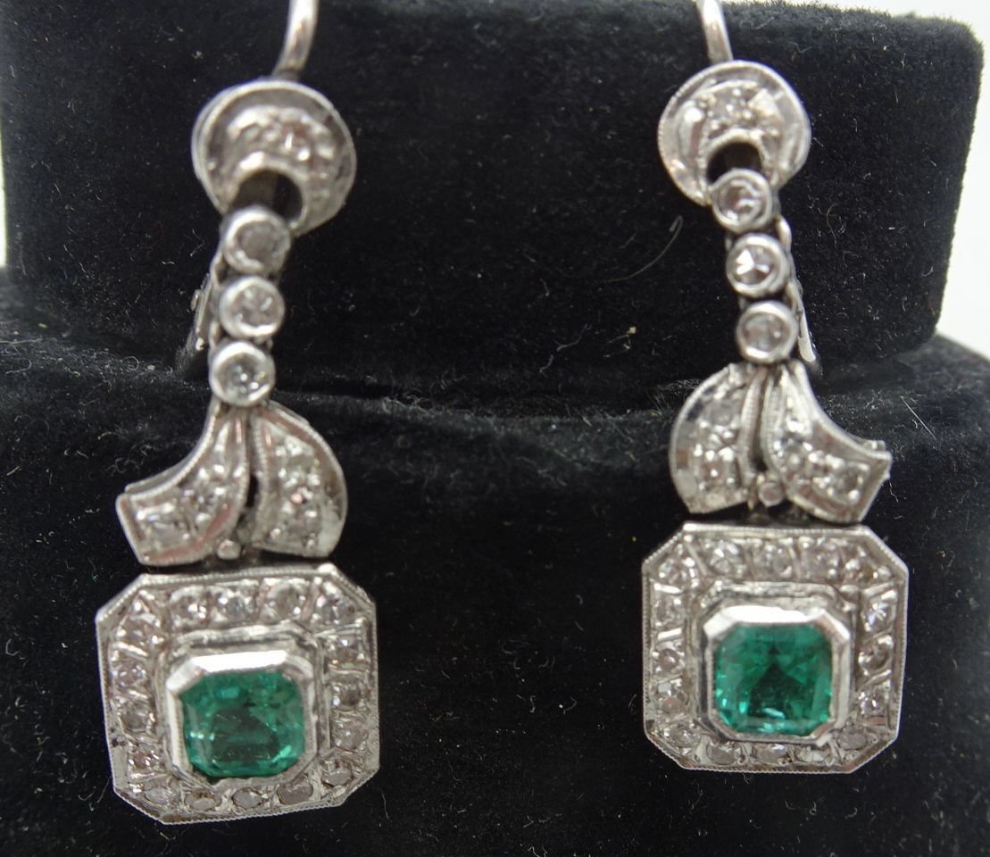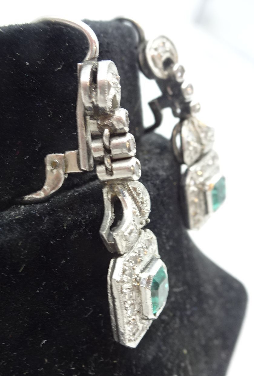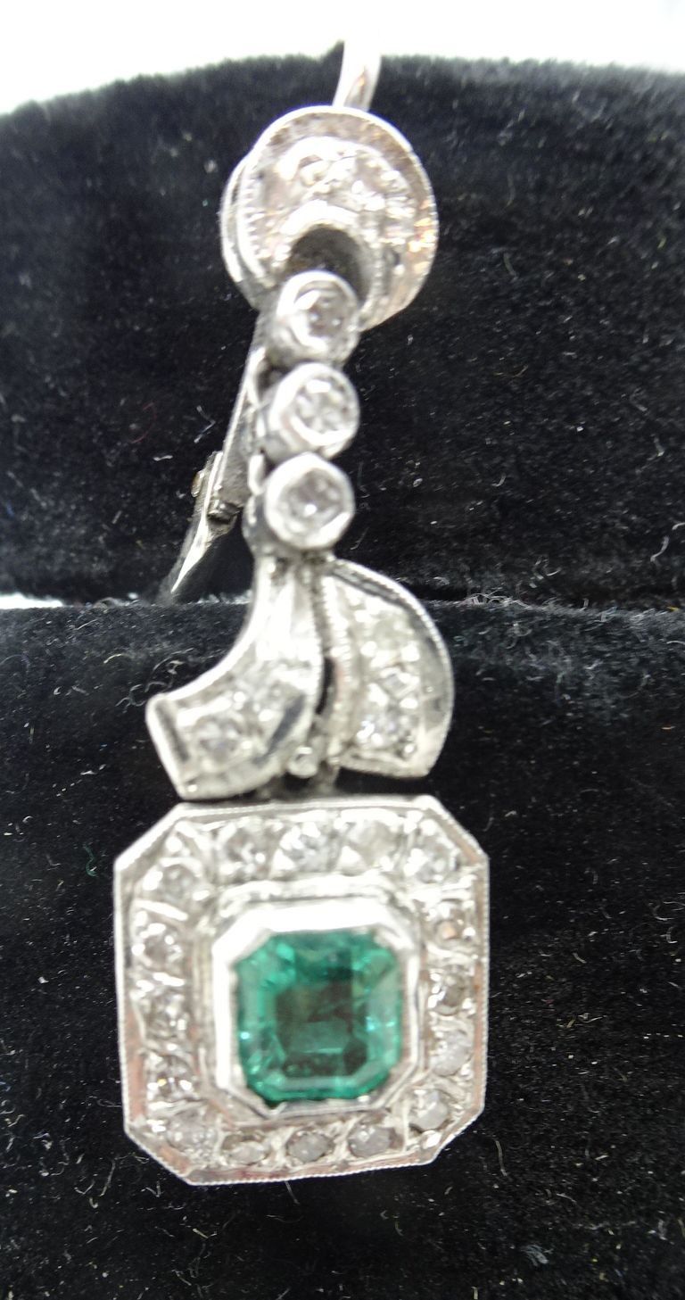 Paire de pendants d'oreilles en or (10 carats) ornées de pierres blanches et verts. 8,2 g brut