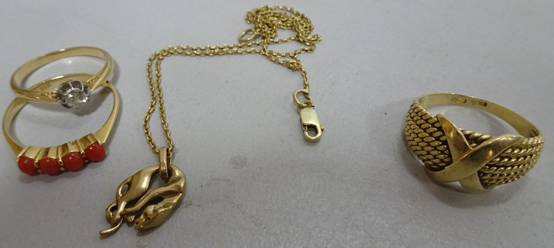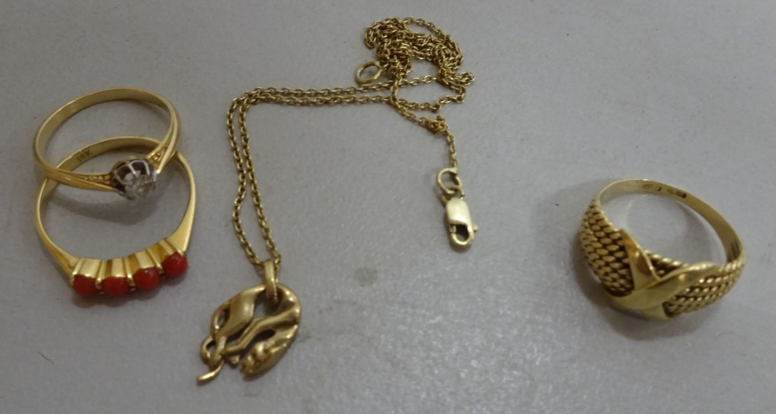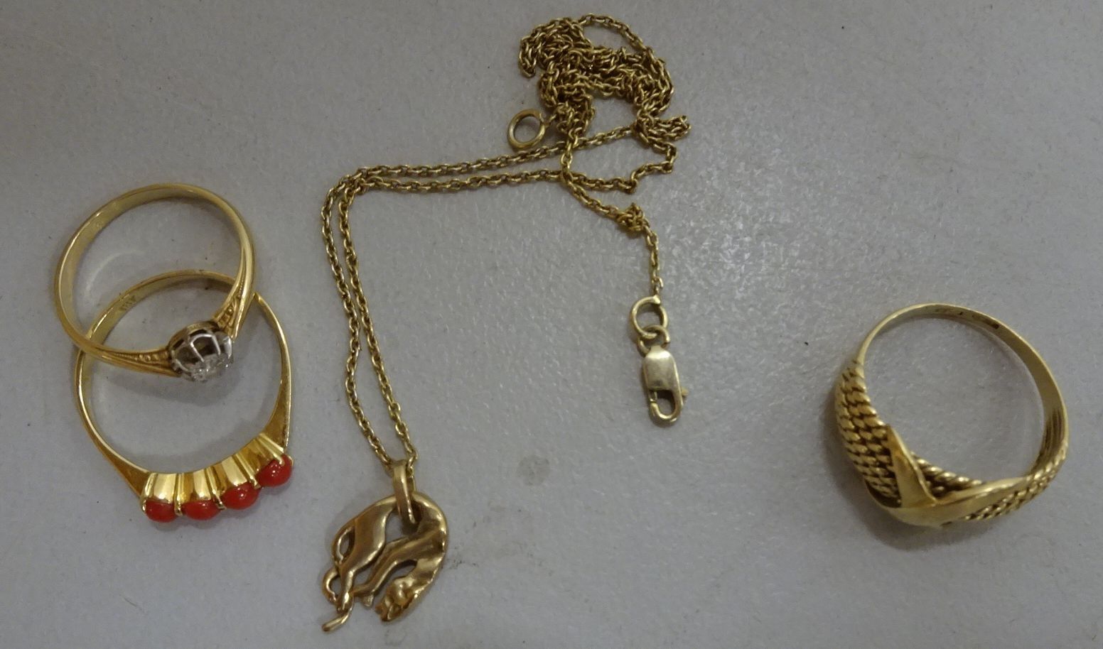 Lot de bijoux en or : 3 Bagues ornées de corail et diamants taille ancienne + Chaîne et pendentif. 13,4 g brut