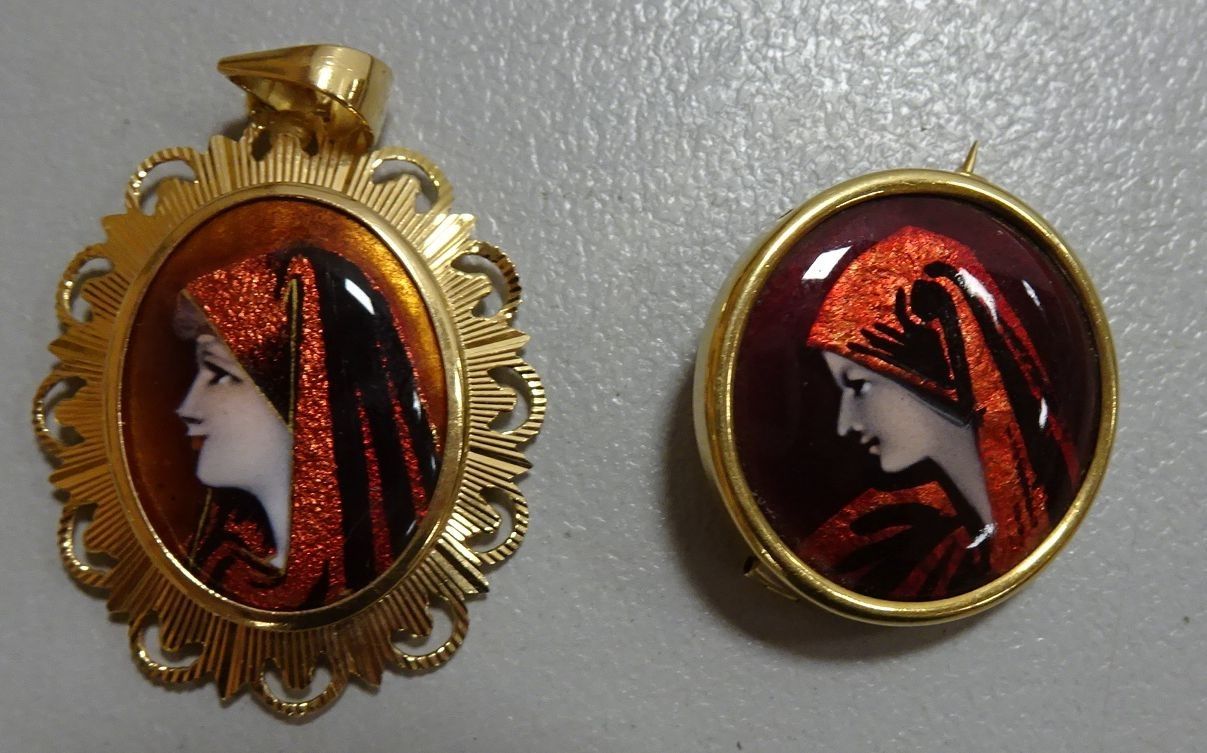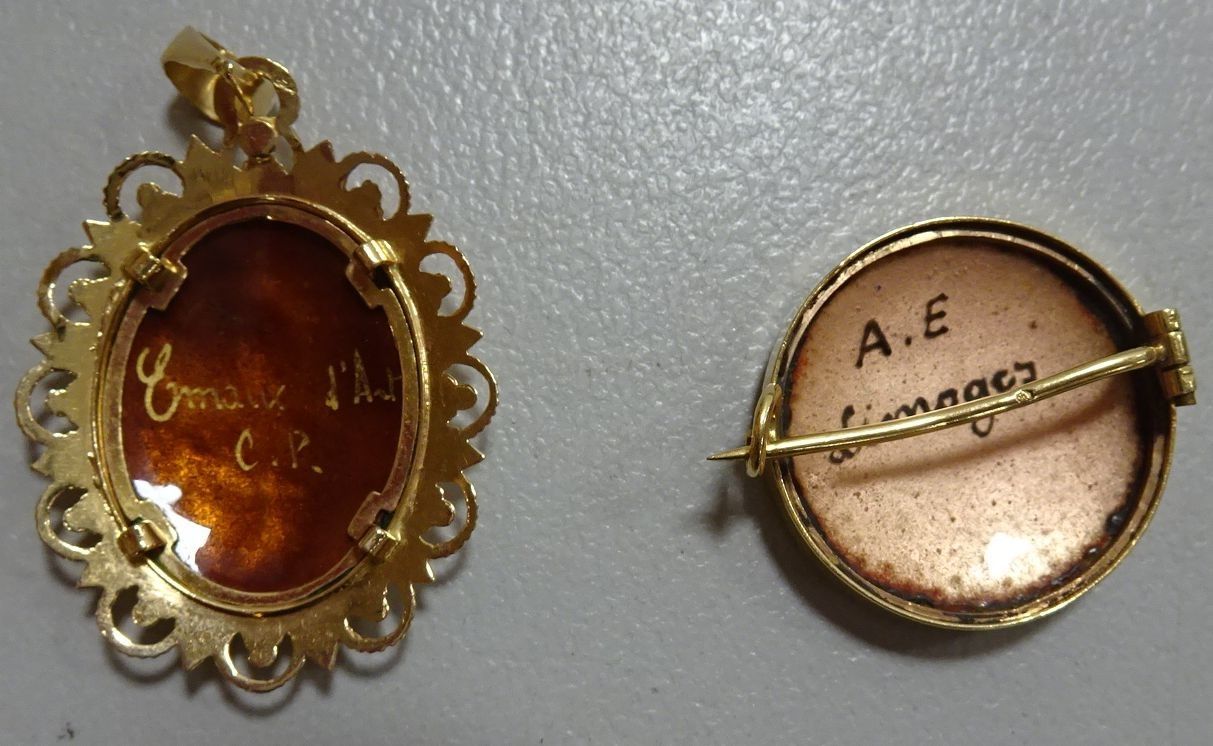 Broche. Diam 21 mm + Pendentif en or orné d'émaux de Limoges…