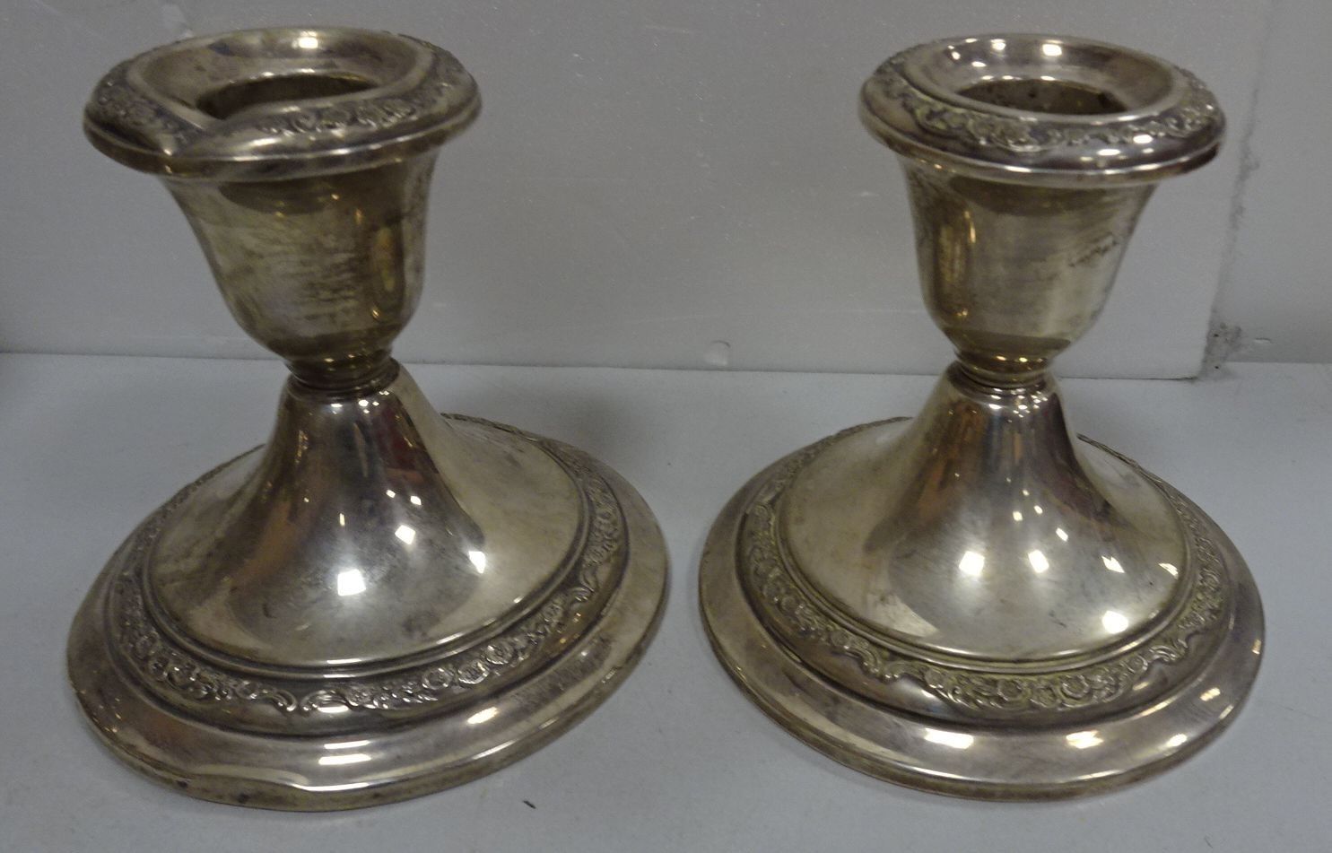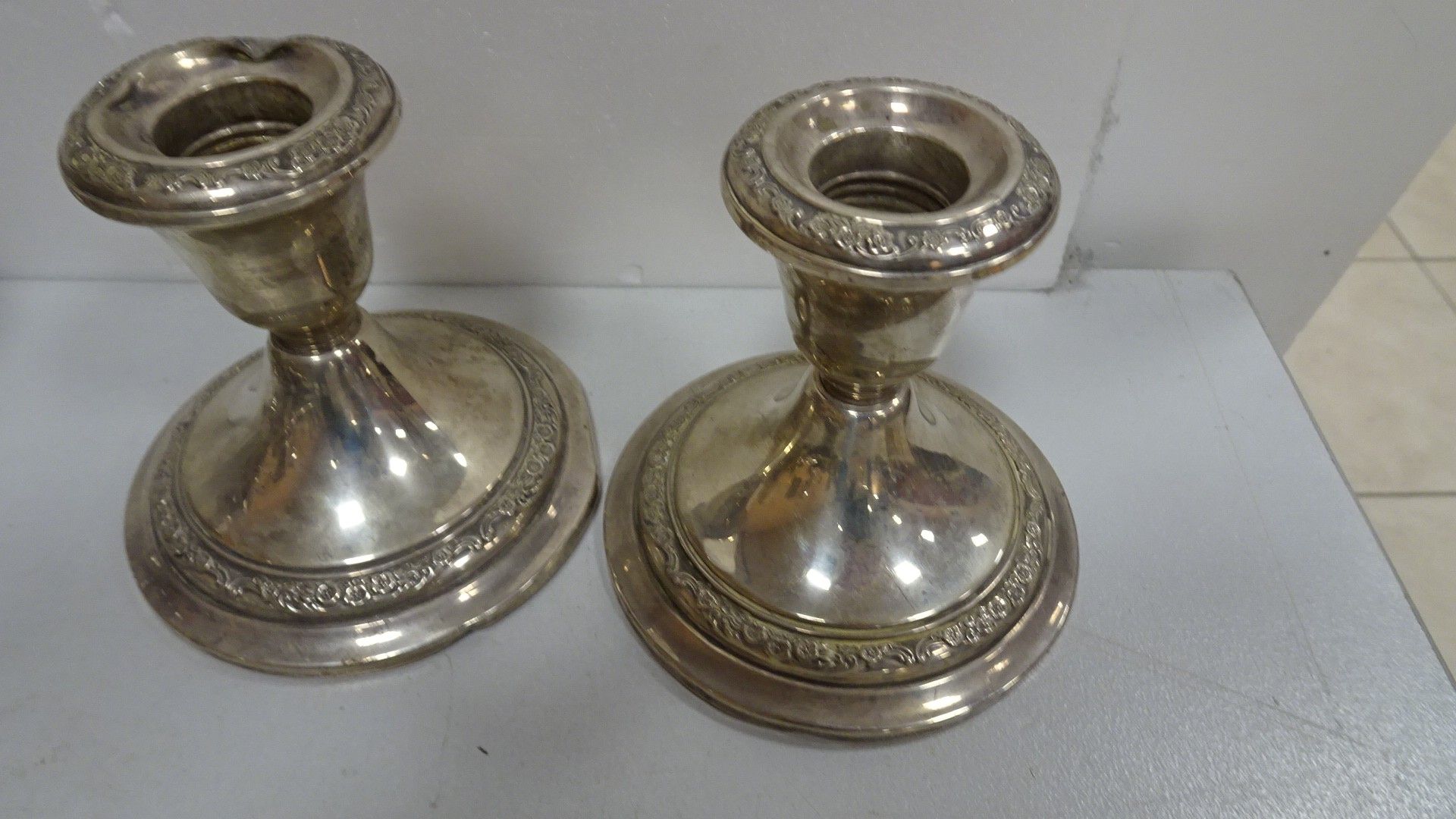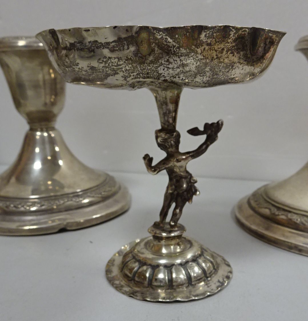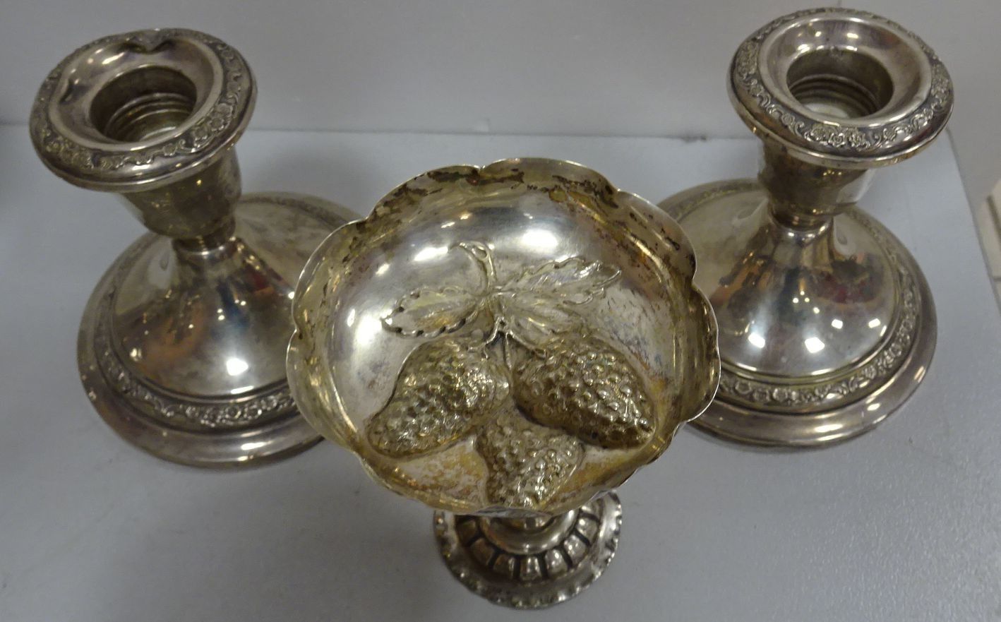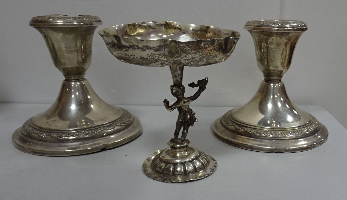 GORHAM. 960. Paire de bougeoirs en argent ornés d'une frise de fleurs. (cabossés) 600 g brut (lestés) + Petite coupe sur pied en argent. 64 g (cabossée)