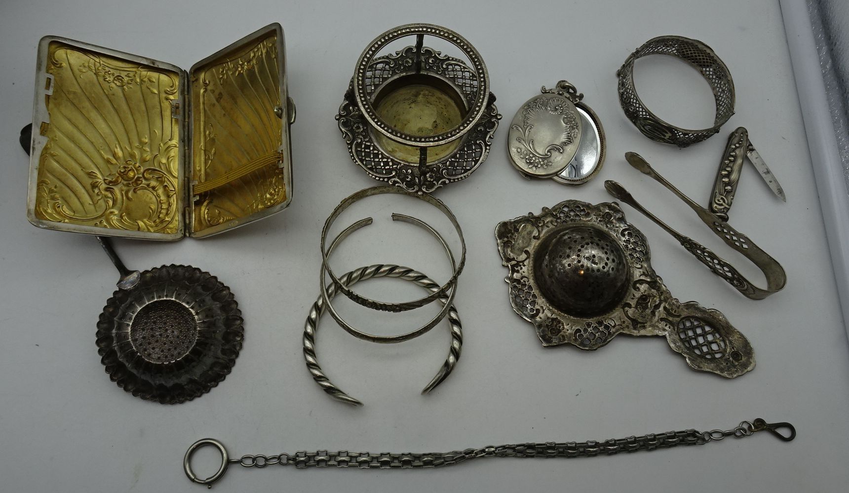 Lot d'objets en argent. Minerve, crabe, bélier et 800 : Passe-thé, bracelets, canif, miroir, monture, chaîne de montre. 299 g brut + Saupoudreuse et étui à cigarettes en métal argenté
