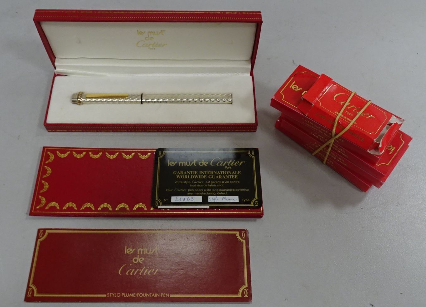 CARTIER. Must. Paris. Stylo-plume Trinity en argent 925. et métal doré. Agrafe rétractable. Dans son écrin. Avec certificat et 4 boîtes de cartouches rouge grenat