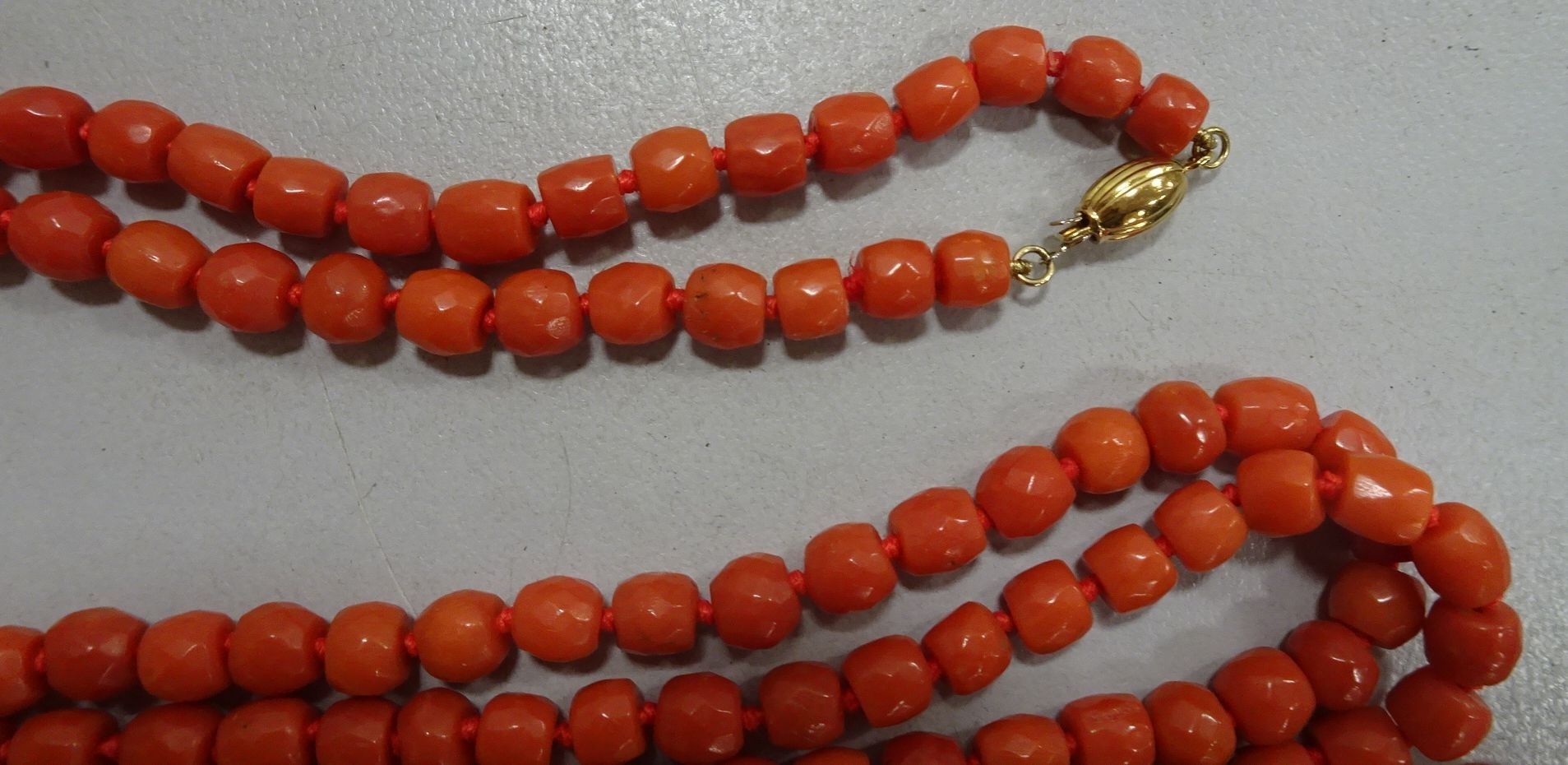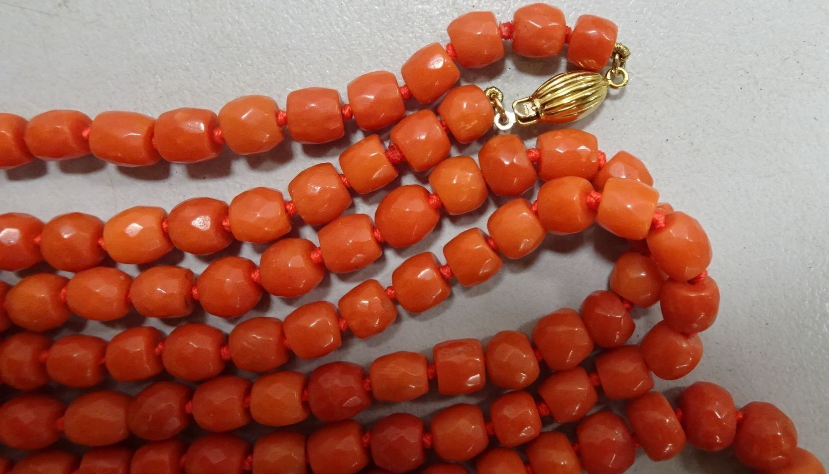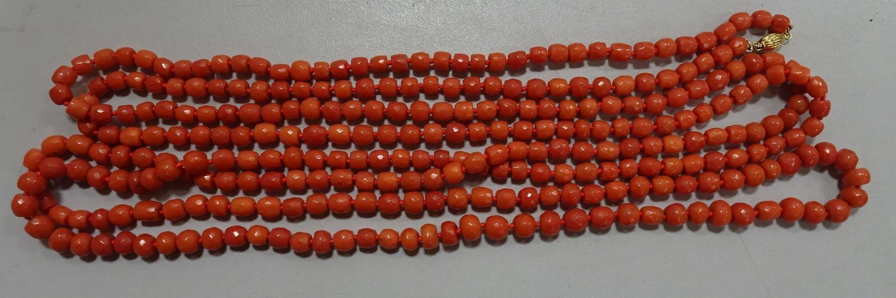 Grand sautoir de 294 perles de corail facetées. Fermoir or. 170 g - Long 230 cm