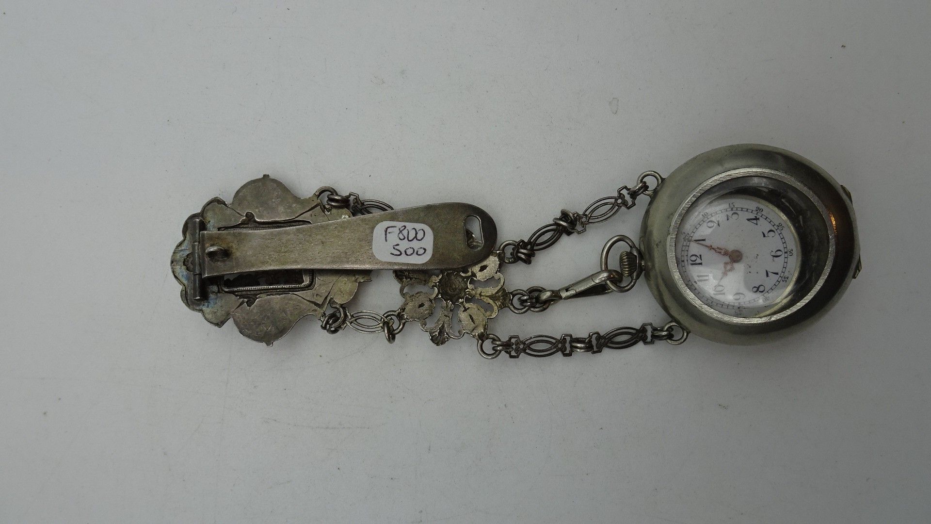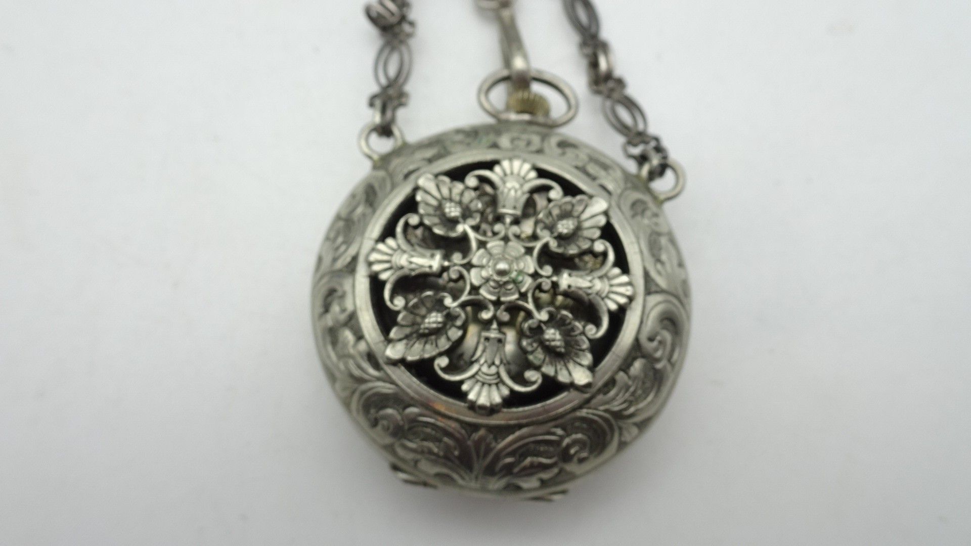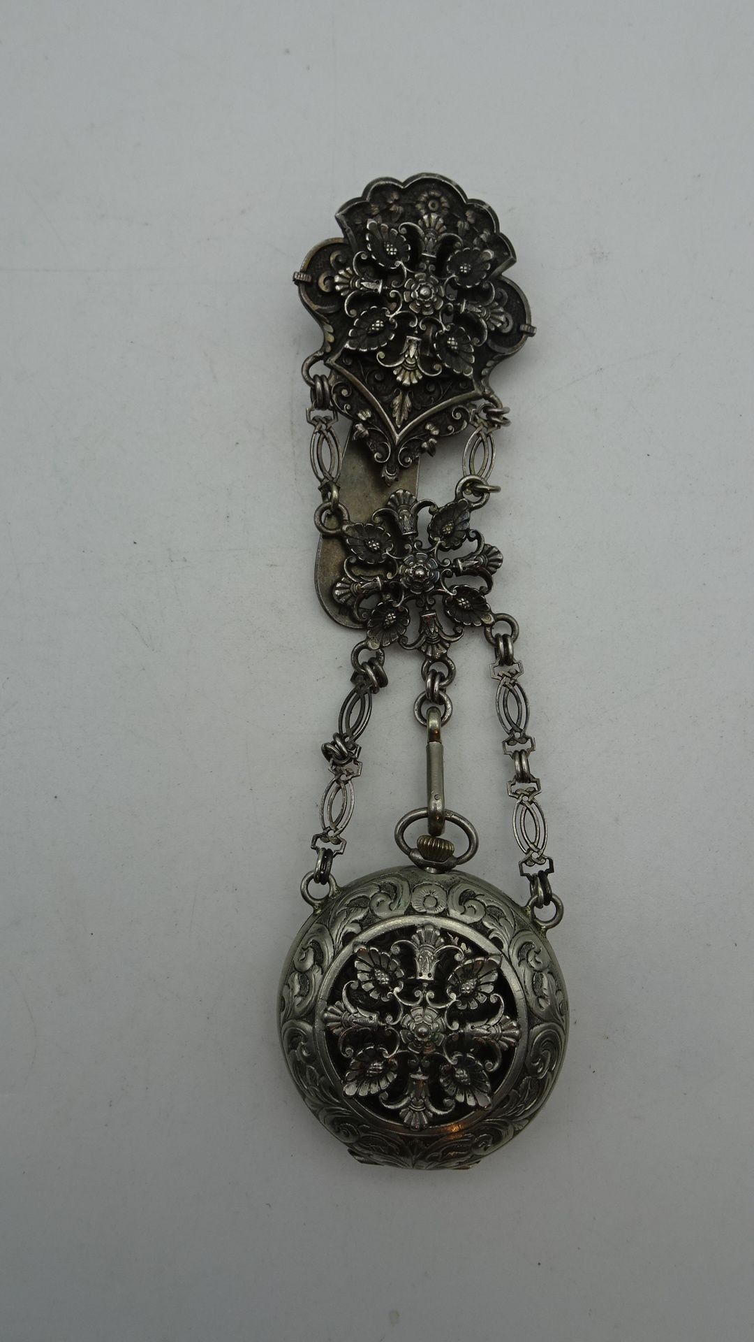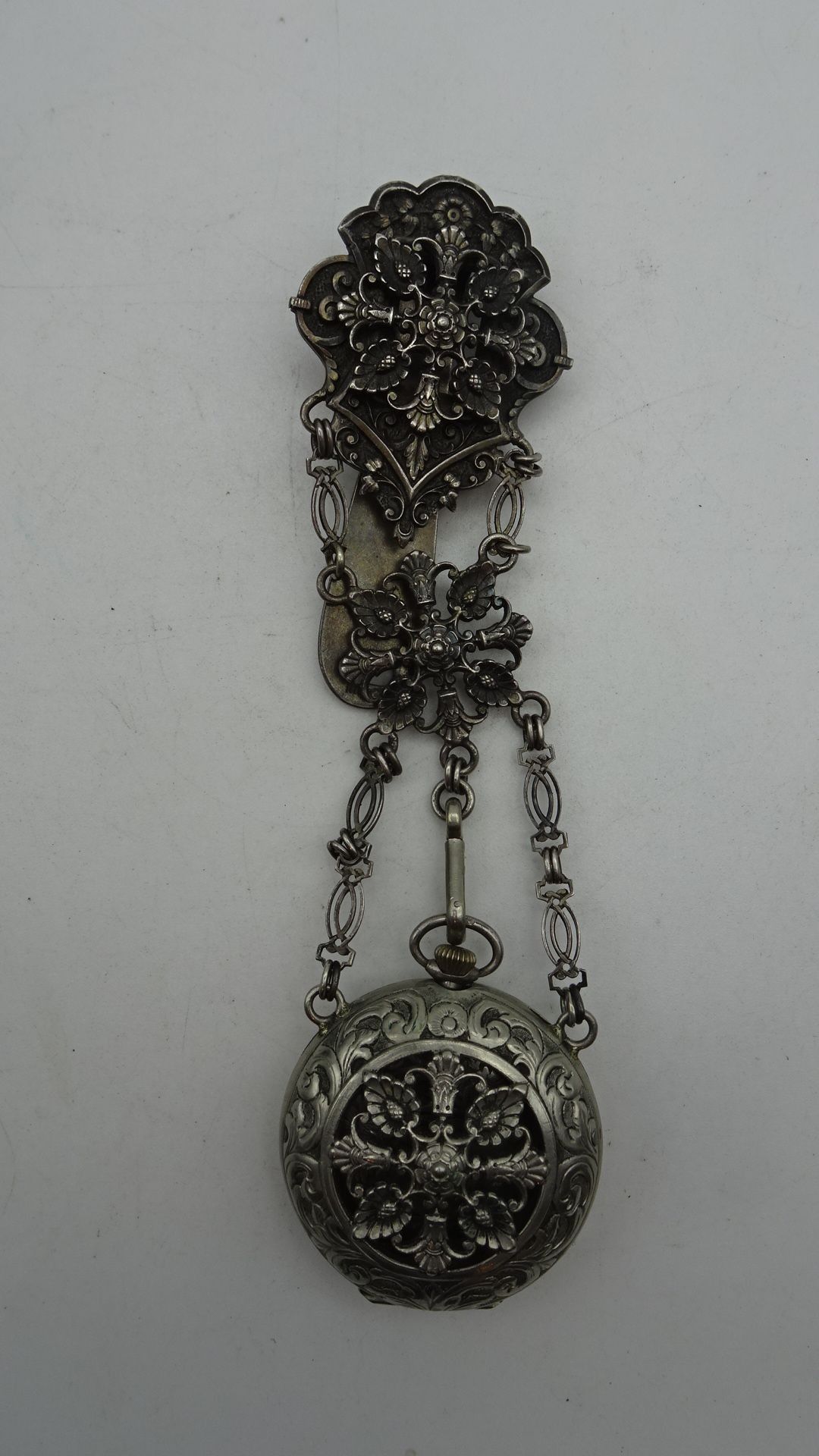 Châtelaine en métal argenté à décor ajouré de fleurs et feuillage et montre de col en argent. Haut 14 cm