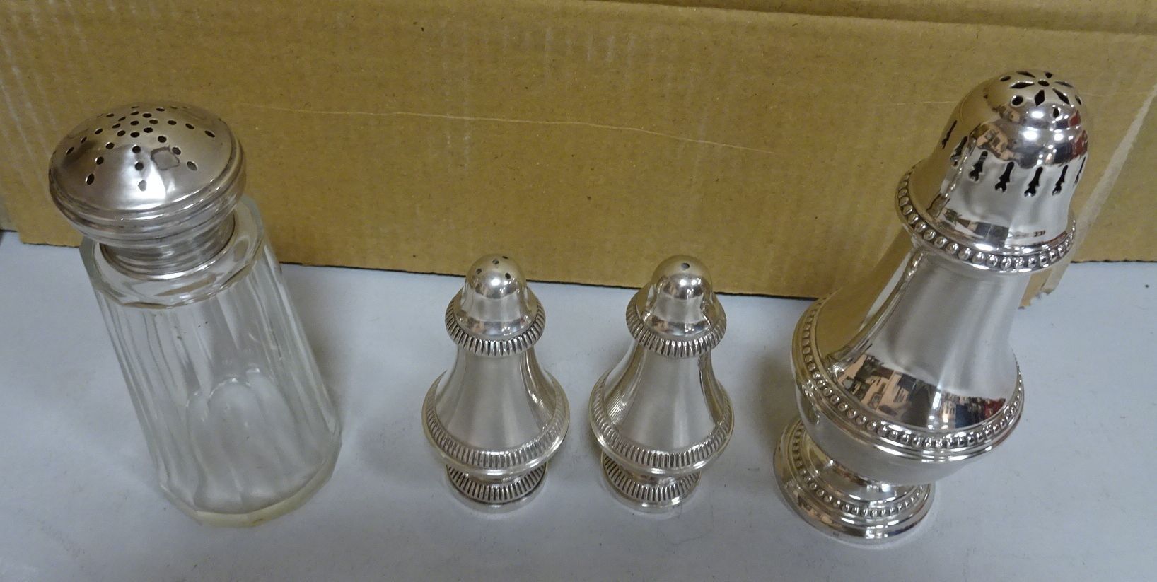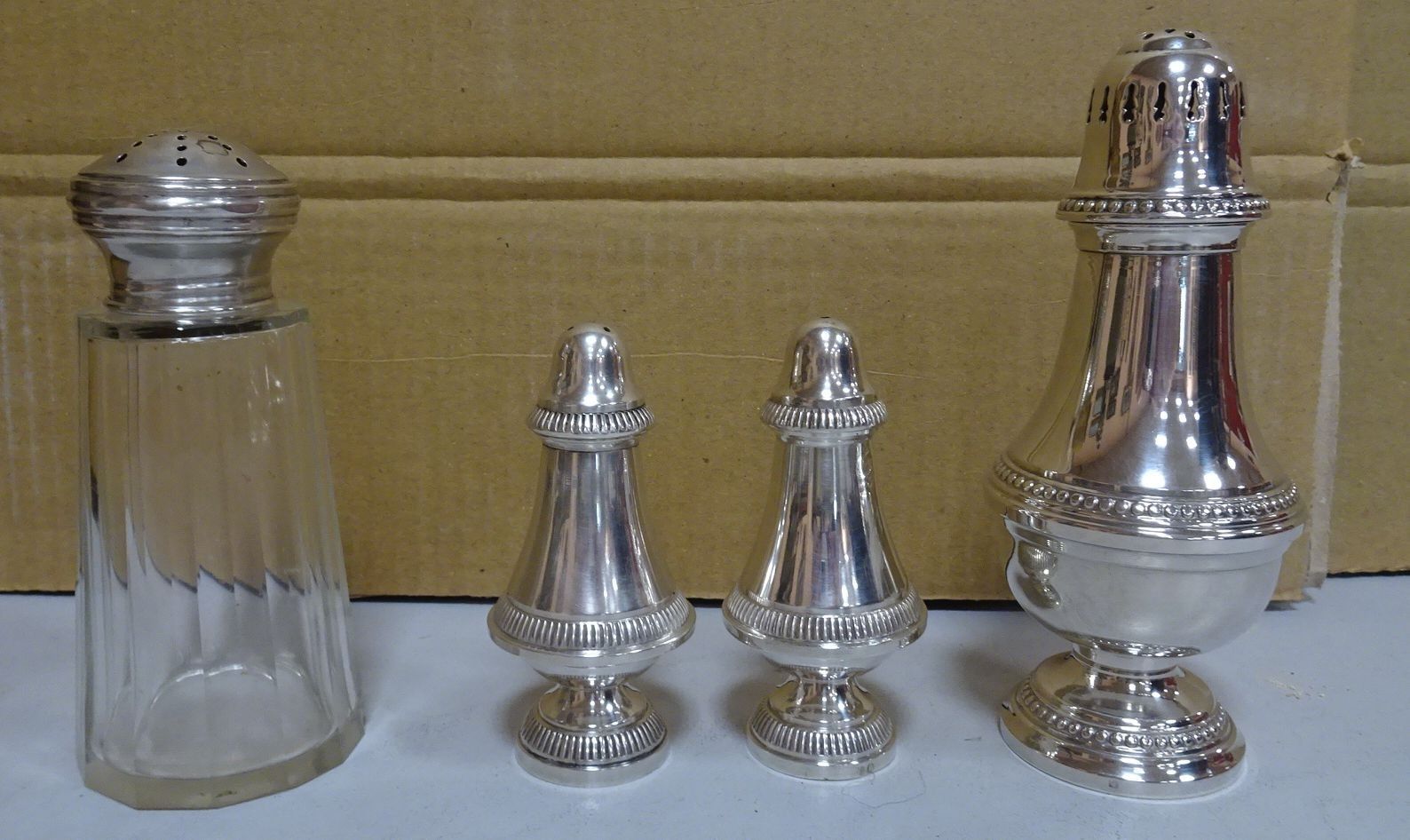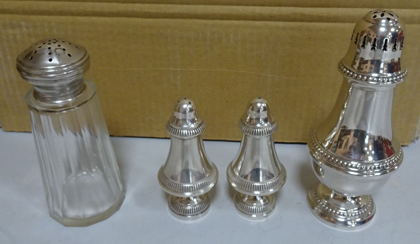 Saupoudreuse, salière et poivrier en métal argenté + Saupoudreuse en cristal cerclé argent