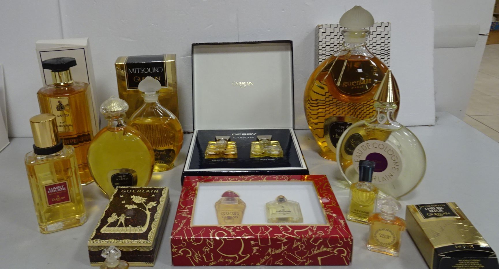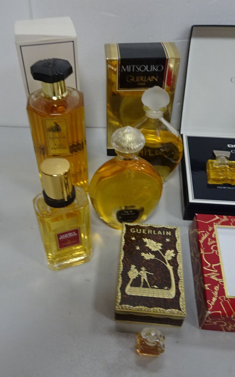 Lot de flacons et échantillons de parfums : Guerlain. Mitsouko, Derby, Chamade, L'heure bleue et Lanvin. Arpège