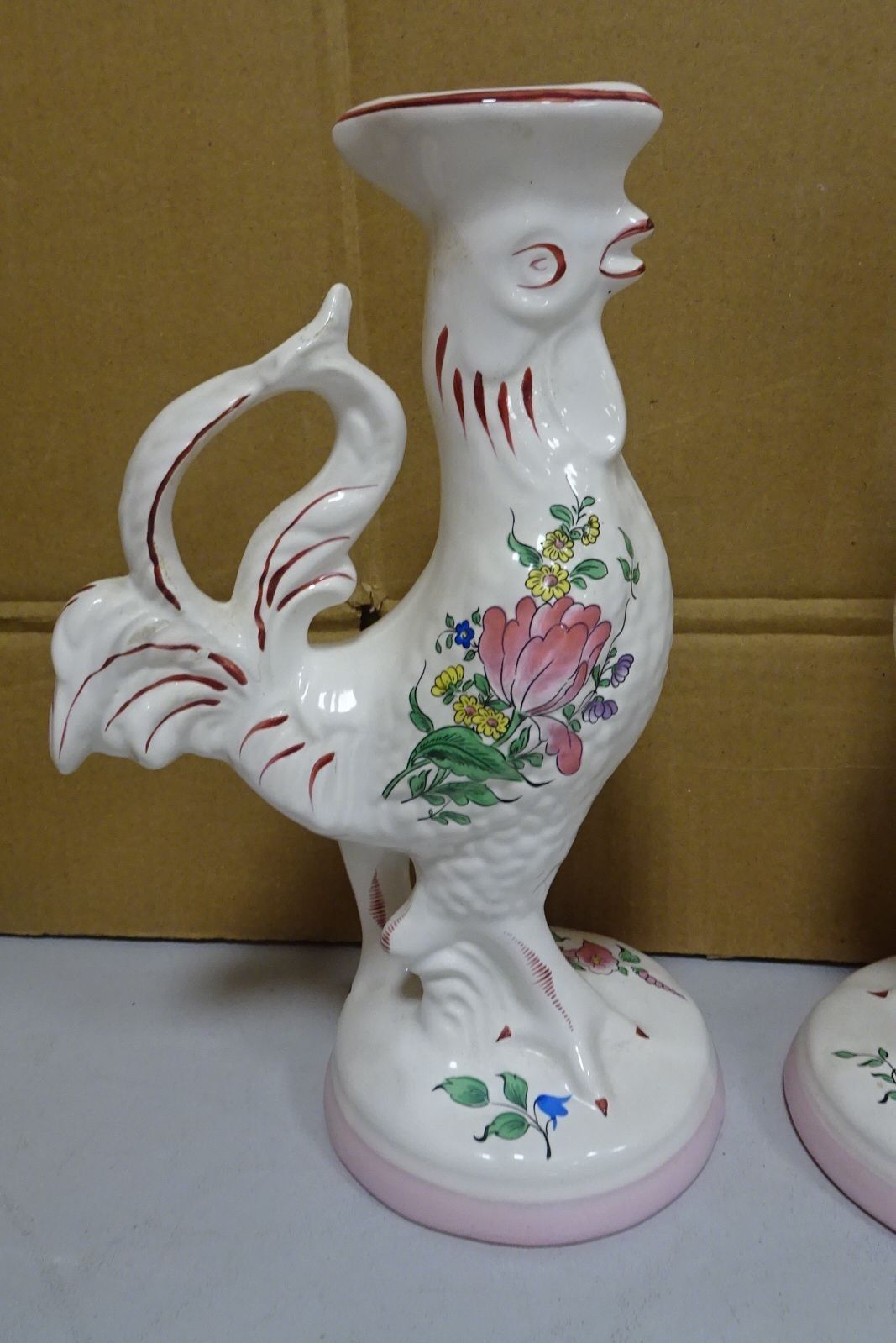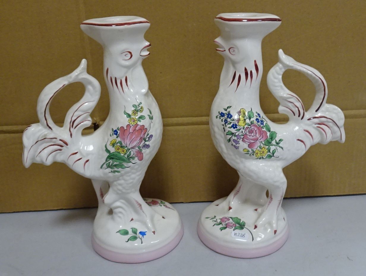 KELLER et GUERIN. Lunéville. Paire de flambeaux en forme de coq en faïence à décor de fleurs. Marqués Lunéville. Haut 26 cm