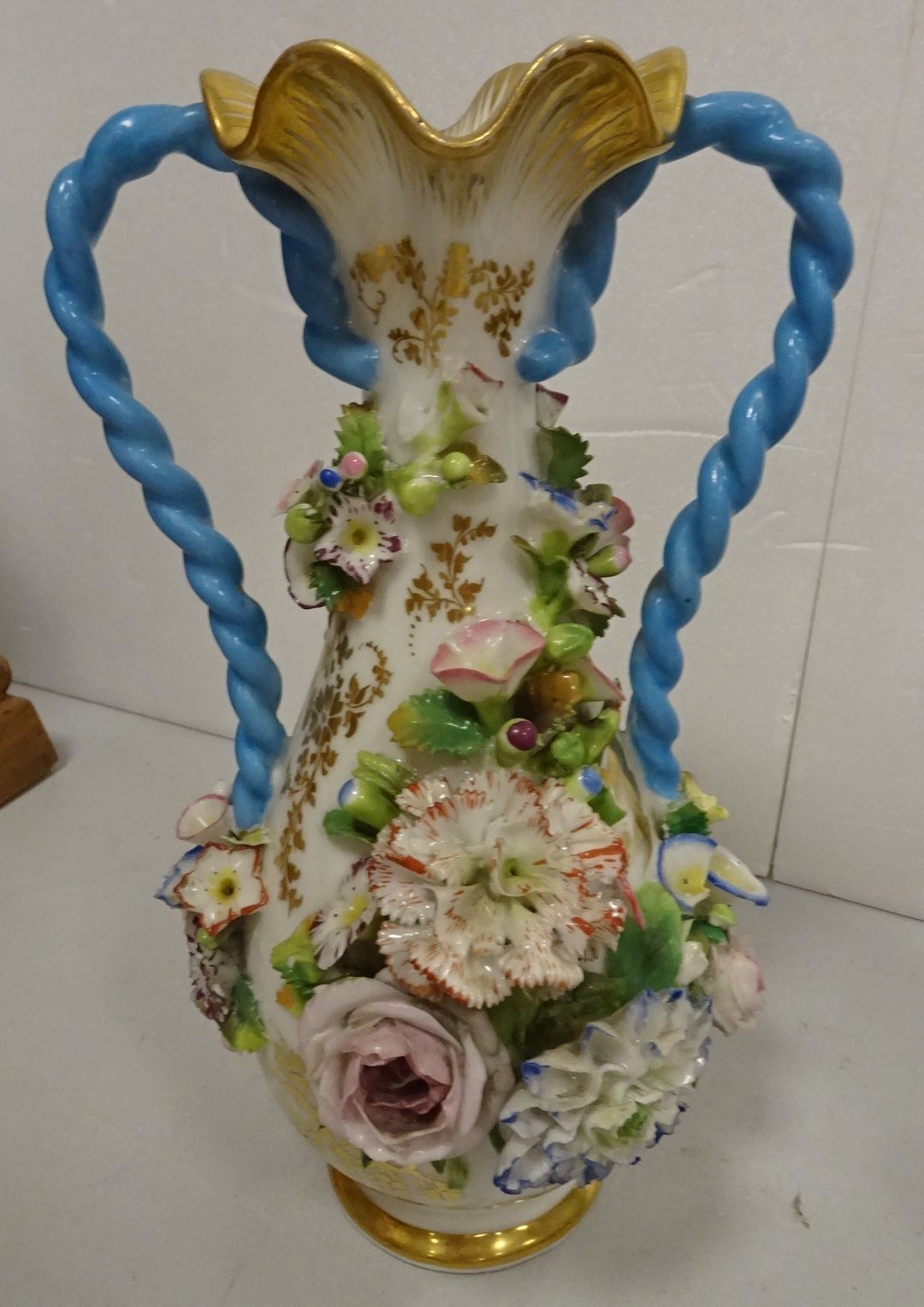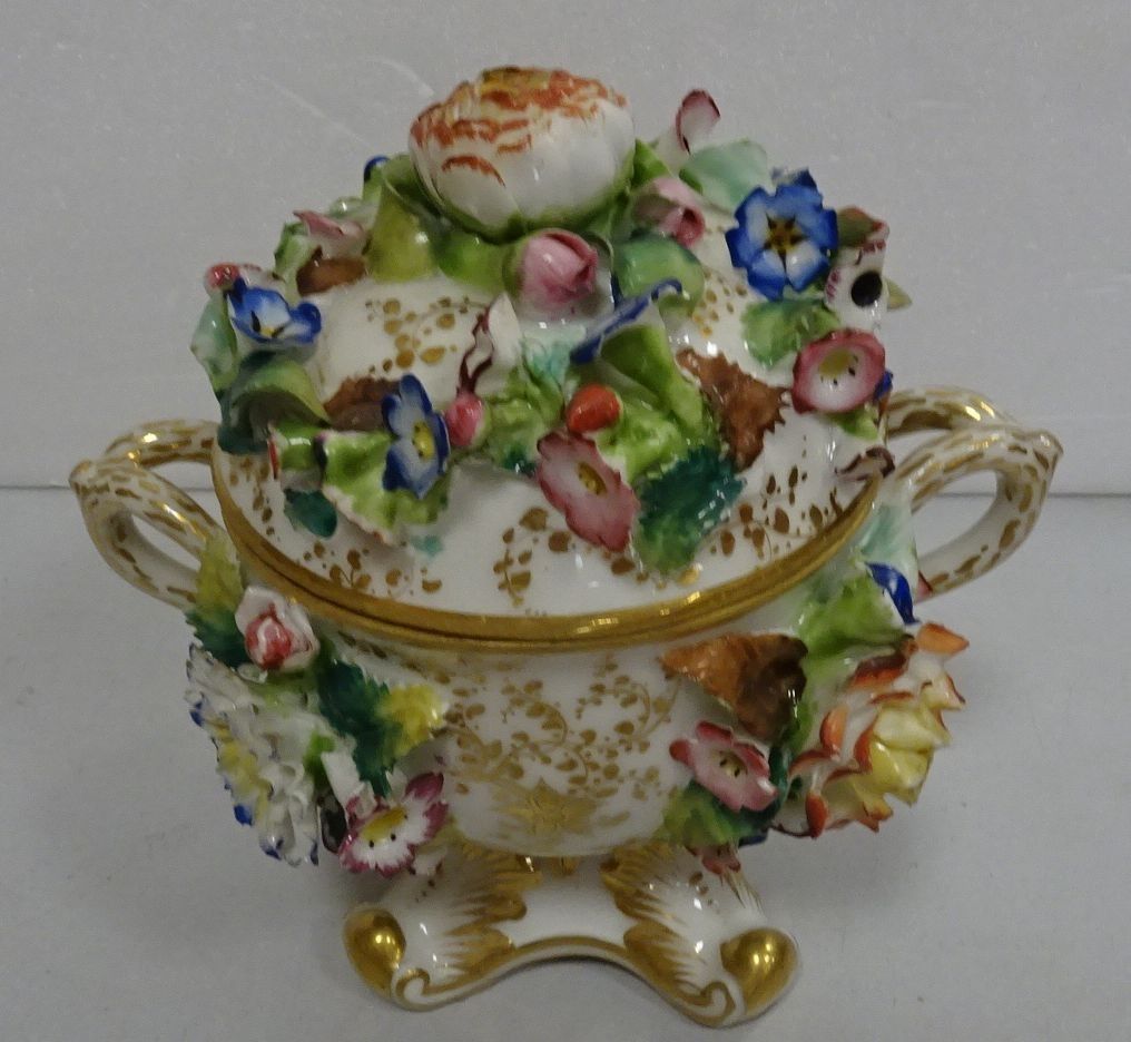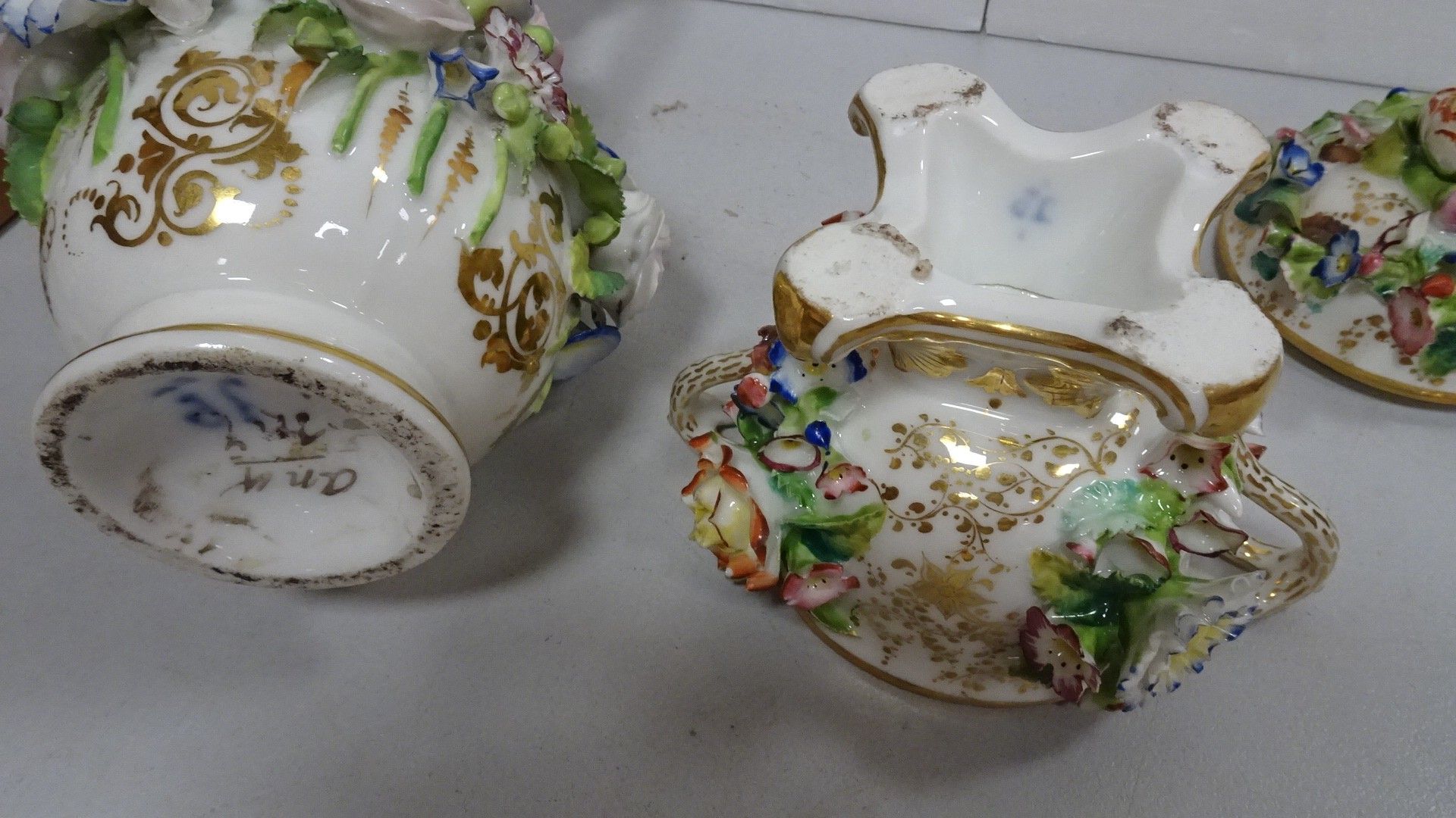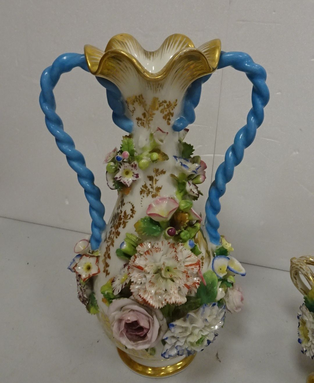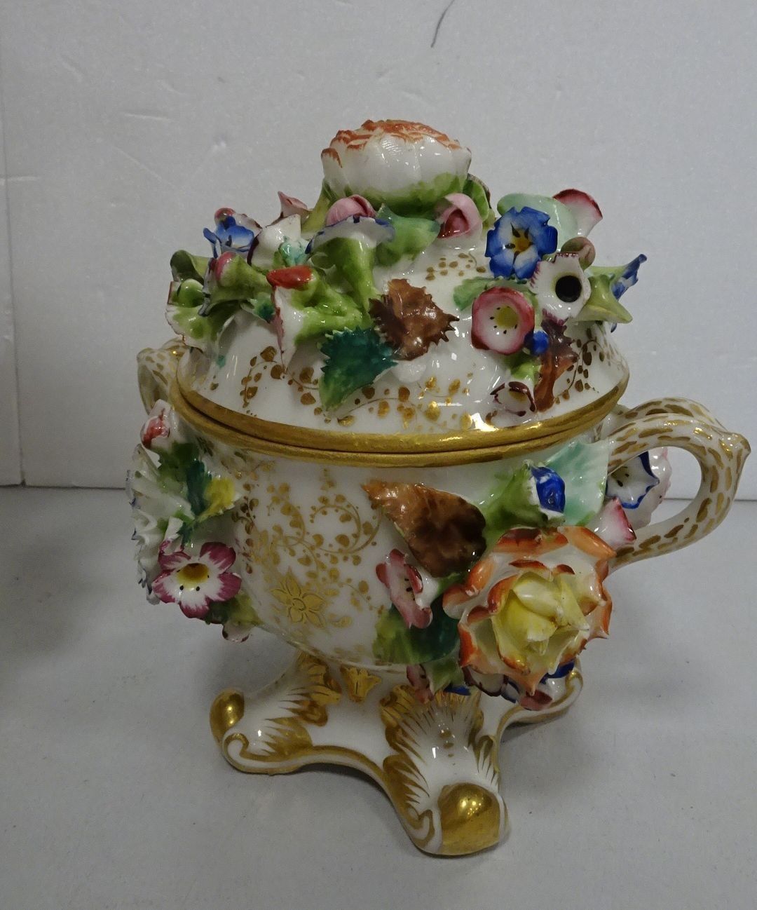 Pot couvert et vase en porcelaine polychrome à décor de fleurs en relief. Signés Jacob PETIT. Haut 21 cm (acc. et manques)