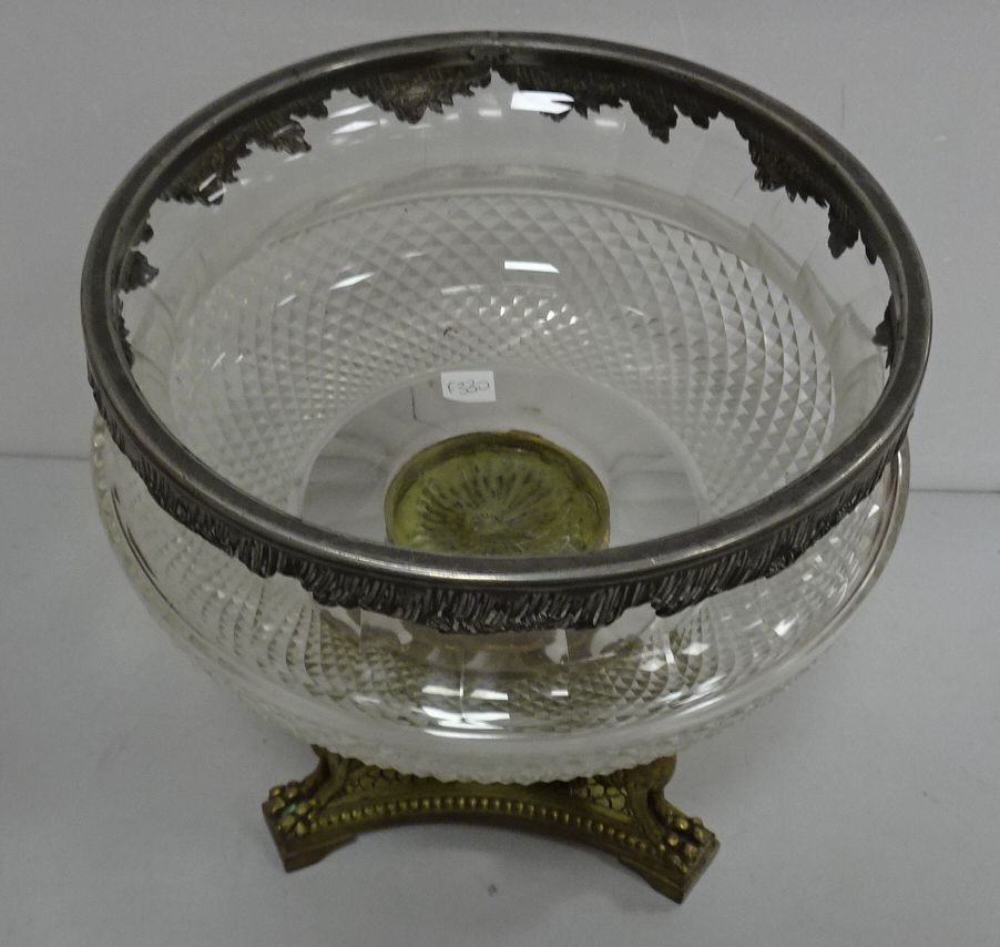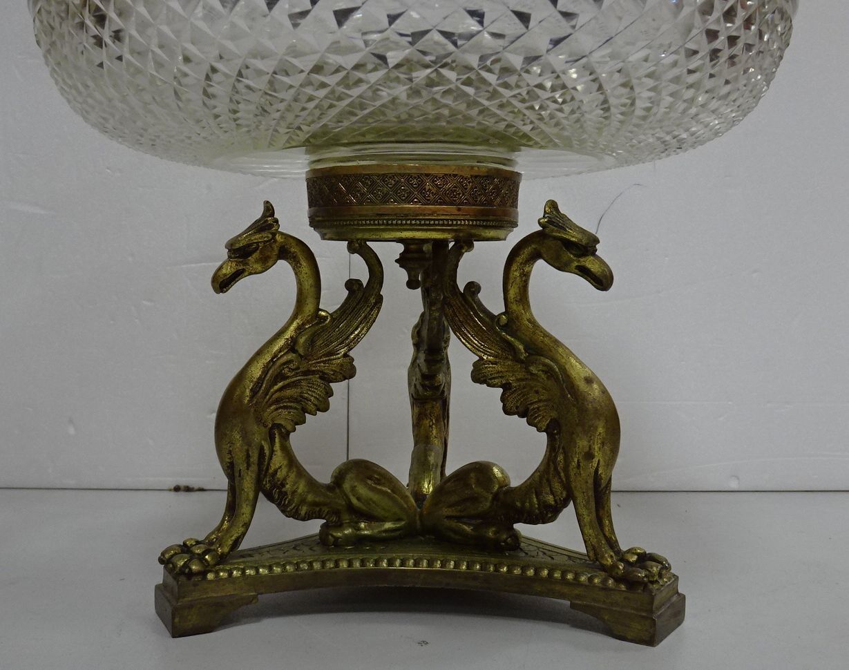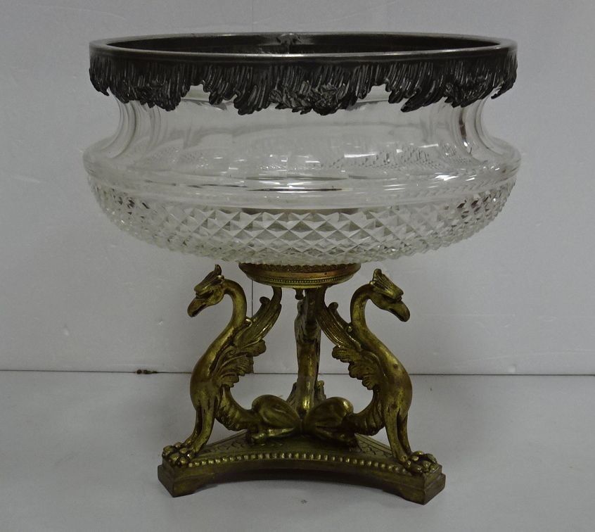 Coupe en cristal taillé cerclé métal. Piédouche en métal doré à décor de dragons (acc. sur le bord). XX°. Haut 25 x 22,5 cm