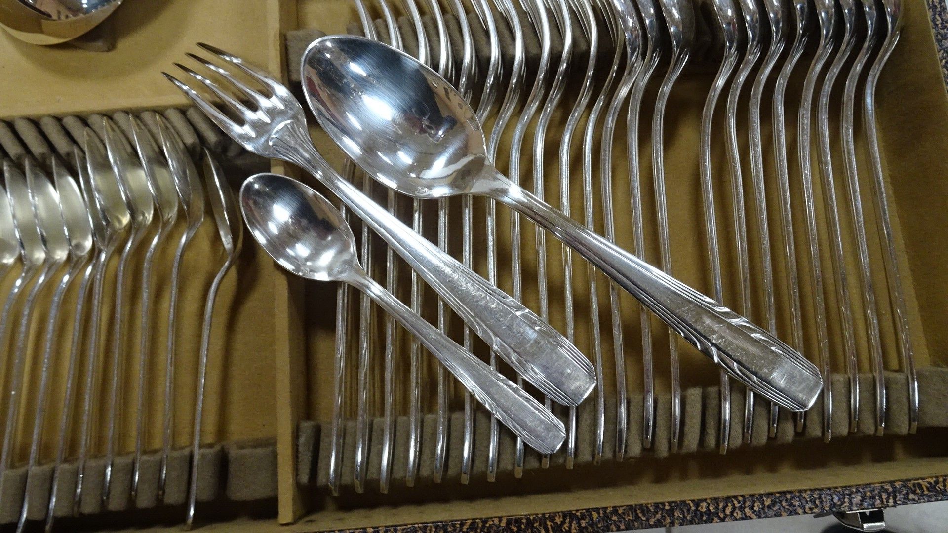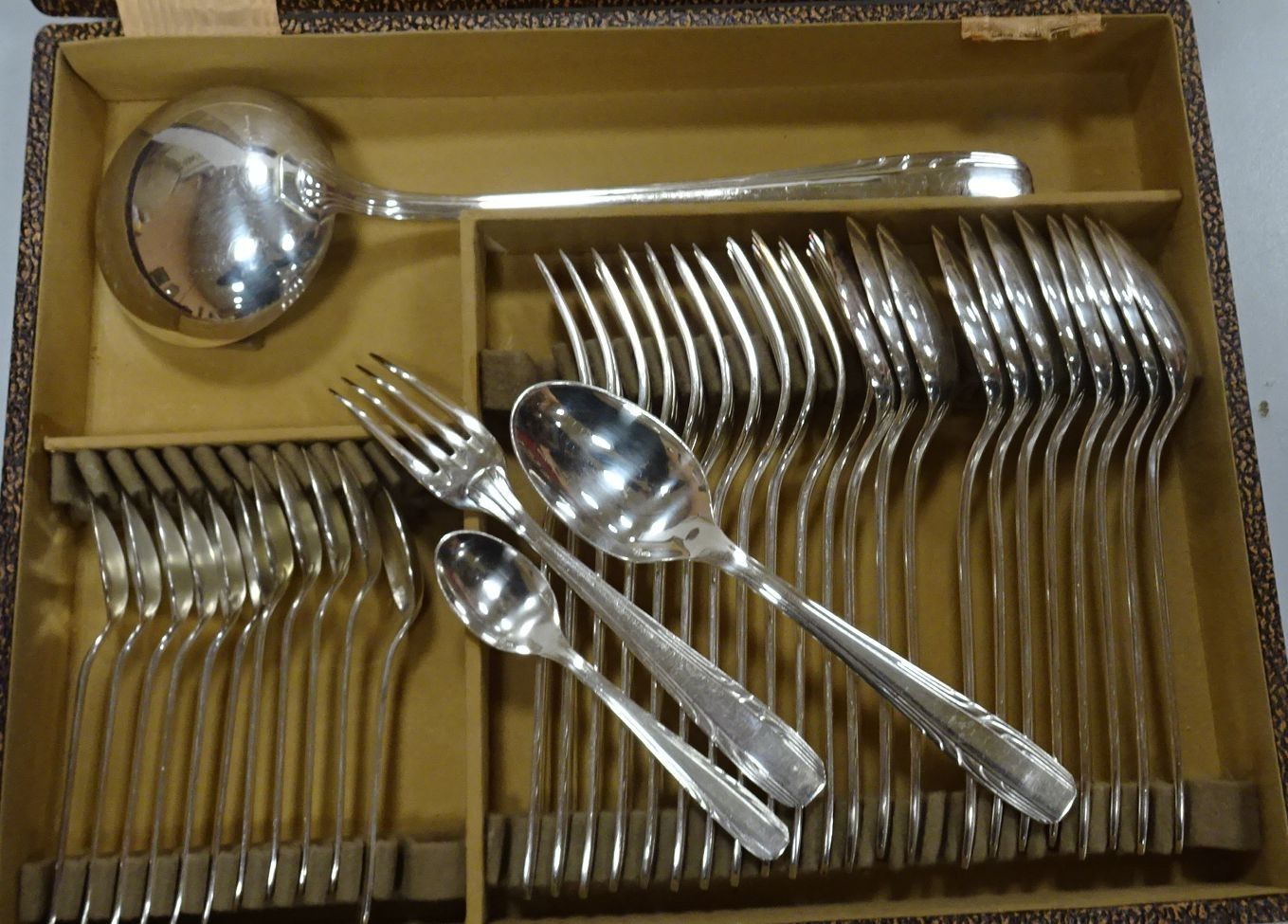 Ménagère en métal argenté à décor de vagues stylisées. Années 40. Dans son écrin