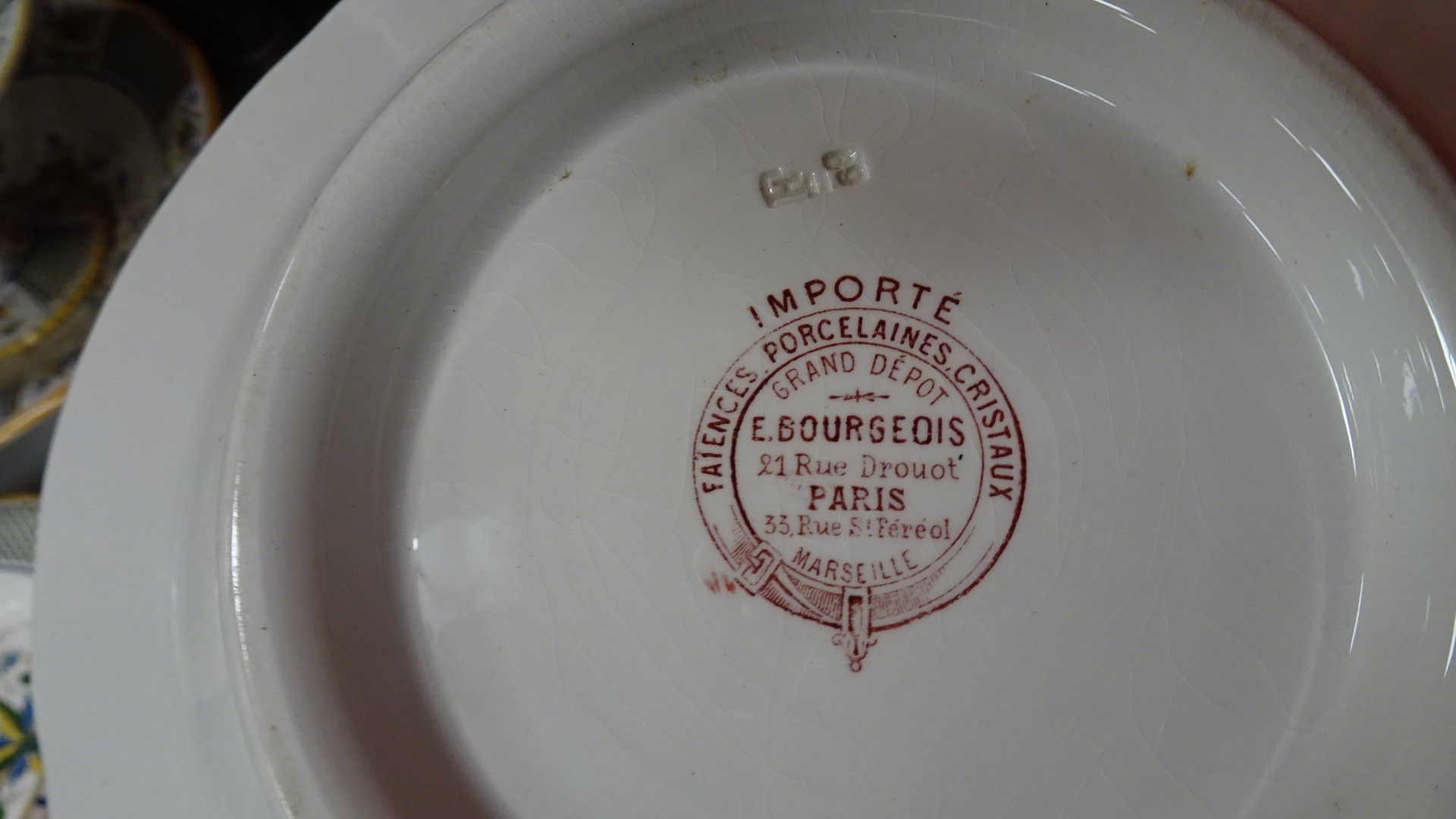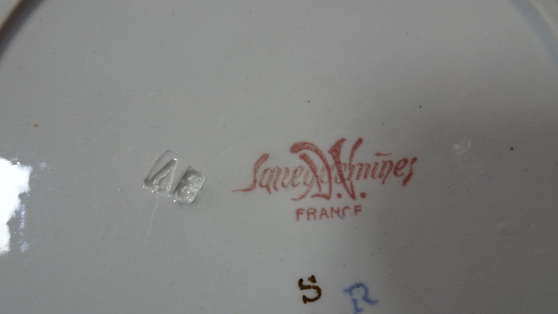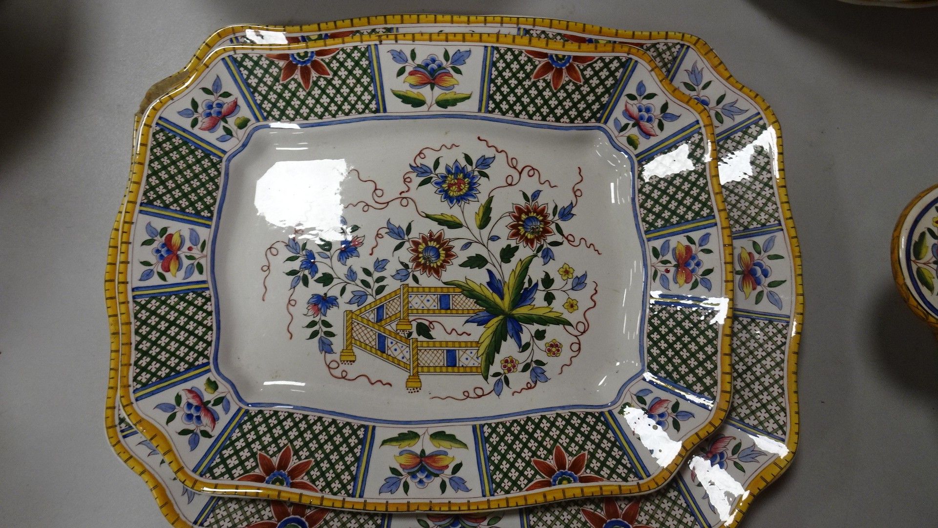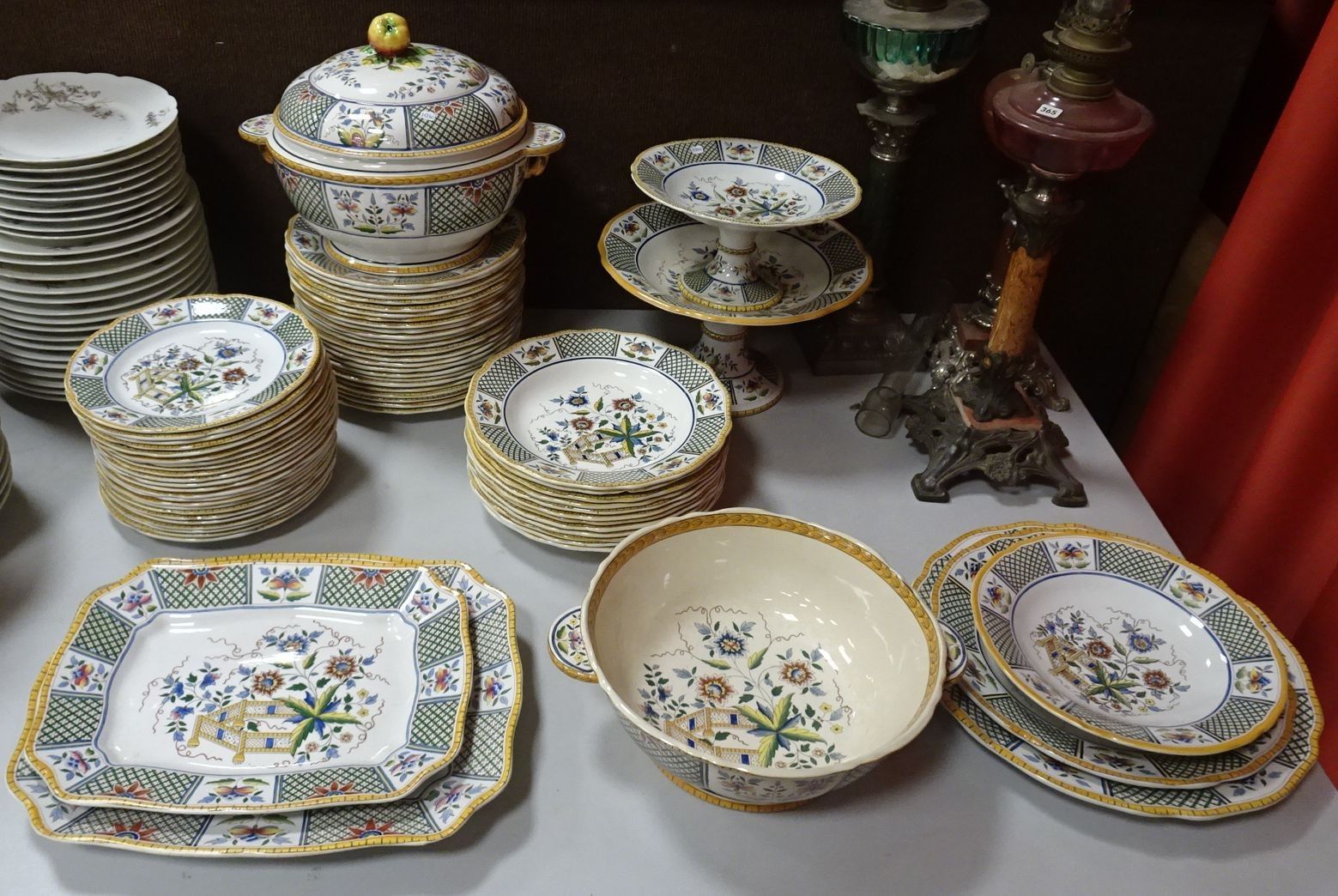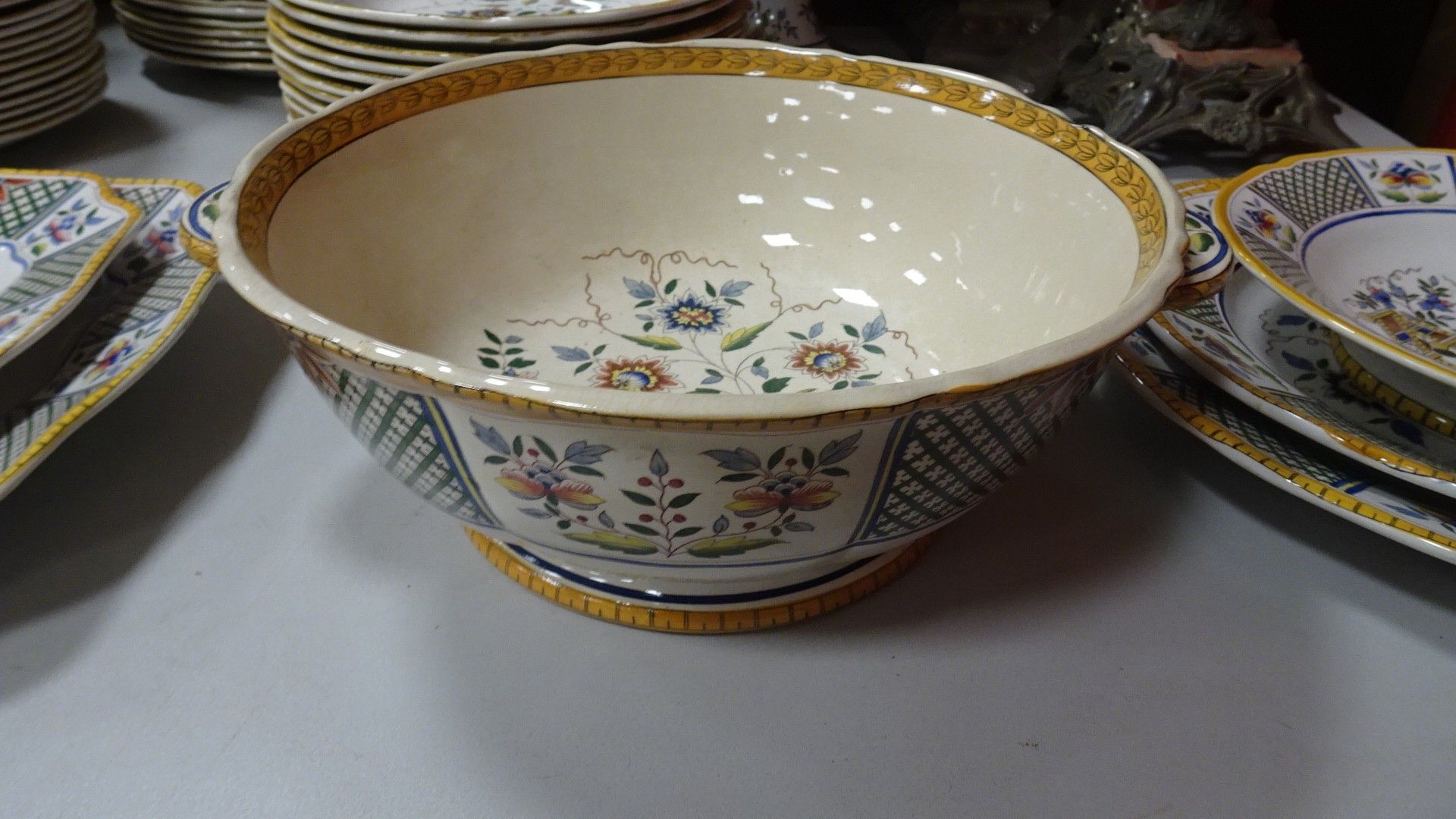 SARREGUEMINES. Modèle MONTMORENCY. Service de table en faïence polychrome comprenant : 24 assiettes plates, 12 creuses, 23 à dessert, 4 plats, 3 coupes, légumier et soupière