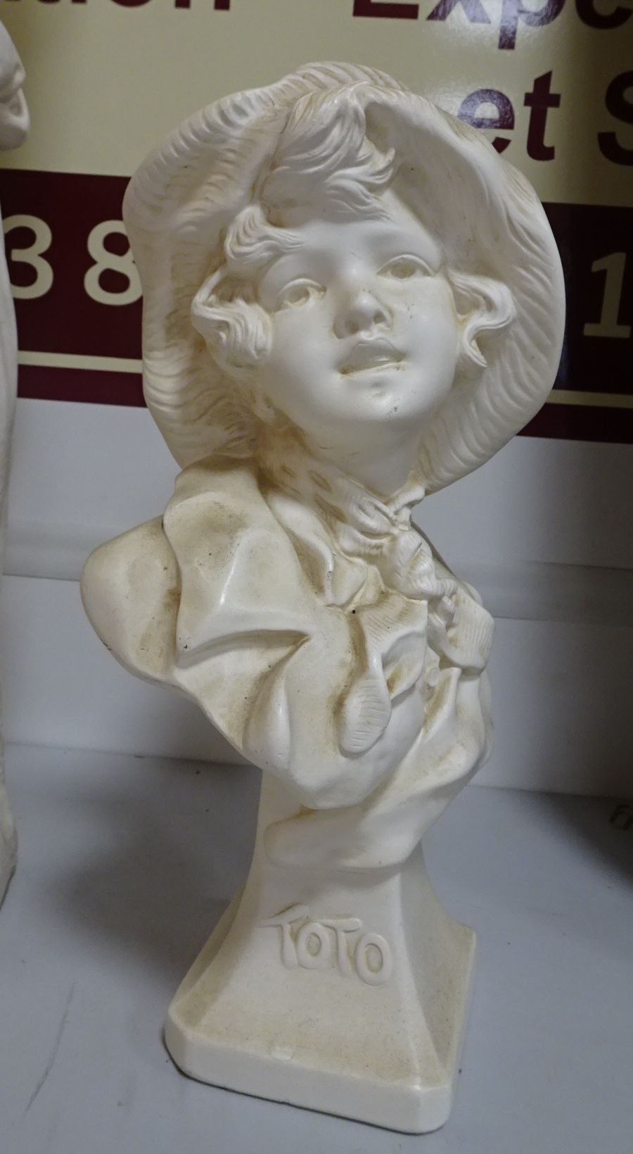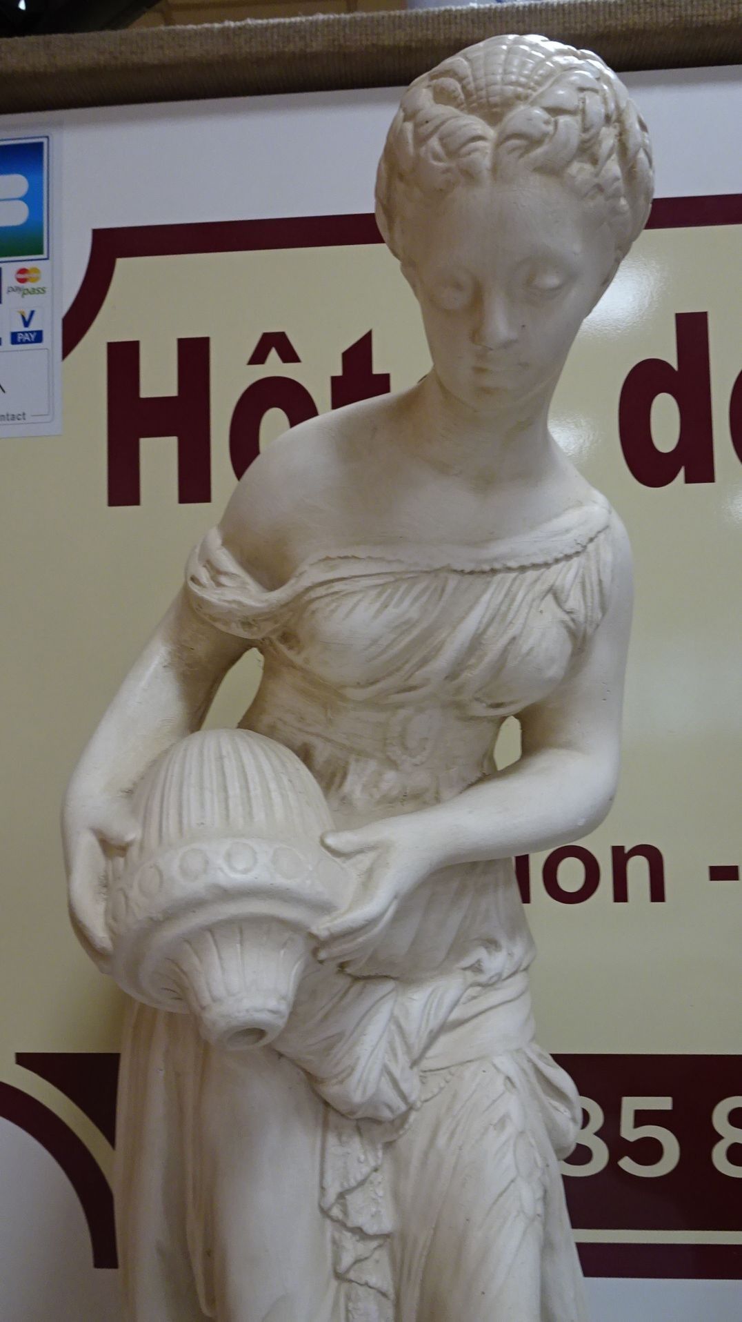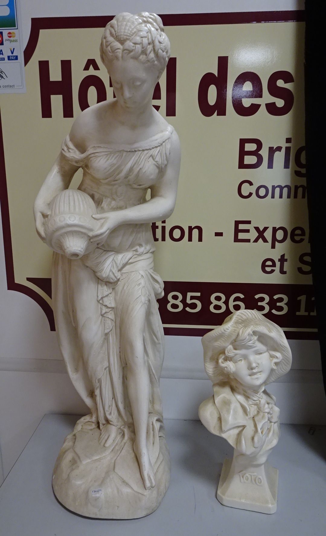 2 Sujets en plâtre. XX° : Femme à la cruche. Haut 83 cm + Buste de fillette