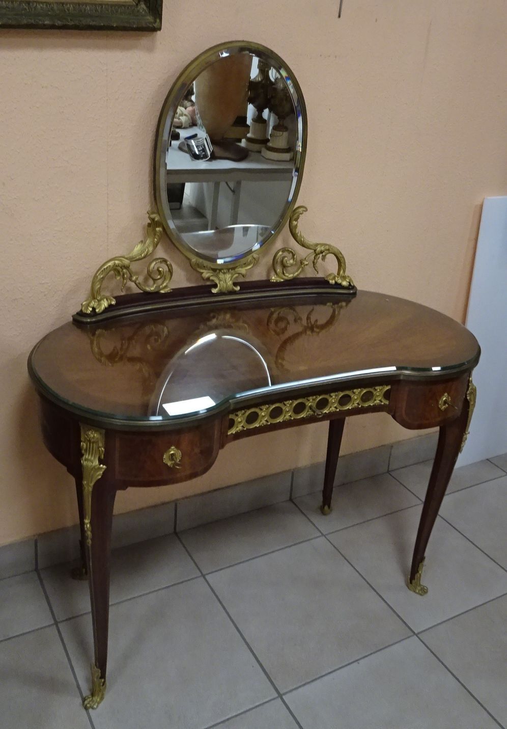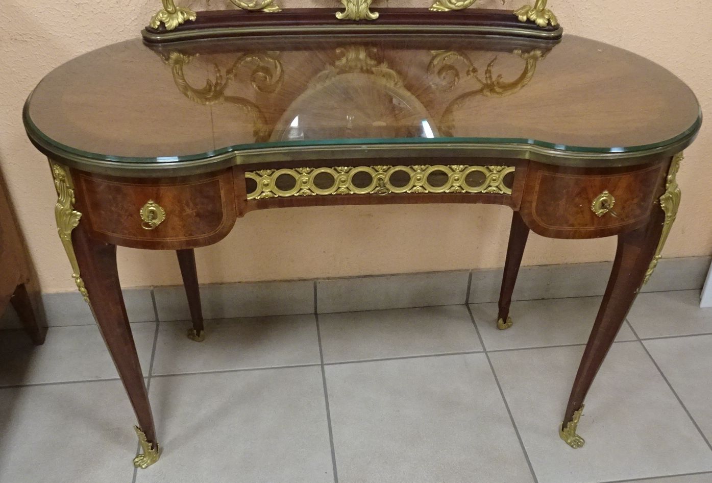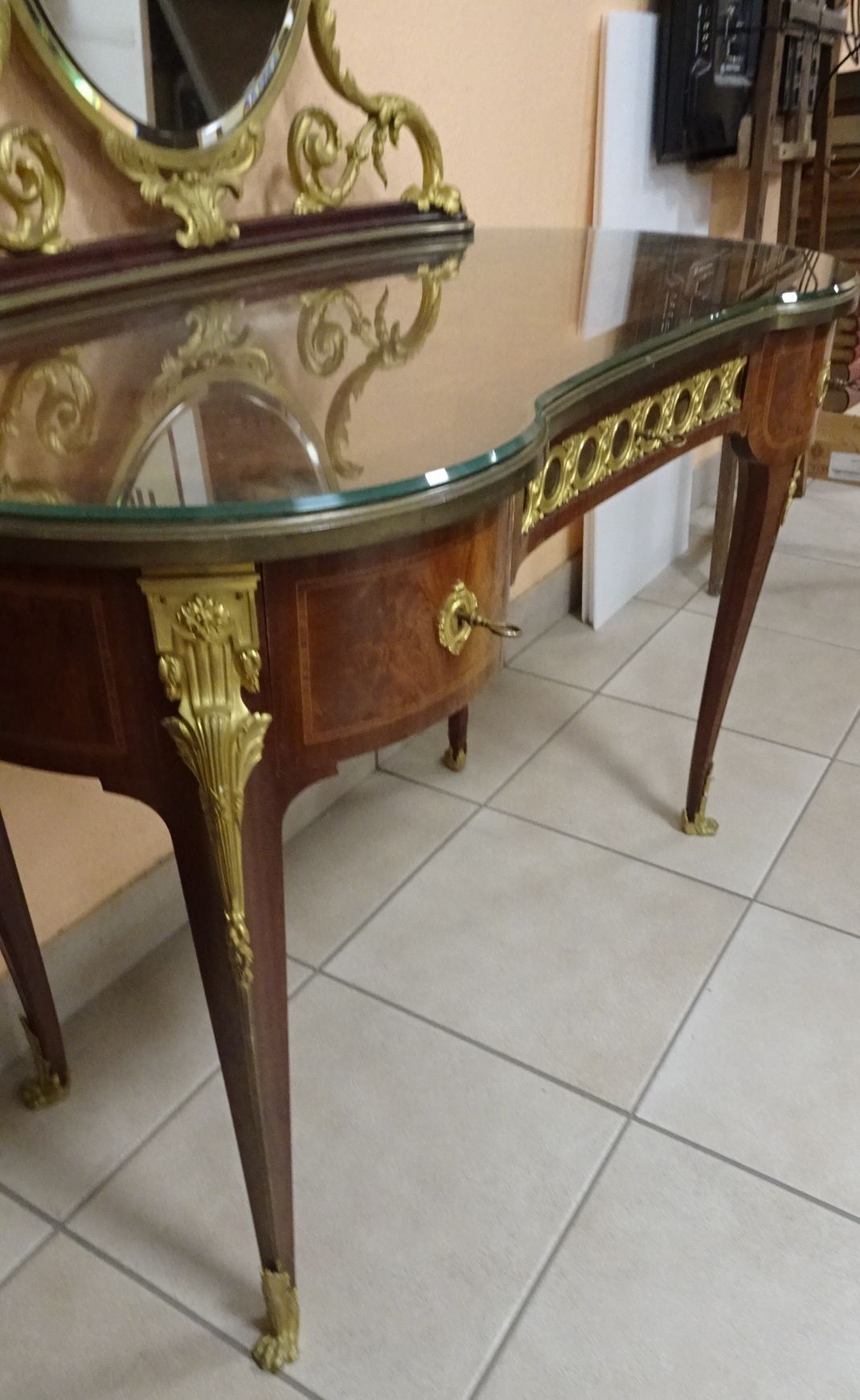 Coiffeuse rognon en bois marqueté et bronze. Elle ouvre à 3 tiroirs en ceinture. Estampillée Charles BERNEL (1889-1956). Paris. 143 x 112 x 57 cm